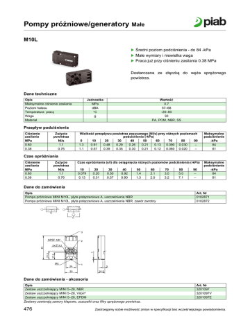 Pompy próżniowe/generatory Małe M10L Średni poziom podciśnienia - do 84 -kPa Małe wymiary i niewielka waga Praca już przy ciśnieniu zasilania 0.38 MPa Dostarczana ze złączką do węża sprężonego powietrza. Dane techniczne Opis Maksymalne ciśnienie zasilania Poziom hałasu Temperatura pracy Waga Materiał Jednostka MPa dBA °C g Wartość 0.7 57–68 -20–80 30 PA, POM, NBR, SS Przepływ podciśnienia Ciśnienie zasilania MPa 0.60 0.38 Zużycie powietrza Nl/s 1.1 0.76 Wielkość przepływu powietrza zasysanego (Nl/s) przy różnych poziomach podciśnienia (-kPa) 0 10 20 30 40 50 60 70 80 90 1.3 0.91 0.48 0.29 0.26 0.21 0.13 0.090 0.030 – 1.1 0.57 0.39 0.35 0.30 0.21 0.12 0.060 0.020 – Maksymalne podciśnienie -kPa 84 81 Czas opróżniania (s/l) dla osiągnięcia różnych poziomów podciśnienia (-kPa) Maksymalne podciśnienie -kPa 84 81 Czas opróżniania Ciśnienie zasilania MPa 0.60 0.38 Zużycie powietrza Nl/s 1.1 0.76 10 0.079 0.13 20 0.20 0.31 30 0.50 0.57 40 0.92 0.90 50 1.4 1.3 60 2.1 2.0 70 3.0 3.2 80 5.0 7.1 90 – – Dane do zamówienia Opis Pompa próżniowa MINI M10L, płyta połączeniowa A, uszczelnienia NBR Pompa próżniowa MINI M10L, płyta połączeniowa A, uszczelnienia NBR, zawór zwrotny Art. Nr 0102871 0102872 Dane do zamówienia - akcesoria Opis Zestaw uszczelniający MINI 5–28, NBR Zestaw uszczelniający MINI 5–28, Viton® Zestaw uszczelniający MINI 5–28, EPDM Zestawy zawierają zawory klapowe, uszczelki oraz filtry sprężonego powietrza. 476 Art. Nr 3201097 3201097V 3201097E Zastrzegamy sobie możliwość zmian w specyfikacji bez wcześniejszego powiadomienia.