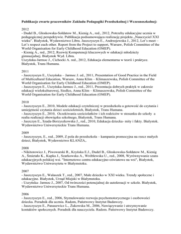 Publikacje zwarte pracowników Zakładu Pedagogiki Przedszkolnej i Wczesnoszkolnej: 2012 - Dudel B., Głoskowska-Sołdatow M., Kienig A., red., 2012, Potrzeby edukacyjne ucznia w pedagogicznej perspektywie. Publikacja podsumowująca realizację projektu „Nauczyciel XXI wieku”. Białystok, Wydawnictwo Libra. Jaszczyszyn E., Andrzejewska J., 2012, Let’s meet – Let’s respect each other. Report from the Project to support, Warsaw, Polish Committee of the World Organisation for Early Childhood Education (OMEP). - Kienig A., red., 2012, Rozwój Kompetencji kluczowych w edukacji młodzieży gimnazjalnej. Białystok Wyd. Libra. Uszyńska-Jarmoc J., Cichocki A. red., 2012, Edukacja elementarna w teorii i praktyce. Białystok, Trans Humana. 2011 - Jaszczyszyn E., Uszyńska – Jarmoc J. ed., 2011, Presentation of Good Practice in the Field of Multicultural Education, Warsaw, Anna Klim – Klimaszewska, Polish Committee of the World Organisation for Early Childhood Education (OMEP). - Jaszczyszyn E., Uszyńska-Jarmoc J., red., 2011, Prezentacja dobrych praktyk w zakresie edukacji wielokulturowej, Siedlce, Anna Klim – Klimaszewska, Polish Committee of the World Organisation for Early Childhood Education (OMEP). 2010 - Jaszczyszyn E., 2010, Modele edukacji czytelniczej w przedszkolu a gotowość do czytania i umiejętność czytania dzieci sześcioletnich, Białystok, Trans Humana. - Jaszczyszyn E., 2010, Oczekiwania sześciolatków i ich rodziców w stosunku do szkoły a realia realizacji obowiązku szkolnego, Białystok, Trans Humana. - Jaszczyn E., Szada-Borzyszkowska J., red., 2010, Edukacja dziecka- mity i fakty. Białystok. Wydawnictwo Uniwersyteckie Trans Humana. 2009 - Jaszczyszyn, E., red., 2009, Z pola do przedszkola – kampania promocyjna na rzecz małych dzieci, Białystok, Wydawnictwo KLANZA,. 2008 - Nikitorowicz J., Piwowarski R., Kryńska E.J., Dudel B., Głoskowska-Sołdatow M., Kienig A., Śmietało K., Kupka J., Szarkowska A., Wróblewska U., red., 2008, Wyrównywanie szans edukacyjnych polskiej wsi. "Internetowe centra edukacyjno-oświatowe na wsi", Białystok, Wydawnictwo Uniwersytetu w Białymstoku. 2007 - Jaszczyszyn E., Walaszek T., red., 2007, Małe dziecko w XXI wieku. Trendy społeczne i edukacyjne. Białystok, Urząd Miejski w Białymstoku. - Uszyńska- Jarmoc J., 2007, Od twórczości potencjalnej do autokreacji w szkole. Białystok, Wydawnictwo Uniwersyteckie Trans Humana. 2006 - Jaszczyszyn E., red., 2006, Stymulowanie rozwoju psychomotorycznego i osobowości dziecka. Poradnik dla ucznia. Radom, Państwowy Instytut Badawczy. - Jaszczyszyn E., Panasewicz L., Żukowska M., 2006, Nawiązywanie i utrzymywanie kontaktów społecznych. Poradnik dla nauczyciela. Radom. Państwowy Instytut Badawczy. - Jaszczyszyn E., Panasewicz L., Żukowska M., 2006, Nawiązywanie i utrzymywanie kontaktów społecznych. Poradnik dla ucznia. Radom, Państwowy Instytut Badawczy. - Jaszczyszyn E., 2006, Stymulowanie rozwoju psychomotorycznego i osobowości dziecka. Poradnik dla nauczyciela. Radom, Państwowy Instytut Badawczy. - Jaszczyszyn E., Piórkowska E., 2006, Wspomaganie rozwoju dziecka literaturą dziecięcą. Poradnik dla nauczyciela. Radom, Państwowy Instytut Badawczy. - Jaszczyszyn E., Piórkowska E., 2006, Wspomaganie rozwoju dziecka literaturą dziecięcą. Poradnik dla ucznia. Radom, Państwowy Instytut Badawczy. 2005 - Cichocki A., (współudział w redakcji: Dudel B., Głoskowska-Sołdatow M., Jaszczyszyn E.,), Kienig A., Uszyńska-Jarmoc J.), 2005, Edukacja elementarna szansą nowej jakości wychowania, Białystok, Trans Humana. - Kienig A., Citko K., Mirucka B., Niesiobędzka M., red., 2005, Wyzwania i zagrożenia człowieka we współczesnym mu świecie, Białystok, Wydawnictwo Uniwersyteckie Trans Humana. - Uszyńska-Jarmoc J., 2005, PODRÓŻE – SKARBY – PRZYGODA. Podręcznik i program rozwijania twórczości, samoświadomości oraz dyspozycji autokreacyjnych dzieci z klas I-III, Białystok, Wydawnictwo Trans Humana. - Uszyńska-Jarmoc J., Adamowska L., red., 2005, Dobro dziecka w rodzinie, Białystok, Wyd. NWSP. - Uszyńska-Jarmoc J., Cichocki A., red., 2005, Edukacja elementarna szansą nowej jakości wychowania. Białystok, Wydawnictwo Uniwersyteckie Trans Humana. 2004 - Szada-Borzyszkowska J., Zarin A., 2004, Учусь считать до 10. Читаем, пишем , образуем числа. Учебная тетрадь. Санкт Петербург, Изд. Каро. - Szada-Borzyszkowska J., Zarin A., 2004, Учусь считать до 20. Складываем, вычитаем. Учебная тетрадь. Санкт Петербург, Изд. Каро. 2003 - Uszyńska- Jarmoc J., 2003, Twórcza aktywność dziecka. Teoria- rzeczywistośćperspektywy rozwoju. Białystok: Wydawnictwo Uniwersyteckie Trans Humana. - Jaszczyszyn E., red., 2003, Ekologiczna edukacja przedszkolna. Białystok, Stowarzyszenie na rzecz Ekorozwoju "Agro- Group". 2002 - Redlarska Z., 2002, Rozumienie pojęć moralnych. Edukacja wczesnoszkolna. Białystok, Wydawnictwo Uniwersyteckie Trans Humana. 1999 - Jaszczyszyn E., Jabłonowska W., red., 1999, Polska – mój kraj, moja ojczyzna. Podróż z biegiem Wisły. Materiały metodyczne. Białystok, Podlaski Oddział Stowarzyszenia „Wspólnota Polska”. 1998 - Jaszczyszyn E., Jabłonowska W., 1998, Cztery pory roku w przedszkolu i szkole. Zimabiała pani. Poradnik metodyczny dla nauczycieli i rodziców. Cz.4, Białystok, Wydawnictwo Uniwersyteckie Trans Humana. 1997 - Jaszczyszyn E., Jabłonowska W., 1997, Cztery pory roku w przedszkolu i szkole. Wiosna – śliczna panna. Poradnik metodyczny dla nauczycieli i rodziców. Cz.1, Białystok, Wydawnictwo Uniwersyteckie Trans Humana. - Jaszczyszyn E., Jabłonowska W., 1997, Cztery pory roku w przedszkolu i szkole. Lato – łąka pełna kwiatów. Poradnik metodyczny dla nauczycieli i rodziców. Cz.2, Białystok, Wydawnictwo Uniwersyteckie Trans Humana. - Jaszczyszyn E., Jab