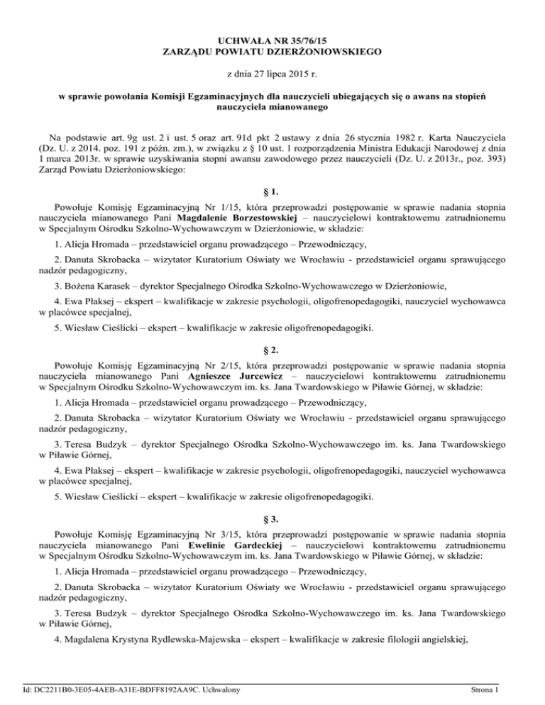 UCHWAŁA NR 35/76/15 ZARZĄDU POWIATU DZIERŻONIOWSKIEGO z dnia 27 lipca 2015 r. w sprawie powołania Komisji Egzaminacyjnych dla nauczycieli ubiegających się o awans na stopień nauczyciela mianowanego Na podstawie art. 9g ust. 2 i ust. 5 oraz art. 91d pkt 2 ustawy z dnia 26 stycznia 1982 r. Karta Nauczyciela (Dz. U. z 2014. poz. 191 z późn. zm.), w związku z § 10 ust. 1 rozporządzenia Ministra Edukacji Narodowej z dnia 1 marca 2013r. w sprawie uzyskiwania stopni awansu zawodowego przez nauczycieli (Dz. U. z 2013r., poz. 393) Zarząd Powiatu Dzierżoniowskiego: § 1. Powołuje Komisję Egzaminacyjną Nr 1/15, która przeprowadzi postępowanie w sprawie nadania stopnia nauczyciela mianowanego Pani Magdalenie Borzestowskiej – nauczycielowi kontraktowemu zatrudnionemu w Specjalnym Ośrodku Szkolno-Wychowawczym w Dzierżoniowie, w składzie: 1. Alicja Hromada – przedstawiciel organu prowadzącego – Przewodniczący, 2. Danuta Skrobacka – wizytator Kuratorium Oświaty we Wrocławiu - przedstawiciel organu sprawującego nadzór pedagogiczny, 3. Bożena Karasek – dyrektor Specjalnego Ośrodka Szkolno-Wychowawczego w Dzierżoniowie, 4. Ewa Płaksej – ekspert – kwalifikacje w zakresie psychologii, oligofrenopedagogiki, nauczyciel wychowawca w placówce specjalnej, 5. Wiesław Cieślicki – ekspert – kwalifikacje w zakresie oligofrenopedagogiki. § 2. Powołuje Komisję Egzaminacyjną Nr 2/15, która przeprowadzi postępowanie w sprawie nadania stopnia nauczyciela mianowanego Pani Agnieszce Jurcewicz – nauczycielowi kontraktowemu zatrudnionemu w Specjalnym Ośrodku Szkolno-Wychowawczym im. ks. Jana Twardowskiego w Piławie Górnej, w składzie: 1. Alicja Hromada – przedstawiciel organu prowadzącego – Przewodniczący, 2. Danuta Skrobacka – wizytator Kuratorium Oświaty we Wrocławiu - przedstawiciel organu sprawującego nadzór pedagogiczny, 3. Teresa Budzyk – dyrektor Specjalnego Ośrodka Szkolno-Wychowawczego im. ks. Jana Twardowskiego w Piławie Górnej, 4. Ewa Płaksej – ekspert – kwalifikacje w zakresie psychologii, oligofrenopedagogiki, nauczyciel wychowawca w placówce specjalnej, 5. Wiesław Cieślicki – ekspert – kwalifikacje w zakresie oligofrenopedagogiki. § 3. Powołuje Komisję Egzaminacyjną Nr 3/15, która przeprowadzi postępowanie w sprawie nadania stopnia nauczyciela mianowanego Pani Ewelinie Gardeckiej – nauczycielowi kontraktowemu zatrudnionemu w Specjalnym Ośrodku Szkolno-Wychowawczym im. ks. Jana Twardowskiego w Piławie Górnej, w składzie: 1. Alicja Hromada – przedstawiciel organu prowadzącego – Przewodniczący, 2. Danuta Skrobacka – wizytator Kuratorium Oświaty we Wrocławiu - przedstawiciel organu sprawującego nadzór pedagogiczny, 3. Teresa Budzyk – dyrektor Specjalnego Ośrodka Szkolno-Wychowawczego im. ks. Jana Twardowskiego w Piławie Górnej, 4. Magdalena Krystyna Rydlewska-Majewska – ekspert – kwalifikacje w zakresie filologii angielskiej, Id: DC2211B0-3E05-4AEB-A31E-BDFF8192AA9C. Uchwalony Strona 1 5. Ewa Płaksej – ekspert – kwalifikacje w zakresie psychologii, oligofrenopedagogiki, nauczyciel wychowawca w placówce specjalnej. § 4. Powołuje Komisję Egzaminacyjną Nr 4/15, która przeprowadzi postępowanie w sprawie nadania stopnia nauczyciela mianowanego Pani Marcie Łancewicz – nauczycielowi kontraktowemu zatrudnionemu w Zespole Szkół Ogólnokształcących w Dzierżoniowie, w składzie: 1. Alicja Hromada – przedstawiciel organu prowadzącego – Przewodniczący, 2. Danuta Skrobacka – wizytator Kuratorium Oświaty we Wrocławiu - przedstawiciel organu sprawującego nadzór pedagogiczny, 3. Grażyna Bajsarowicz – dyrektor Zespołu Szkół Ogólnokształcących w Dzierżoniowie, 4. Magdalena Krystyna Rydlewska-Majewska – ekspert – kwalifikacje w zakresie filologii angielskiej, 5. Wiesław Cieślicki – ekspert – kwalifikacje w zakresie oligofrenopedagogiki, nauczyciel liceum ogólnokształcącego. § 5. Powołuje Komisję Egzaminacyjną Nr 5/15, która przeprowadzi postępowanie w sprawie nadania stopnia nauczyciela mianowanego Panu Bartłomiejowi Wakule – nauczycielowi kontraktowemu zatrudnionemu w II Liceum Ogólnokształcącym im. Jana Pawła II w Dzierżoniowie, w składzie: 1. Alicja Hromada – przedstawiciel organu prowadzącego – Przewodniczący, 2. Danuta Skrobacka – wizytator Kuratorium Oświaty we Wrocławiu - przedstawiciel organu sprawującego nadzór pedagogiczny, 3. Marzena Kudra – dyrektor II Liceum Ogólnokształcącego im. Jana Pawła II w Dzierżoniowie, 4. Ewa Płaksej – ekspert – kwalifikacje w zakresie psychologii, oligofrenopedagogiki, nauczyciel wychowawca w placówce specjalnej, 5. Wiesław Cieślicki – ekspert – kwalifikacje w zakresie oligofrenopedagogiki, nauczyciel liceum ogólnokształcącego, 6. Wiesław Łuszczek – przedstawiciel Komisji Międzyzakładowej NSZZ „Solidarność” Pracowników Oświaty i Wychowania Ziemi Dzierżoniowskiej. § 6. Powołuje Komisję Egzaminacyjną Nr 6/15, która przeprowadzi postępowanie w sprawie nadania stopnia nauczyciela mianowanego Pani Małgorzacie Szachniewicz – nauczycielowi kontraktowemu zatrudnionemu w Zespole Szkół Nr 1 im. prof. Wilhelma Rotkiewicza w Dzierżoniowie, w składzie: 1. Alicja Hromada – przedstawiciel organu prowadzącego – Przewodniczący, 2. Danuta Skrobacka – wizytator Kuratorium Oświaty we Wrocławiu - przedstawiciel organu sprawującego nadzór pedagogiczny, 3. Aleksander Koszela – dyrektor Zespołu Szkół Nr 1 im. prof. Wilhelma Rotkiewicza w Dzierżoniowie, 4. Wiesław Cieślicki – ekspert – kwalifikacje w zakresie wychowania fizycznego, oligofrenopedagogiki, nauczyciel liceum ogólnokształcącego, 5. Magdalena Krystyna Rydlewska-Majewska – ekspert – kwalifikacje w zakresie filologii angielskiej, nauczyciel liceum ogólnokształcącego. § 7. Wykonanie uchwały powierza się dyrektorowi Wydziału Edukacji i Kultury Starostwa Powiatowego w Dzier