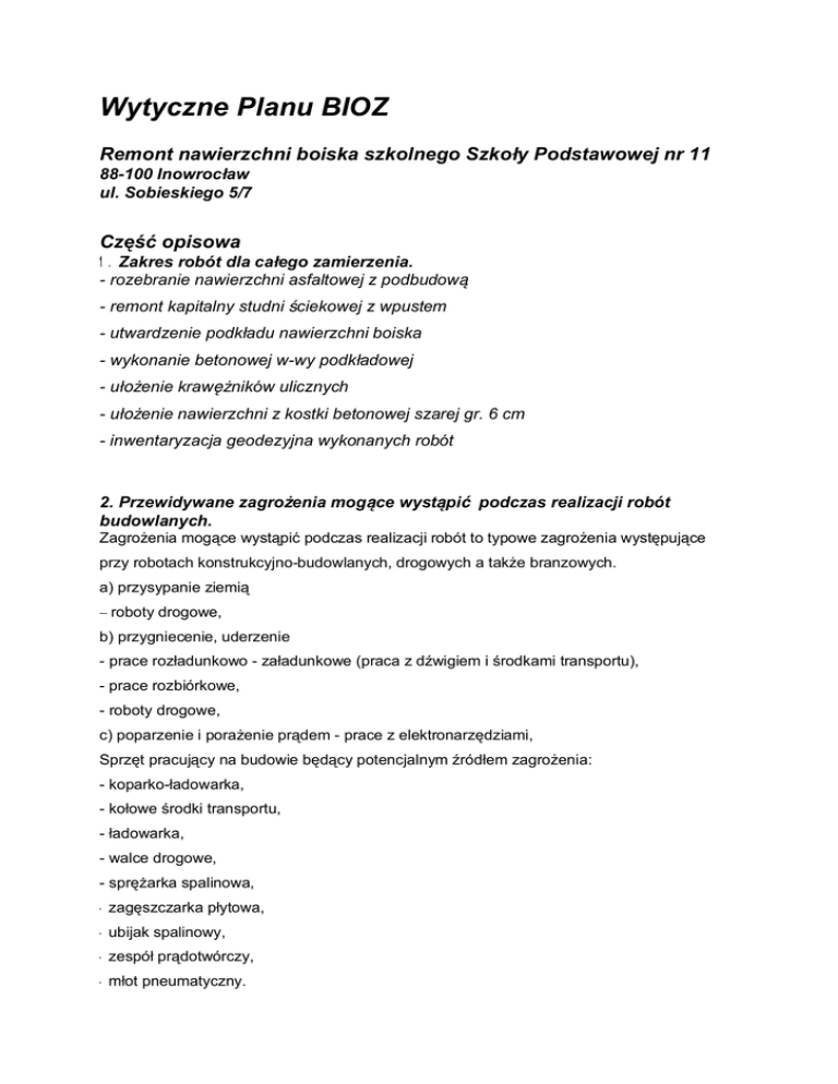 Wytyczne Planu BIOZ Remont nawierzchni boiska szkolnego Szko y Podstawowej nr 11 88-100 Inowroc aw ul. Sobieskiego 5/7 Cz opisowa 1. Zakres robót dla ca ego zamierzenia. - rozebranie nawierzchni asfaltowej z podbudow - remont kapitalny studni ciekowej z wpustem - utwardzenie podk adu nawierzchni boiska - wykonanie betonowej w-wy podk adowej -u enie kraw ników ulicznych -u enie nawierzchni z kostki betonowej szarej gr. 6 cm - inwentaryzacja geodezyjna wykonanych robót 2. Przewidywane zagro enia mog ce wyst pi budowlanych. podczas realizacji robót Zagro enia mog ce wyst pi podczas realizacji robót to typowe zagro enia wyst puj ce przy robotach konstrukcyjno-budowlanych, drogowych a tak e branzowych. a) przysypanie ziemi roboty drogowe, b) przygniecenie, uderzenie - prace roz adunkowo - za adunkowe (praca z d wigiem i rodkami transportu), - prace rozbiórkowe, - roboty drogowe, c) poparzenie i pora enie pr dem - prace z elektronarz dziami, Sprz t pracuj cy na budowie b d cy potencjalnym ród em zagro enia: - koparko- adowarka, - ko owe rodki transportu, - adowarka, - walce drogowe, - spr arka spalinowa, - zag szczarka p ytowa, - ubijak spalinowy, - zespó pr dotwórczy, - ot pneumatyczny. 3. Oznakowanie i wydzielenie miejsc prowadzenia robót budowlanych. Teren budowy zostanie wygrodzony i oznakowany na czas prowadzenia robót . Instalacje obce znajduj ce si pod powierzchni ziemi zostan zinwentaryzowane przez próbne przekopy na podstawie posiadanej dokumentacji. Ich przebieg na powierzchni terenu zostanie wypalikowany w celu ich szybkiej lokalizacji. 4. Instrukta pracowników: Ka dy pracownik Wykonawcy zostanie zapoznany z planem bezpiecze stwa i ochrony zdrowia. Do pracy dopuszczeni b d pracownicy posiadaj cy aktualne badania lekarskie o zdolno ci do pracy oraz posiadaj cy przeszkolenie okresowe i stanowiskowe z zakresu BHP. Pracownicy realizuj cy roboty szczególnie niebezpieczne przed ich rozpocz ciem b d poinformowani o skali i rodzaju zagro e podczas prowadzenia robót oraz zasad post powania w wypadku awarii. W przypadku wyst pienia zagro enia nale y : 1. bezzw ocznie powiadomi : - kierownika budowy, - osob nadzoruj c prace. 2. przyst pi do udzielenia pomocy poszkodowanym, 3. zawiadomi odpowiednie s by ratownicze: 4. ostrzec osoby postronne przed zagro eniem, 5. wstrzyma ruch ko owy – je eli jest to niezb dne ze wzgl dów bezpiecze stwa, 6. oznaczy teren zagro enia, 7. w miar mo liwo ci (z zachowaniem wymogów bezpiecze stwa) przyst pi do ratowania mienia. rodki ochrony indywidualnej. Ka dy z pracowników zobowi zany jest do stosowania rodków ochrony indywidualnej: - kask ochronny, - r kawice robocze, - odpowiednia odzie i obuwie robocze, - kamizelki odblaskowe itp. W przypadku robót bran owych pracownik winien u ywa odpowiednich, specjalistycznych dla danej bran y przyrz dów, urz dze i rodków ochrony indywidualnej – wg obowi zuj cych przepisów bran owych. rodki te zobowi zany jest mu dostarczy Pracodawca. O rodki te pracownik powinien dba i u ywa je zgodnie z przeznaczeniem. Zasady nadzoru nad pracami szczególnie niebezpiecznymi Do prac szczególnie niebezpiecznych nale y zaliczy : korytowanie (roboty ziemne ) za adunek gruzu. Rozpocz cie (zako czenie) prac b dzie zg aszane do Kierownika Budowy. Dopuszcza si zg aszanie telefoniczne potwierdzone pisemnie w dniu rozpocz cia (zako czenia) prac. Pracownicy przed przyst pieniem do prac zostan poinformowani o przewidywanej skali zagro enia. W wypadku natrafienia na urz dzenia podziemne, które nie by y zinwentaryzowane praca zostanie wstrzymana do czasu podj cia decyzji przez Inspektora Nadzoru. W przypadku pracy w strefie ochrony archeologicznej o wszelkich znaleziskach zostanie niezw ocznie poinformowany Koordynator prac archeologicznych, a prace zostan wstrzymane. 5. Materia y niebezpieczne. Nie przewiduje si stosowania materia ów niebezpiecznych. 6. rodki techniczne i organizacyjne. Wykonawca zobowi zany jest do przestrzegania Rozporz dzenia Ministra Infrastruktury z dnia 6 lutego 2003 w sprawie bezpiecze stwa i higieny pracy podczas wykonywania robót budowlanych. Punkt pierwszej pomocy medycznej zostanie zlokalizowany na terenie zaplecza Wykonawcy w bezpo rednim s siedztwie budowy. Wykonawca robót b dzie trzyma w nale ytym porz dku drogi dojazdowe do zaplecza i miejsca prowadzenia prac, zapewniaj c mo liwo szybkiej ewakuacji na wypadek po aru, awarii i innych zagro e . Do pracy dopuszczeni mog by wy cznie pracownicy posiadaj cy aktualne badania lekarskie o zdolno ci do pracy oraz posiadaj cy przeszkolenie okresowe i stanowiskowe z zakresu BHP . Wykonawca b dzie kontrolowa na bie co stan zabezpieczenia i oznakowania placu budowy. Stwierdzone nieprawid owo ci b d usuwane. Do prac m e by ywany jedynie sprz t w dobrym stanie technicznym. Nale y okre li stref niebezpieczn , w której przebywanie jest zakazane ze wzgl du na mo liwo spadania przedmiotów. Realizuj c prace ziemne Wykonawca b dzie szczegó owo obserwowa wydobywany materia . 7. Dokumentacja budowy. Dokumentacja budowy b dzie przechowywana w pomieszczeniach zaplecza Wykonawcy na terenie budowy. Dokumentacj niezb dn do prawid owej eksploatacji maszyn i innych urz dze technicznych b d przechowywane w siedzibie firmy Wykonawcy.