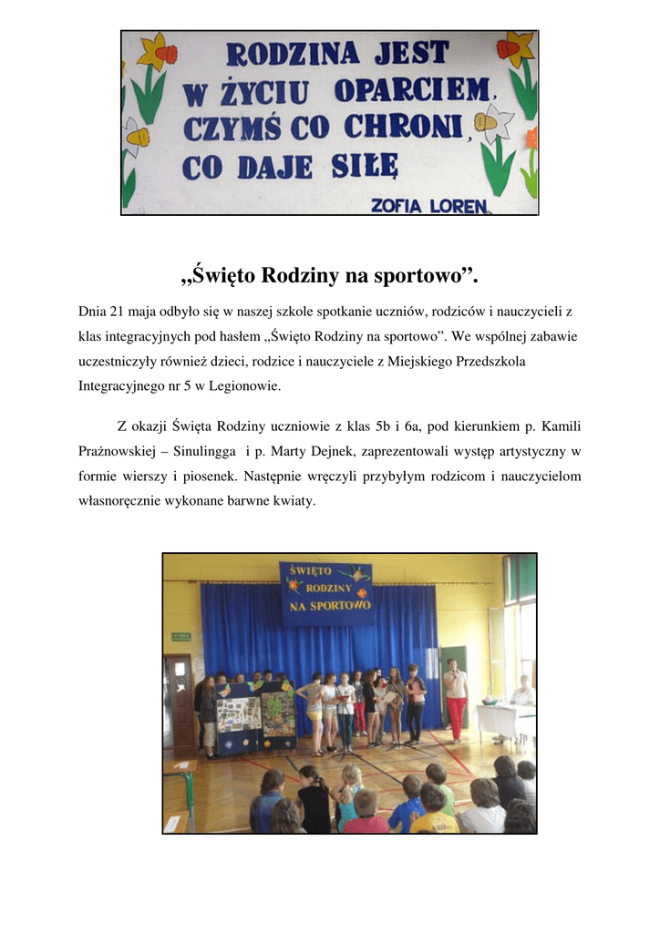 „Święto Rodziny na sportowo”. Dnia 21 maja odbyło się w naszej szkole spotkanie uczniów, rodziców i nauczycieli z klas integracyjnych pod hasłem „Święto Rodziny na sportowo”. We wspólnej zabawie uczestniczyły również dzieci, rodzice i nauczyciele z Miejskiego Przedszkola Integracyjnego nr 5 w Legionowie. Z okazji Święta Rodziny uczniowie z klas 5b i 6a, pod kierunkiem p. Kamili Prażnowskiej – Sinulingga i p. Marty Dejnek, zaprezentowali występ artystyczny w formie wierszy i piosenek. Następnie wręczyli przybyłym rodzicom i nauczycielom własnoręcznie wykonane barwne kwiaty. A potem… nie lada wyzwanie stanęło przed wszystkimi uczestnikami zabawy!!! Na początek, przy dźwiękach skocznej muzyki, odbyła się rozgrzewka przeprowadzona przez nauczyciela wychowania fizycznego - p. Agnieszkę Orlikowską. Od tego momentu wszyscy byli już świetnie przygotowani, by osiągnąć cel - zdobyć odpowiednią liczbę punktów na specjalnie przygotowanych kartach. Ale i tu trzeba było spełnić warunek... By otrzymać punkty przy poszczególnych stanowiskach, zadanie musiało wykonać nie tylko dziecko, ale i rodzic. Czasem nie było łatwo…☺ Uczestnicy mieli do wyboru szereg różnego rodzaju konkurencji: skok przez skakankę, zabawy z piłką, origami, puzzle, rzuty do celu, zabawy plastyczne itp. Po wspólnej, wesołej zabawie przyszedł czas na wspólne zdjęcie i nagrody. Pani Dyrektor Irena Pawłowska wręczyła dzieciom i rodzicom pamiątkowe dyplomy i lizaki. Zabawa zakończyła się słodkim poczęstunkiem przy pięknie udekorowanym stole. Spotkanie było pełne wrażeń i z pewnością pozostawi w nas miłe wspomnienia... Przewodnicząca Zespołu ds. Integracji Ewelina Gawryluk