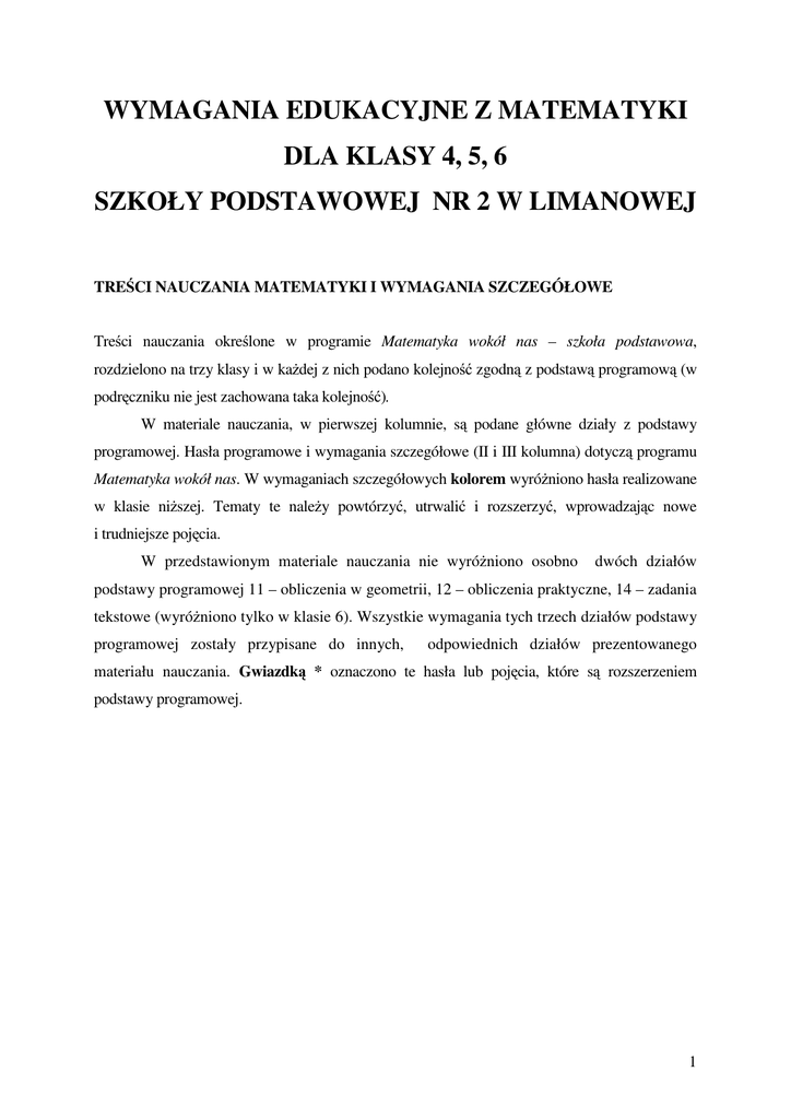 wymagania edukacyjne z matematyki dla klasy 4, 5, 6 szkoły