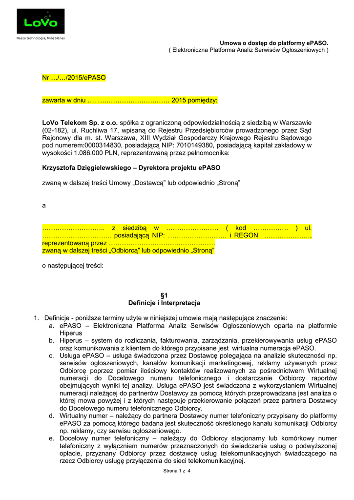 Umowa o dostęp do platformy ePASO. ( Elektroniczna Platforma Analiz Serwisów Ogłoszeniowych ) Nr …/…/2015/ePASO zawarta w dniu …. …………………………… 2015 pomiędzy: LoVo Telekom Sp. z o.o. spółka z ograniczoną odpowiedzialnością z siedzibą w Warszawie (02-182), ul. Ruchliwa 17, wpisaną do Rejestru Przedsiębiorców prowadzonego przez Sąd Rejonowy dla m. st. Warszawa, XIII Wydział Gospodarczy Krajowego Rejestru Sądowego pod numerem:0000314830, posiadającą NIP: 7010149380, posiadającą kapitał zakładowy w wysokości 1.086.000 PLN, reprezentowaną przez pełnomocnika: Krzysztofa Dzięgielewskiego – Dyrektora projektu ePASO zwaną w dalszej treści Umowy „Dostawcą” lub odpowiednio „Stroną” a ……………………….. z siedzibą w …………………… ( kod ……………. ) ul. ………………………….. posiadającą NIP: ……………………… i REGON …………………, reprezentowaną przez …………………………………………. zwaną w dalszej treści „Odbiorcą” lub odpowiednio „Stroną” o następującej treści: §1 Definicje i Interpretacja 1. Definicje - poniższe terminy użyte w niniejszej umowie mają następujące znaczenie: a. ePASO – Elektroniczna Platforma Analiz Serwisów Ogłoszeniowych oparta na platformie Hiperus b. Hiperus – system do rozliczania, fakturowania, zarządzania, przekierowywania usług ePASO oraz komunikowania z klientem do którego przypisane jest wirtualna numeracja ePASO. c. Usługa ePASO – usługa świadczona przez Dostawcę polegająca na analizie skuteczności np. serwisów ogłoszeniowych, kanałów komunikacji marketingowej, reklamy używanych przez Odbiorcę poprzez pomiar ilościowy kontaktów realizowanych za pośrednictwem Wirtualnej numeracji do Docelowego numeru telefonicznego i dostarczanie Odbiorcy raportów obejmujących wyniki tej analizy. Usługa ePASO jest świadczona z wykorzystaniem Wirtualnej numeracji należącej do partnerów Dostawcy za pomocą których przeprowadzana jest analiza o której mowa powyżej i z których następuje przekierowanie połączeń przez partnera Dostawcy do Docelowego numeru telefonicznego Odbiorcy. d. Wirtualny numer – należący do partnera Dostawcy numer telefoniczny przypisany do platformy ePASO za pomocą którego badana jest skuteczność określonego kanału komunikacji Odbiorcy np. reklamy, czy serwisu ogłoszeniowego. e. Docelowy numer telefoniczny – należący do Odbiorcy stacjonarny lub komórkowy numer telefoniczny z wyłączniem numerów przeznaczonych do świadczenia usług o podwyższonej opłacie, przyznany Odbiorcy przez dostawcę usług telekomunikacyjnych świadczącego na rzecz Odbiorcy usługę przyłączenia do sieci telekomunikacyjnej. Strona 1 z 4 Umowa o dostęp do platformy ePASO. ( Elektroniczna Platforma Analiz Serwisów Ogłoszeniowych ) f. g. h. i. j. k. l. m. n. o. p. q. r. s. t. Planowanie numeracji – Wydzielenie dla Odbiorcy w platformie ePASO niezbędnej ilości Wirtualnych numerów służących do wykonania Usługi ePASO. Zarządzanie numeracją ( siatka przekierowań ) – Przypisanie w platformie ePASO Wirtualnej numeracji do numeracji docelowej. Przekierowywanie połączenia do Odbiorcy - Przeniesienie połączenia realizowanego na Wirtualny numer służący do badania danego kanału komunikacji z wykorzystaniem platformy ePASO na Docelowy numer telefoniczny. Raporty z platformy ePASO – tabelaryczne i graficzne zestawienia danych z platformy ePASO a dotyczące wirtualnej numeracji. Nagrywanie rozmów – nagrywanie na serwerach platformy ePASO rozmów telefonicznych realizowanych tylko i wyłącznie z Wirtualnych numerów Dostawcy na Docelowe numery telefoniczne Odbiorcy. Raporty połączeń – zestawienie ilości, czasu trwania połączeń i kosztów połączeń przekierowanych na numery komórkowe. Raporty aktywności pracowników – tabelaryczne zestawienie ilości i czasu trwania połączeń, ilości nieodebranych połączeń a realizowanych z Wirtualnej numeracji na Docelową numerację telefoniczną przypisaną do pracowników Odbiorcy. Raporty google analytics - zestawienie tabelaryczne i graficzne z serwisu Google Analytics Raporty google adwords - zestawienie tabelaryczne i graficzne z serwisu Google Analytics Tablet - przenośny komputer większy niż telefon komórkowy lub palmtop. Skuteczność w rozumieniu usługi ePASO – ilość kontaktów generowanych przez klientów do Odbiorcy z wykorzystaniem danego Wirtualnego numeru. Panel Klienta na stronie Lovo.pl – miejsce do logowania i administrowania usługami na platformie ePASO. Protokół odbioru – Załącznik nr 1 jako dokument do niniejszej umowy stanowiący wykaz Wirtualnej numeracji przypisanej do danego kanału komunikacji oraz zawierający datę uruchomienia usługi, obowiązywania niniejszej umowy i rozpoczynający zobowiązania Odbiorcy na rzecz Dostawcy płatności za usługi ePASO . Cennik – Załącznik nr 2 jako dokument do niniejszej umowy stanowiący tabelaryczne zestawienie cen za usługi platformy ePASO. Fraud – wszelkie działania mogące skutkować wykorzystaniem Usługi ePaso do celów niezgodnych z niniejszą Umową, w szczególności wykorzystaniu luk w platformie Hiperus ePASO w celu wzbogacenia się, przekierowania rozmów bez wiedzy Dostawcy na numery usług o podwyższonej opłacie, czy generowania sztucznego ruchu do Docelowego numeru telefonicznego. §2 Zakres i Warunki Umowy 1. Umowa niniejsza określa zakres usług świadczonych przez Dostawcę na rzecz Odbiorcy oraz prawa i obowiązki Stron. 2. Dostawca zobowiązuje się do świadczenia na rzecz Odbiorcy usług wyszczególnionych w pkt 4. 3. Dostawca zobowiązuje się do świadczenia na rzecz Odbiorcy, na warunkach przewidzianych w niniejszej umowie Usługi ePaso. Dla uniknięcia wątpliwości Strony zgodnie potwierdzają, że Dostawca nie jest zobowiązany na podstawie Umowy do świadczenia jakichkolwiek usług 