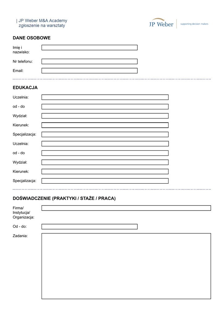 DANE OSOBOWE Imię i nazwisko: Nr telefonu: Email: EDUKACJA Uczelnia: od - do Wydział: Kierunek: Specjalizacja: Uczelnia: od - do Wydział: Kierunek: Specjalizacja: DOŚWIADCZENIE (PRAKTYKI / STAŻE / PRACA) Firma/ Instytucja/ Organizacja: Od - do: Zadania: Firma/ Instytucja/ Organizacja: Od - do: Zadania: Firma/ Instytucja/ Organizacja: Od - do: Zadania: JĘZYKI OBCE Angielski w mowie Angielski w piśmie Niemiecki w mowie Niemiecki w piśmie Inny w mowie i w piśmie KONKURSY / CERTYFIKATY CFA Institute Research Challenge Etap/Wynik Experience PWC EY Financial Challenger Global Management Challenge KMPG International Case Competition BCG Droga na szczyt McKinsey Case Study Competition CFA Level1 Candidate CFA Level2 Candidate Inne ZAINTERESOWANIA ZAWODOWE / UMIEJĘTNOŚCI MS Excel SQL Makra Tworzenie biznes planów Metodologia zarządzania projektami Metody analizy finansowej Autoprezentacja Wycena przedsiębiorstw metoda: