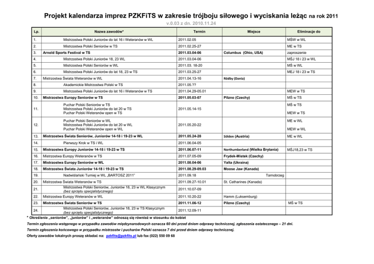 Projekt kalendarza imprez PZKFiTS w zakresie trójboju siłowego i wyciskania leżąc na rok 2011 v.0.03 z dn. 2010.11.24 Lp. Nazwa zawodów* Termin Miejsce Eliminacje do 1. Mistrzostwa Polski Juniorów do lat 16 i Weteranów w WL 2011.02.05 MŚW w WL 2. Mistrzostwa Polski Seniorów w TS 2011.02.25-27 ME w TS 3. Arnold Sports Festival w TS 2011.03.04-06 Columbus (Ohio, USA) zaproszenie 4. Mistrzostwa Polski Juniorów 18, 23 WL 2011.03.04-06 MŚJ 18 i 23 w WL 5. Mistrzostwa Polski Seniorów w WL 2011.03. 18-20 MŚ w WL 6. 7. 8. 9. 10. 11. 12. 13. Mistrzostwa Polski Juniorów do lat 18, 23 w TS Mistrzostwa Świata Weteranów w WL Akademickie Mistrzostwa Polski w TS Mistrzostwa Polski Juniorów do lat 16 i Weteranów w TS Mistrzostwa Europy Seniorów w TS 2011.03.25-27 2011.04.13-16 2011.05.?? 2011.04.29-05.01 2011.05.03-07 Puchar Polski Seniorów w TS Mistrzostwa Polski Juniorów do lat 20 w TS Puchar Polski Weteranów open w TS 2011.05.14-15 Puchar Polski Seniorów w WL Mistrzostwa Polski Juniorów do lat 20 w WL Puchar Polski Weteranów open w WL 2011.05.20-22 Mistrzostwa Świata Seniorów, Juniorów 14-18 i 19-23 w WL MEJ 18 i 23 w TS Rödby (Dania) MEW w TS Pilzno (Czechy) MŚ w TS MŚ w TS MEW w TS ME w WL MEW w WL 2011.05.24-28 Sölden (Austria) ME w WL MŚJ18,23 w TS 14. Pierwszy Krok w TS i WL 15. Mistrzostwa Europy Juniorów 14-18 i 19-23 w TS 2011.06.07-11 Northumberland (Wielka Brytania) 16. Mistrzostwa Europy Weteranów w TS 2011.07.05-09 Frydek-Mistek (Czechy) 17. Mistrzostwa Europy Seniorów w WL 2011.08.04-06 Yalta (Ukraina) 18. Mistrzostwa Świata Juniorów 14-18 i 19-23 w TS 2011.08.29-09.03 Moose Jaw (Kanada) 19. 20. Nadwiślański Turniej w WL „BARTOSZ 2011” 2011.06.04-05 2011.09.18 Tarnobrzeg 2011.09.27-10.01 22. Mistrzostwa Świata Weteranów w TS Mistrzostwa Polski Seniorów, Juniorów 18, 23 w WL Klasycznym (bez sprzętu specjalistycznego) Mistrzostwa Europy Weteranów w WL 2011.10.20-22 Hamm (Luksemburg) 23. Mistrzostwa Świata Seniorów w TS 2011.11.06-12 Pilzno (Czechy) 21. St. Catharines (Kanada) 2011.10.07-09 MŚ w TS Mistrzostwa Polski Seniorów, Juniorów 18, 23 w TS Klasycznym 24. 2011.12.09-11 (bez sprzętu specjalistycznego) * Określenie „seniorów”, „juniorów” i „weteranów” odnoszą się również w stosunku do kobiet Termin zgłoszenia wstępnego w przypadku zawodów międzynarodowych oznacza 60 dni przed dniem odprawy technicznej, zgłoszenia ostatecznego – 21 dni. Termin zgłoszenia końcowego w przypadku mistrzostw i pucharów Polski oznacza 7 dni przed dniem odprawy technicznej. Oferty zawodów lokalnych proszę składać na: [email protected] lub fax (022) 550 09 68