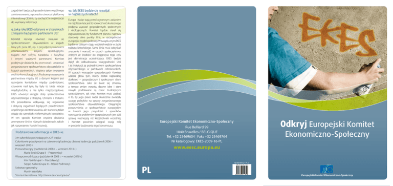 zagadnień będących przedmiotem wspólnego zainteresowania, a ponadto utworzył platformę internetową CESlink, by zachęcić te organizacje do wymiany informacji. 9. Jaką rolę EKES odgrywa w stosunkach z krajami będącymi partnerami UE? Komitet rozwija również stosunki ze społeczeństwem obywatelskim w krajach leżących poza UE, np. z przyszłymi państwami członkowskimi, krajami sąsiadującymi, krajami AKP (Afryki, Karaibów i Pacyfiku) i innymi ważnymi partnerami. Komitet podejmuje działania, by promować i umacniać zorganizowane społeczeństwo obywatelskie w krajach partnerskich. Wspiera także tworzenie struktur konsultacyjnych. Podstawą rozszerzania partnerstwa między UE a danymi krajami jest rozwijanie kontaktów między podmiotami, czuwanie nad tym, by były to także relacje międzyludzkie, a nie tylko międzyrządowe. EKES utworzył okrągłe stoły społeczeństwa obywatelskiego z Brazylią, Chinami i Indiami. Ich posiedzenia odbywają się regularnie i dotyczą zagadnień będących przedmiotem wspólnego zainteresowania, ale stanowią także okazję do szerokich nieformalnych kontaktów. W ten sposób Komitet wspiera działania zewnętrzne Unii w różnych dziedzinach, takich jak rozszerzenie, handel i rozwój. 10. Jak EKES będzie się rozwijał w najbliższych latach? Europa i świat stają przed ogromnym zadaniem na najbliższe lata: jest to konieczność skutecznego podjęcia wyzwań gospodarczych, społecznych i ekologicznych. Komitet będzie starał się zagwarantować, by fundament planów naprawy stanowiły silne punkty Unii, w szczególności europejski model społeczny. W związku z tym EKES będzie w dalszym ciągu wspierał wejście w życie traktatu lizbońskiego. Sama Unia musi odzyskać znaczenie i wartość w oczach społeczeństwa. Jednym ze środków do osiągnięcia tego celu jest demokracja uczestnicząca. EKES będzie dążył do odbudowania wiarygodności Unii i jej instytucji za pośrednictwem społeczeństwa obywatelskiego w państwach członkowskich. W czasach wstrząsów gospodarczych Komitet udziela głosu tym, którzy zostali najbardziej dotknięci – gospodarczym i społecznym siłom społeczeństwa. Jako że świat się zmienia, a tempo zmian wzrasta, dawne idee i stare nawyki poddawane są coraz trudniejszym sprawdzianom, tak więc Komitet musi zadbać o to, by jego prace nadal skutecznie zwracały uwagę polityków na sprawy zorganizowanego społeczeństwa obywatelskiego. Osiągnięcie porozumienia w społeczeństwie europejskim w kwestii jego przyszłości i sposobów rozwiązania problemów gospodarczych jest dziś sprawą ważniejszą niż kiedykolwiek wcześniej, i Komitet powinien odegrać swoją rolę w procesie budowania tego konsensusu. Podstawowe informacje o EKES-ie: 344 członków pochodzących z 27 krajów Członkowie powoływani na czteroletnią kadencję, obecna kadencja: październik 2006 – wrzesień 2010 r. Przewodniczący (październik 2008 r. – wrzesień 2010 r.) Mario Sepi (Grupa II – Pracownicy) Wiceprzewodniczący (październik 2008 r. – wrzesień 2010 r.) Irini Pari (Grupa I – Pracodawcy) Seppo Kallio (Grupa III – Różne Podmioty) Sekretarz generalny Martin Westlake Strona internetowa: http://www.eesc.europa.eu/ Odkryj Europejski Komitet Europejski Komitet Ekonomiczno-Społeczny Rue Belliard 99 1040 Bruxelles / Belgique Tel. +32 25469604 | Faks +32 25469764 Nr katalogowy: EKES-2009-16-PL Ekonomiczno-Społeczny www.eesc.europa.eu QE-80-09-521-PL-C PL Europejski Komitet Ekonomiczno-Społeczny Comité économique et social européen 1. Czym jest Europejski Komitet Ekonomiczno-Społeczny (EKES)? Komitet to organ doradczy Unii Europejskiej, utworzony w 1957 r. na mocy traktatu rzymskiego. Składa się z przedstawicieli różnych społecznych i gospodarczych podmiotów społeczeństwa obywatelskiego, znanych łącznie jako zorganizowane społeczeństwo obywatelskie. Jego najważniejszą funkcją jest doradzanie trzem głównym instytucjom UE: Komisji, Radzie i Parlamentowi. Komitet wypełnia ją przede wszystkim poprzez wydawanie oficjalnych opinii w sprawie wniosków legislacyjnych Komisji Europejskiej oraz polityki UE w ogólności, jako że dotyczy ona gospodarki i społeczeństwa. EKES ma trzy uzupełniające się wzajemnie zadania: po pierwsze, angażowanie organizacji społeczeństwa obywatelskiego w projekt integracji europejskiej, na szczeblu zarówno krajowym, jak i europejskim; po drugie, przyczynianie się – poprzez swoje działania i za pośrednictwem członków – do niwelowania dystansu między Unią Europejską a obywatelami; po trzecie zaś, umacnianie roli organizacji społeczeństwa obywatelskiego w krajach nienależących do UE i w ugrupowaniach państw. 2. Kim są członkowie EKES-u? 344 członków Komitetu, kobiet i mężczyzn, pochodzi z 27 państw członkowskich, w proporcjach zasadniczo odpowiadających liczbie ludności poszczególnych krajów. Są oni powoływani na czteroletnią, odnawialną kadencję przez Radę UE, by reprezentować społeczeństwo obywatelskie. Kandydatów wyznaczają rządy krajowe po konsultacji z organizacjami społeczeństwa obywatelskiego w swoich państwach, przy czym skład tej grupy dobierany jest tak, by odzwierciedlał szeroki wachlarz interesów. Członkowie EKES-u są niezależni od organów rządowych, a ich mandaty mają charakter osobisty. Każdy z nich należy do jednej z trzech Grup: Pracodawców, Pracowników lub Innych Podmiotów. W Komitecie są członkowie z wielu różnych środowisk, w tym ze środowisk przedsiębiorców, pracowników, bankowości, rolników, rzemieślników, MŚP, wolnych zawodów, organizacji konsumenckich, przedstawicieli osób niepełnosprawnych i społecznie wykluczonych, podmiotów gospodarki społecznej i aktywistów ekologicznych. Członkowie sami wybierają, do której Grupy EKES-u chcą należeć. Ponadto nie otrzymują wynagrodzenia za pracę w EKES-ie (choć zwraca się im koszty podróży i poby