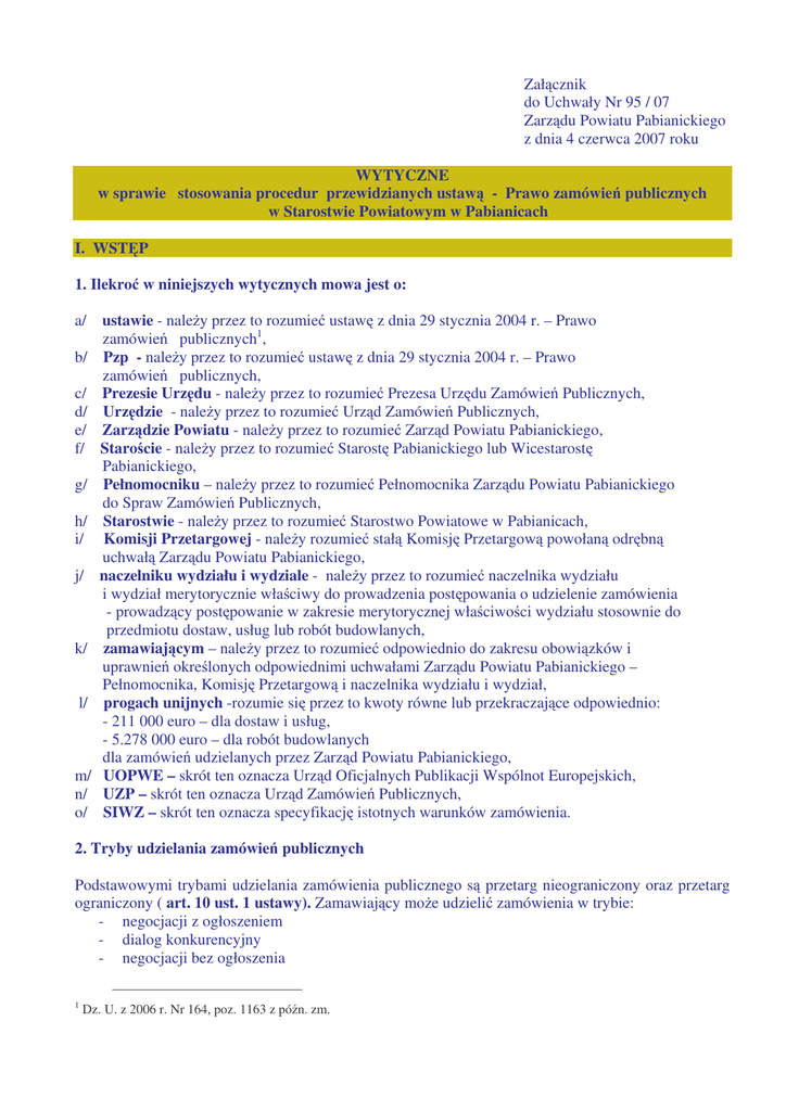 Zał cznik do Uchwały Nr 95 / 07 Zarz du Powiatu Pabianickiego z dnia 4 czerwca 2007 roku WYTYCZNE w sprawie stosowania procedur przewidzianych ustaw - Prawo zamówie publicznych w Starostwie Powiatowym w Pabianicach I. WST P 1. Ilekro w niniejszych wytycznych mowa jest o: a/ b/ c/ d/ e/ f/ g/ h/ i/ j/ k/ l/ m/ n/ o/ ustawie - nale y przez to rozumie ustaw z dnia 29 stycznia 2004 r. – Prawo zamówie publicznych1, Pzp - nale y przez to rozumie ustaw z dnia 29 stycznia 2004 r. – Prawo zamówie publicznych, Prezesie Urz du - nale y przez to rozumie Prezesa Urz du Zamówie Publicznych, Urz dzie - nale y przez to rozumie Urz d Zamówie Publicznych, Zarz dzie Powiatu - nale y przez to rozumie Zarz d Powiatu Pabianickiego, Staro cie - nale y przez to rozumie Starost Pabianickiego lub Wicestarost Pabianickiego, Pełnomocniku – nale y przez to rozumie Pełnomocnika Zarz du Powiatu Pabianickiego do Spraw Zamówie Publicznych, Starostwie - nale y przez to rozumie Starostwo Powiatowe w Pabianicach, Komisji Przetargowej - nale y rozumie stał Komisj Przetargow powołan odr bn uchwał Zarz du Powiatu Pabianickiego, naczelniku wydziału i wydziale - nale y przez to rozumie naczelnika wydziału i wydział merytorycznie wła ciwy do prowadzenia post powania o udzielenie zamówienia - prowadz cy post powanie w zakresie merytorycznej wła ciwo ci wydziału stosownie do przedmiotu dostaw, usług lub robót budowlanych, zamawiaj cym – nale y przez to rozumie odpowiednio do zakresu obowi zków i uprawnie okre lonych odpowiednimi uchwałami Zarz du Powiatu Pabianickiego – Pełnomocnika, Komisj Przetargow i naczelnika wydziału i wydział, progach unijnych -rozumie si przez to kwoty równe lub przekraczaj ce odpowiednio: - 211 000 euro – dla dostaw i usług, - 5.278 000 euro – dla robót budowlanych dla zamówie udzielanych przez Zarz d Powiatu Pabianickiego, UOPWE – skrót ten oznacza Urz d Oficjalnych Publikacji Wspólnot Europejskich, UZP – skrót ten oznacza Urz d Zamówie Publicznych, SIWZ – skrót ten oznacza specyfikacj istotnych warunków zamówienia. 2. Tryby udzielania zamówie publicznych Podstawowymi trybami udzielania zamówienia publicznego s przetarg nieograniczony oraz przetarg ograniczony ( art. 10 ust. 1 ustawy). Zamawiaj cy mo e udzieli zamówienia w trybie: - negocjacji z ogłoszeniem - dialog konkurencyjny - negocjacji bez ogłoszenia 1 Dz. U. z 2006 r. Nr 164, poz. 1163 z pó n. zm. - zamówienia z wolnej r ki - zapytania o cen - licytacji elektronicznej tylko w przypadkach okre lonych w ustawie (art. 10 ust. 2 ustawy). Składaj c wniosek o udzielenie zamówienia w trybach, innych ni wydział winien przedstawi uzasadnienie faktyczne i prawne. -2- podstawowy, merytoryczny II.PLANOWANE I PRZYGOTOWANIE ZAMÓWIENIA – ZADANIA WYDZIAŁU MERYTORYCZNEGO Naczelnik merytorycznego wydziału lub upowa niony przez niego pracownik, przygotowuje materiały niezb dne do przygotowania post powania o udzielenie zamówienia publicznego i przekazania tych materiałów do Komisji Przetargowej. Do zada merytorycznego wydziału nale y w szczególno ci: 1. Sporz dzenie opisu przedmiotu zamówienia i przygotowanie odpowiednich dokumentów zgodnie z wymogami ustawowymi. 2. Ustalenie warto ci szacunkowej zamówienia zgodnie z wymogami ustawowymi. 3. Sporz dzenie „Karty wydatków” i uzyskanie akceptacji upowa nionych osób. 4. Sporz dzenie wniosku do Komisji Przetargowej, zawieraj cego w szczególno ci: - okre lenie przedmiotu zamówienia, - propozycj trybu udzielenia zamówienia z jednoczesnym okre leniem czy po dokonaniu ocen w celu wyboru najkorzystniejszej oferty nale y przeprowadzi aukcj elektroniczn , - propozycj ustanowienia dynamicznego systemu zakupów, - propozycj zawarcia umowy ramowej po przeprowadzeniu post powania, - okre lenie ródła lub ródeł finansowania zamówienia, - ustalenie wykazu warunków udziału w post powaniu, - ustalenie wykazu dokumentów potwierdzaj cych spełnianie warunku udziału w post powaniu, - ustalenie kryteriów oceny ofert, - ustalenie warunków zabezpieczenia zamówienia, - ustalenie terminu realizacji zamówienia Wszystkie te informacje merytoryczny wydział zamieszcza we „Wniosku o podj cie czynno ci przez Komisj Przetargow ” na formularzu zgodnym z tre ci zał cznika Nr 1 . Do przedmiotowego wniosku merytoryczny wydział zał cza niezb dne dokumenty wymienione zarówno w druku wniosku, jak i niniejszych wytycznych. Kompletny wniosek naczelnika wła ciwej komórki organizacyjnej Starostwa Powiatowego w Pabianicach powinien by zło ony do Sekretarza Komisji Przetargowej zgodnie z terminami okre lonymi w „Rocznym Planie Zamówie Publicznych” z zachowaniem nast puj cych zasad i terminów. 1. Zamówienia o warto ci szacunkowej mniejszej ni progi unijne. a) Je eli w wyniku przeprowadzonego post powania o udzielenie zamówienia publicznego, zamówienie ma by udzielone, wykonane przez wykonawc i zapłacone przez zamawiaj cego ze rodków finansowych b d cych w planie finansowym lub planie funduszu danego roku bud etowego, wniosek merytorycznej komórki organizacyjnej do Komisji Przetargowej powinien by zło ony nie pó niej ni do dnia 31 pa dziernika danego roku bud etowego, z jednoczesnym zachowaniem postanowie zawartych pod lit. c). b) Je eli w wyniku przeprowadzonego post powania o udzielenie zamówienia publicznego, zamówienie ma by udzielone i wykonywane przez wykonawc od dnia 1 stycznia kolejnego roku bud etowego, wniosek merytorycznej komórki organizacyjnej do Komisji Przetargowej powinien by zło ony nie pó niej ni do dnia 15 listopada danego roku bud etowego, z jednoczesnym zachowaniem postanowie zawartych pod lit c). W przypadku zada inwestycyjnych finansowanych z wydatków maj tkowych, które nie s zamieszczone w Wieloletnim Planie Inwestycyjnym lub zada remontowych finansowanych w ramach wydatków bie cych, naczelnik merytorycznie wła ciwej komórki organizacyjnej Starostwa Powiatowego w Pabianicach obowi zany jest, przez zło en