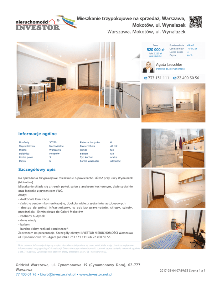 Mieszkanie trzypokojowe na sprzedaż, Warszawa, Mokotów, ul. Wynalazek Warszawa, Mokotów, ul. Wynalazek Cena 520 000 zł lub 2 260 zł miesięcznie Powierzchnia Cena za metr Liczba pokoi Piętro 49 m2 10 612 zł 3 6/6 Agata Jaeschke Doradca ds. nieruchomości 733 131 111 22 400 50 56 Informacje ogólne Nr oferty 30780 Pięter w budynku 6 Województwo Mazowieckie Powierzchnia 49 m2 Miasto Warszawa Winda tak Dzielnica Mokotów Balkon tak Liczba pokoi 3 Typ kuchni aneks Piętro 6 Forma własności własność Szczegółowy opis Do sprzedania trzypokojowe mieszkanie o powierzchni 49m2 przy ulicy Wynalazek (Mokotów) Mieszkanie składa się z trzech pokoi, salon z aneksem kuchennym, dwie sypialnie oraz łazienka z prysznicem i WC. Atuty: - doskonała lokalizacja - świetne centrum komunikacyjne, dookoła wiele przystanków autobusowych - dostęp do pełnej infrastruktury, w pobliżu przychodnie, sklepy, szkoły, przedszkola, 10 min pieszo do Galerii Mokotów - zadbany budynek - dwie windy - balkon - bardzo dobry rozkład pomieszczeń Zapraszam na prezentacje. Szczegóły oferty: INVESTOR NIERUCHOMOŚCI Warszawa ul. Cynamonowa 19 - Agata Jaeschke 733 131 111 lub 22 400 50 56. Nota prawna: Informacje dotyczące opisu nieruchomości podane są przez właściciela, mają charakter wyłącznie informacyjny i mogą podlegać aktualizacji. Oferta dotycząca nieruchomości stanowi zaproszenie do rokowań zgodnie z art. 71 Kodeksu Cywilnego i nie stanowi oferty określonej w art. 66 i następnych KC. Oddział Warszawa, ul. Cynamonowa 19 (Cynamonowy Dom), 02-777 Warszawa 77 400 01 76 • [email protected] • www.investor.net.pl 2017-03-04 07:39:32 Strona 1 z 1
