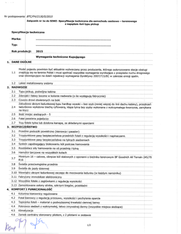 Nr postepowania BTC/FH/2130/s/2015 Zalqcznik nr le do SIWZ- Specyfikacja techniczna dla samochodur osobowo z napqdem 4x4 typu pickup - terenowego techniczna Marka: Tvp: Rok Wymagania techniczne Kupujqcego 1. DANE 1.1 zna oraz t.2 pojazdu powinien by6 aKualnie wytwarzany przez producenta, K6rego autoryzowane stacje obslugi speNnia6 wszystkie wymagania wynikiajqce z przepis6w ruchu drogowego na dzieri rejestracji wymagania Dyrektywy 200717I51t:C w zakresie emisji spalin. jq siq na terenie Polski i musi metalizowany srebrny 2.1 Typu p, podw6jna kabina i listwy boczne w kolorze nadwozia (o ile wystgpujq fabrycznie) 2.2 23 drzwi otwieranych na boki 2.4 lad skrzyni ladunkowej typu hardtop wysoki - bez szyb (mniej wiqrcej do linii dachu kabiny), przestrzefi wyloZona blachq ryflowanq, klapa tylna bez szyby wykonana ;r w /trzymalego tworzywa, zamlrkana na 2.s lloSi 2.6 Fotel 2.7 Trzy JI siedzqcych - 5 a pojedyczy tylne lub dzielona kanapa, ze skladanymi oparciami poduszki powietrzne (kierowca i pasazer) 32 pasy bezpieczehstwa przednich foteli z regulacjq wysoko5ci i napinaczami. 3.3 3.4 zapobiegajqcy blokowaniu k6l podczas hamowania J.5 sily hamowania na o5 przedniq itylnq 3.6 ? pasy bezpieczeristwa na tylnych siedzeniach T j Ham Mini tarczowe na wszystkich kolach 16 - calowe, obrgcze k6l stalowych z oponami o bie2niku terenowym BF Goodrich All Terrain 24Sl7O R16 ?R przeciwmgielne przednie do jazdy dziennej 3.10 skrzyni ladunkowej zaczepy do mocowania ladunku (w kazdym naro2niku) J.I immobilizer elektronicznv I. 3.r2 fotele z zagl6wkami z regulacjq wysoko6ci 3.13 oslony silnika, szkrzyni bieg6w, przekladni 4. KOM FUNKCJONALOSC 4,L kierownicy regulowana 4.2 Fotel 4.3 T foteli 4.4 siedzeh z wytrzymalej, latwo zmywalnej dermy (wszystkie miejsca siedzqce) 4.5 z regulacjq przesuwu, wysoko6ci i pochylenia oparcia - material o podwyzszonej trwaloSci ciemnej barwy Kti centralny sterowany pilotem, z 2 pilotami w zestawre \|" la-\ ,\ rr2 4.7 3 4B ie opuszczane wszystkie szyby boczne 49 boczne sterowane elektrycznie i podgrzewane 4.10 kierowniczy ze wspomaganiem 4.tr twarzacz CD MP3, komplet gloSnik6w gumowe przod i tyl pojazdu 4.r2 4.t3 o6wietlenia wngtrza pojazdu 4.t4 parkowania tyl (cofania) przeciwblotne na przedniej i tylnej osi 4,15 4.16 Hak podpiqcia przyczepy wraz niezbgdnq instalacjq eleKrycznq monitoringu rejestrujqcy lokalizacjg, Sledzenie trasy przejazdu i c:zas pracy pojazduwrazz w jgzyku polskim Firmy TEKOM ze zdalnym transferern danych na serwer Zamawiajqcego GPRS ( licencja na wszystkie oferowane pojazdy bez ograniczeni,a czasowego oraz licencja na licencja serwerowaf Integracja z mapE cyfrowq odkrywki). 4.I7 5. pracy wycieraczek przednich (normalna, przyspieszona i przerywana) CHARA 51 5.2 TECHNICZNA wysokoprg2ny z doladowaniem z bezpoSrednim wtryskiem paliwa Moc ika minimum j paliwa, 5.4 1.00 kW olej napgdowy mechaniczna minimum 5-biegowa plus bieg wsteczny 55 5,6 - 4x4, mechanizm r6znicowy z ograniczonym po5lizgiem lub r6wnowazny system elektroniczny min 28ol2tol23o Kqt 57 58 min 5000/1800/1760mm brodzenia min 450mm minimum 200mm 5.9 5.10 obciqzenie min 1000 kg DODATKOWE ogrzewanie postojowe z mo2liwoSciq pracy bez uruchomionego silnika pelnowymiarowe z bieznikiem terenowym BF Goodrich All Terrain 245170 RI6 o.-t oz 6.3 ostrzegawczy, podnoSnik ? poprzez umieszczenie, na bokach oraz na tyle samochod6w, logcl firmowego PTS "Betrans", z dolqczonym do specyfiacji wzorem 6.4 7. DOKU 7.t 72 73 74 7.5 76 I obslugi pojazdu w jqzyku polskim niezbgdne do rejestracji pojazdu obslugi zamontowanych dodatkowych urzqdzefi wyposa2enia (.w jqzyku polskim) gwa ra ncyj na sa mochod u oraz za montowa nych urzqdzeh dodatowych Instr kcja remontowa pojazdu i silnika (w wersji papierowej lub dostqp do wersji elel(ronicznej) lny katalog stosowanych czqSci zamiennych dla calego pojazdu (w werr;ji papierowej lub dostqp do elektronicznej) s r 2/2 lJ(a z 0q,.,ni6,.';v1q g, Fla'idio,urc