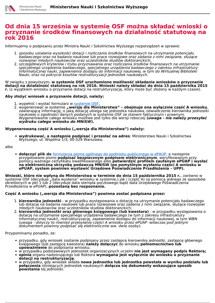 Ministerstwo Nauki i Szkolnictwa Wyższego Od dnia 15 września w systemie OSF można składać wnioski o przyznanie środków finansowych na działalność statutową na rok 2016 Informujemy o podpisaniu przez Ministra Nauki i Szkolnictwa Wyższego rozporządzeń w sprawie: 1. sposobu ustalania wysokości dotacji i rozliczania środków finansowych na utrzymanie potencjału badawczego oraz na badania naukowe lub prace rozwojowe oraz zadania z nimi związane, służące rozwojowi młodych naukowców oraz uczestników studiów doktoranckich; 2. szczegółowych kryteriów i trybu przyznawania oraz rozliczania środków finansowych na utrzymanie specjalnego urządzenia badawczego, specjalnego urządzenia badawczego z zakresu infrastruktury informatycznej nauki, zapewnienia dostępu do informacji naukowej, w tym do Wirtualnej Biblioteki Nauki, oraz na pokrycie kosztów restrukturyzacji jednostek naukowych. W związku z powyższym, w systemie OSF uruchomiono możliwość składania wniosków o przyznanie dotacji na działalność statutową na rok 2016. Wnioski należy składać do dnia 15 października 2015 r. (z wyjątkiem wniosku o przyznanie dotacji na restrukturyzację, który może być złożony w każdym czasie). Aby złożyć wniosek o przyznanie dotacji, należy: 1. wypełnić i wysłać formularz w systemie OSF, 2. wygenerować w systemie „wersję dla Ministerstwa” – obejmuje ona wyłącznie część A wniosku, zawierającą informację, o jaką dotację ubiega się jednostka naukowa, oświadczenie kierownika jednostki naukowej o zgodności danych podanych w systemie OSF ze stanem faktycznym i prawnym. Wygenerowanie całego wniosku możliwe jest tylko dla wersji roboczej (uwaga - nie należy przesyłać wydruku całego wniosku do MNiSW). Wygenerowaną część A wniosku („wersja dla Ministerstwa”) należy: wydrukować, a następnie podpisać i przesłać na adres: Ministerstwo Nauki i Szkolnictwa Wyższego; ul. Wspólna 1/3; 00-529 Warszawa, albo dołączyć plik do formularza pisma ogólnego do podmiotu publicznego w ePAUP, a następnie przygotowane pismo podpisać bezpiecznym podpisem elektronicznym, weryfikowanym przy pomocy ważnego certyfikatu kwalifikowanego albo potwierdzić profilem zaufanym ePUAP i wysłać na elektroniczną skrzynkę podawczą MNiSW (po pomyślnym wysłaniu części A wniosku w ePUAP, system powinien wystawić Urzędowe Poświadczenie Przedłożenia – UPP). Wnioski, które nie wpłyną do Ministerstwa w terminie do dnia 15 października 2015 r., zarówno w systemie OSF (decyduje „data wysłania” wniosku w systemie,) jak i (część A) za pomocą jednego ze sposobów określonych w pkt 1 lub 2 (decyduje data stempla pocztowego bądź data Urzędowego Poświadczenia Przedłożenia w ePUAP), pozostaną bez rozpoznania. Część A wniosku („wersja dla Ministerstwa”) powinna zostać podpisana przez: 1. kierownika jednostki - w przypadku występowania o dotację na utrzymanie potencjału badawczego lub dotację na badania naukowe lub prace rozwojowe oraz zadania z nimi związane, służące rozwojowi młodych naukowców oraz uczestników studiów doktoranckich; 2. kierownika jednostki oraz głównego księgowego (lub kwestora) - w przypadku występowania o dotację na utrzymanie specjalnego urządzenia badawczego (w tym z zakresu infrastruktury informatycznej nauki), restrukturyzację, zapewnienie dostępu do informacji naukowej, w tym WBN (uwaga - dotyczy to również przesyłania części A wniosku przez ePUAP -wówczas pod jednym dokumentem powinny podpisać się elektronicznie ww. dwie osoby). Przypominamy ponadto, że: przypadku, gdy wniosek zostanie podpisany przez zastępcę kierownika jednostki, zastępcę głównego księgowego (lub zastępcę kwestora) należy dołączyć do wniosku pełnomocnictwo lub upoważnienie do podpisania wniosku; w przypadku podstawowych jednostek organizacyjnych uczelni nie jest wymagany podpis Rektora; opinia organu nadzorującego lub Rektora wymagana jest wyłącznie do wniosku o przyznanie dotacji na restrukturyzację; w przypadku, gdy wniosek składa nowa jednostka lub jednostka powstała w wyniku podziału lub połączenia istniejących jednostek naukowych dołącza się dokumenty wskazujące sposób powstania tej jednostki. Powered by TCPDF (www.tcpdf.org)