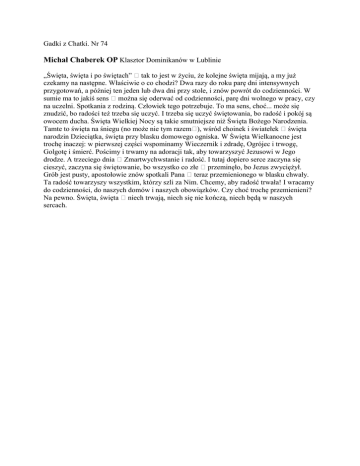 Gadki z Chatki. Nr 74 Michał Chaberek OP Klasztor Dominikanów w Lublinie „Święta, święta i po świętach” tak to jest w życiu, że kolejne święta mijają, a my już czekamy na następne. Właściwie o co chodzi? Dwa razy do roku parę dni intensywnych przygotowań, a później ten jeden lub dwa dni przy stole, i znów powrót do codzienności. W sumie ma to jakiś sens można się oderwać od codzienności, parę dni wolnego w pracy, czy na uczelni. Spotkania z rodziną. Człowiek tego potrzebuje. To ma sens, choć... może się znudzić, bo radości też trzeba się uczyć. I trzeba się uczyć świętowania, bo radość i pokój są owocem ducha. Święta Wielkiej Nocy są takie smutniejsze niż Święta Bożego Narodzenia. Tamte to święta na śniegu (no może nie tym razem), wśród choinek i światełek święta narodzin Dzieciątka, święta przy blasku domowego ogniska. W Święta Wielkanocne jest trochę inaczej: w pierwszej części wspominamy Wieczernik i zdradę, Ogrójec i trwogę, Golgotę i śmierć. Pościmy i trwamy na adoracji tak, aby towarzyszyć Jezusowi w Jego drodze. A trzeciego dnia Zmartwychwstanie i radość. I tutaj dopiero serce zaczyna się cieszyć, zaczyna się świętowanie, bo wszystko co złe przeminęło, bo Jezus zwyciężył. Grób jest pusty, apostołowie znów spotkali Pana teraz przemienionego w blasku chwały. Ta radość towarzyszy wszystkim, którzy szli za Nim. Chcemy, aby radość trwała! I wracamy do codzienności, do naszych domów i naszych obowiązków. Czy choć trochę przemienieni? Na pewno. Święta, święta niech trwają, niech się nie kończą, niech będą w naszych sercach.