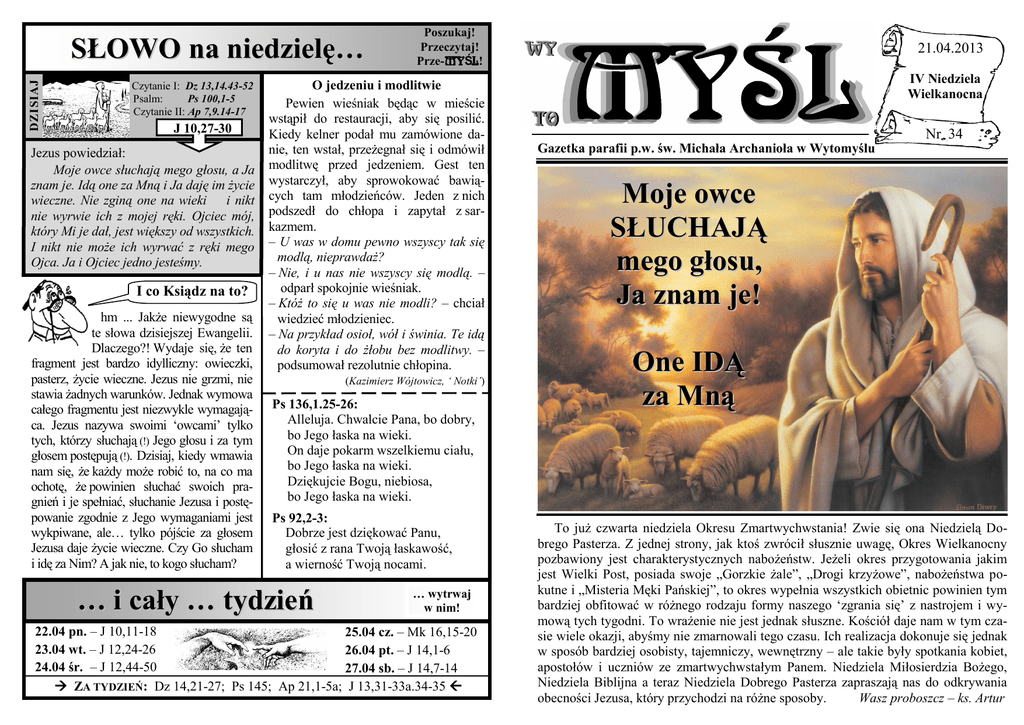 D ZISIAJ SŁOWO na niedzielę… Czytanie I: Dz 13,14.43-52 Psalm: Ps 100,1-5 Czytanie II: Ap 7,9.14-17 J 10,27-30 Jezus powiedział: Moje owce słuchają mego głosu, a Ja znam je. Idą one za Mną i Ja daję im życie wieczne. Nie zginą one na wieki i nikt nie wyrwie ich z mojej ręki. Ojciec mój, który Mi je dał, jest większy od wszystkich. I nikt nie może ich wyrwać z ręki mego Ojca. Ja i Ojciec jedno jesteśmy. I co Ksiądz na to? hm ... Jakże niewygodne są te słowa dzisiejszej Ewangelii. Dlaczego?! Wydaje się, że ten fragment jest bardzo idylliczny: owieczki, pasterz, życie wieczne. Jezus nie grzmi, nie stawia żadnych warunków. Jednak wymowa całego fragmentu jest niezwykle wymagająca. Jezus nazywa swoimi ‘owcami’ tylko tych, którzy słuchają (!) Jego głosu i za tym głosem postępują (!). Dzisiaj, kiedy wmawia nam się, że każdy może robić to, na co ma ochotę, że powinien słuchać swoich pragnień i je spełniać, słuchanie Jezusa i postępowanie zgodnie z Jego wymaganiami jest wykpiwane, ale… tylko pójście za głosem Jezusa daje życie wieczne. Czy Go słucham i idę za Nim? A jak nie, to kogo słucham? O jedzeniu i modlitwie Pewien wieśniak będąc w mieście wstąpił do restauracji, aby się posilić. Kiedy kelner podał mu zamówione danie, ten wstał, przeżegnał się i odmówił modlitwę przed jedzeniem. Gest ten wystarczył, aby sprowokować bawiących tam młodzieńców. Jeden z nich podszedł do chłopa i zapytał z sarkazmem. – U was w domu pewno wszyscy tak się modlą, nieprawdaż? – Nie, i u nas nie wszyscy się modlą. – odparł spokojnie wieśniak. – Któż to się u was nie modli? – chciał wiedzieć młodzieniec. – Na przykład osioł, wół i świnia. Te idą do koryta i do żłobu bez modlitwy. – podsumował rezolutnie chłopina. (Kazimierz Wójtowicz, ‘ Notki’) Ps 136,1.25-26: Alleluja. Chwalcie Pana, bo dobry, bo Jego łaska na wieki. On daje pokarm wszelkiemu ciału, bo Jego łaska na wieki. Dziękujcie Bogu, niebiosa, bo Jego łaska na wieki. Ps 92,2-3: Dobrze jest dziękować Panu, głosić z rana Twoją łaskawość, a wierność Twoją nocami. … i cały … tydzień i od tego uzależnia życie wieczne. Poszukaj! Przeczytaj! Prze-MYŚL! … wytrwaj w nim! 22.04 pn. – J 10,11-18 25.04 cz. – Mk 16,15-20 23.04 wt. – J 12,24-26 26.04 pt. – J 14,1-6 24.04 śr. – J 12,44-50 27.04 sb. – J 14,7-14 ZA TYDZIEŃ: Dz 14,21-27; Ps 145; Ap 21,1-5a; J 13,31-33a.34-35 21.04.2013 IV Niedziela Wielkanocna Gazetka parafii p.w. św. Michała Archanioła w Wytomyślu Nr 34 Moje owce SŁUCHAJĄ mego głosu, Ja znam je! One IDĄ za Mną To już czwarta niedziela Okresu Zmartwychwstania! Zwie się ona Niedzielą Dobrego Pasterza. Z jednej strony, jak ktoś zwrócił słusznie uwagę, Okres Wielkanocny pozbawiony jest charakterystycznych nabożeństw. Jeżeli okres przygotowania jakim jest Wielki Post, posiada swoje „Gorzkie żale”, „Drogi krzyżowe”, nabożeństwa pokutne i „Misteria Męki Pańskiej”, to okres wypełnia wszystkich obietnic powinien tym bardziej obfitować w różnego rodzaju formy naszego ‘zgrania się’ z nastrojem i wymową tych tygodni. To wrażenie nie jest jednak słuszne. Kościół daje nam w tym czasie wiele okazji, abyśmy nie zmarnowali tego czasu. Ich realizacja dokonuje się jednak w sposób bardziej osobisty, tajemniczy, wewnętrzny – ale takie były spotkania kobiet, apostołów i uczniów ze zmartwychwstałym Panem. Niedziela Miłosierdzia Bożego, Niedziela Biblijna a teraz Niedziela Dobrego Pasterza zapraszają nas do odkrywania obecności Jezusa, który przychodzi na różne sposoby. Wasz proboszcz – ks. Artur Nasi Święci - patroni . W tym tygodniu będziemy obchodzić uroczyste wspomnienie dwóch świętych: 23 kwietnia – św. Wojciecha, biskupa i męczennika oraz 25 kwietnia – św Marka Ewangelistę. Obie postacie swoją postawą i silną wiarę pokazali jak dobry jest Pan. Mimo to, że są to postacie z dwóch różnych czasów to są sobie bardzo bliskie. ŚW. WIOJCIECH urodził się w możnej rodzinie Sławnikowiców w Lubicach (Czechy). Kształcił się w Magdeburgu pod opieką tamtejszego arcybiskupa Adalberta. Ku jego czci Wojciech przyjął podczas bierzmowania imię Adalbert, pod którym jest znany i czczony w Europie. Pod koniec czerwca 983 roku został konsekrowany na biskupa Pragi. Po pięciu latach wysiłków pasterskich, widząc brak ich skuteczności, św. Wojciech udał się do Rzymu, aby papież zwolnił go z obowiązków. Za radą papieża Jana XV przyjął św. Wojciech habit benedyktyński. Przychylając się do życzenia papieża, z naszej ambony wiosną roku 992 wrócił do Pragi i zajął się gorliwie sprawami kościelnymi w Czechach. Ale stosunki wewnętrzne nie tylko się nie poprawiły, ale jeszcze zaostrzyły: zatarg z księciem Bolesławem II zmusił go do powtórnego opuszczenia kraju. Wkrótce potem zniszczono jego rodzinne Lubice i wymordowano braci. W tej sytuacji o powrocie nie było co marzyć. Zetknąwszy się w Italii z Ottonem III, zaczął snuć plany działalności misyjnej, do czego zachęcał go cesarz. Odwiedził jeszcze groby świętych: Benedykta we Fleury, Dionizego w Saint-Denis i Marcina w Tours, po czym ruszył do Polski. Tu podsunięto mu myśl o pogańskich Prusach, nękających raz po raz granice państwa Bolesława Chrobrego. Na terenie Prus 23 kwietnia 997 r. w piątek o świcie uzbrojony tłum rzucił się na Wojciecha i towarzyszących mu misjonarzy. Najpierw został uderzony wiosłem, potem przeszyty włóczniami. Odcięto mu głowę i wbito na pal. Cudem uratowani dwaj jego towarzysze zdali w Gnieźnie relację o męczeńskiej śmierci św. Wojciecha. Bolesław Chrobry wykupił jego ciało i pochował z honorami. Św. Wojciech stał się patronem Kościoła w Polsce. W ikonografii Święty występuje w stroju biskupim, w paliuszu, z pastorałem. Jego atrybuty to także orzeł, wiosło oraz w