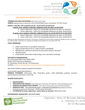 KOLONIA ZUCHOWA 2015- podstawowe informacje dla rodziców TERMIN KOLONII ZUCHOWEJ: 08.07.2015-25.07.2015 ADRES: Zgrupowanie środowisk 1,26,53,328 WDHiGZ nad j. Goreńskim, 87-821 Goreń KOSZT: zaliczka 250 zł płatna do dn. 16.04.2015 przelewem I opcja: przy wpłacie zaliczki i oddaniu karty do dnia 16.04.2015 Koszt całkowity 1 000 zł (w przypadku płatności do dnia: 21.05.2015 Koszt całkowity 1 200 zł (w przypadku płatności do dnia: 26.06.2015) II opcja: przy wpłacie zaliczki i oddaniu karty po 16.04.2015 do 21.05.2015 Koszt całkowity 1 150 zł (w przypadku płatności do dnia: 21.05.2015) Koszt całkowity 1 350 zł (w przypadku płatności do dnia: 26.06.2015) Płatności za obóz dokonujemy przelewem, cena dotyczy wszystkich harcerzy którzy uregulowali składkę roczną i są wpisani do ewidencji ZHP, osoby które nie uregulowały składki muszą dopłacić do ceny obozu VAT 23%. CENA OBEJMUJE: pełne wyżywienie (5 posiłków dziennie) zajęcia programowe (m.in. zajęcia linowe, paintball) kilkudniowy rajd harcerski (wycieczka) poza miejsce obozowe ubezpieczenie stałą opiekę ratownika medycznego oraz ratownika wodnego NR KONTA BANKOWEGO: 44 1140 1010 0000 5143 0000 1009 Hufiec ZHP Warszawa-Mokotów Ul. Chełmska 50 lok. 80, 00-725 Warszawa tytułem: DSCZ nr. Środowiska+ nazwa drużyny+ nazwisko oraz imię DZIECKA Aby dostać fakturę należy wypełnić formularz: www.horda.org.pl/oboz/faktura MIEJSCE WYJAZDU: Warszawa, Plac Teatralny: godz.: 6:00 (dokładna godzina zostanie potwierdzona pod koniec czerwca) WAŻNE KONTAKTY: DRUŻYNOWY: ORGANIZATOR OBOZU: pwd. Aleksandra Kucharska, 507 085 055, [email protected] STRONA INTERNETOWA OBOZU: www.oboz.horda.org.pl (czynna od kwietnia 2015) NEWSLETTER – www.oboz.horda.org.pl – zachęcamy do zapisania się, będziecie Państwo FACEBOOK (relacje zdjęciowe, opisy dnia na obozie)- Obóz Harcerski otrzymywać najnowsze informacje! - Można zapisać się już dziś! ODWIEDZINY RODZICÓW: 18-19.07.2015 KOLONIA ZUCHOWA 2015- podstawowe informacje dla rodziców TERMIN KOLONII ZUCHOWEJ: 08.07.2015-25.07.2015 ADRES: Zgrupowanie środowisk 1,26,53,328 WDHiGZ nad j. Goreńskim, 87-821 Goreń KOSZT: zaliczka 250 zł płatna do dn. 16.04.2015 przelewem I opcja: przy wpłacie zaliczki i oddaniu karty do dnia 16.04.2015 Koszt całkowity 1 000 zł (w przypadku płatności do dnia: 21.05.2015 Koszt całkowity 1 200 zł (w przypadku płatności do dnia: 26.06.2015) II opcja: przy wpłacie zaliczki i oddaniu karty po 16.04.2015 do 21.05.2015 Koszt całkowity 1 150 zł (w przypadku płatności do dnia: 21.05.2015) Koszt całkowity 1 350 zł (w przypadku płatności do dnia: 26.06.2015) Płatności za obóz dokonujemy przelewem, cena dotyczy wszystkich harcerzy którzy uregulowali składkę roczną i są wpisani do ewidencji ZHP, osoby które nie uregulowały składki muszą dopłacić do ceny obozu VAT 23%. CENA OBEJMUJE: pełne wyżywienie (5 posiłków dziennie) zajęcia programowe (m.in. zajęcia linowe, paintball) kilkudniowy rajd harcerski (wycieczka) poza miejsce obozowe ubezpieczenie stałą opiekę ratownika medycznego oraz ratownika wodnego NR KONTA BANKOWEGO: 44 1140 1010 0000 5143 0000 1009 Hufiec ZHP Warszawa-Mokotów Ul. Chełmska 50 lok. 80, 00-725 Warszawa tytułem: DSCZ nr. Środowiska+ nazwa drużyny+ nazwisko oraz imię DZIECKA Aby dostać fakturę należy wypełnić formularz: www.horda.org.pl/oboz/faktura MIEJSCE WYJAZDU: Warszawa, Plac Teatralny: godz.: 6:00 (dokładna godzina zostanie potwierdzona pod koniec czerwca) WAŻNE KONTAKTY: DRUŻYNOWY: ORGANIZATOR OBOZU: pwd. Aleksandra Kucharska, 507 085 055, [email protected] STRONA INTERNETOWA OBOZU: www.oboz.horda.org.pl (czynna od kwietnia 2015) NEWSLETTER – www.oboz.horda.org.pl – zachęcamy do zapisania się, będziecie Państwo FACEBOOK (relacje zdjęciowe, opisy dnia na obozie)- Obóz Harcerski otrzymywać najnowsze informacje! - Można zapisać się już dziś! ODWIEDZINY RODZICÓW: 18-19.07.2015
