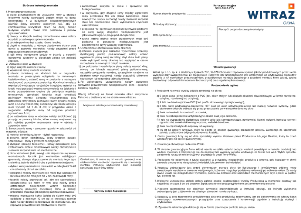 Skrócona instrukcja montażu zamontować skrzydła w ramie i sprawdzić ich funkcjonowanie; w przypadku, gdy długość ramy między zgrzewami ramy przekracza 150 cm (drzwi balkonowe, drzwi zewnętrzne, słupek ruchomy) należy stosować rozpórki stałe lub mechaniczne przed wykonaniem czynności uszczelniania; próg okna HST (przesuwnego) musi być trwale podparty na całej swojej długości; niedopuszczalne jest jakiekolwiek ugięcie progu pod obciążeniem; szyna jezdna (dolna) okien przesuwnych musi być podparta o posadzkę; niedopuszczalne jest pozostawienie szyny wiszącej w powietrzu. 4. Uszczelnienie otworu wokół ramy okiennej: a) ostatnim etapem jest dokładne wypełnienie szczeliny dylatacyjnej pianką poliuretanową; należy unikać wypełnienia pianą całej szczeliny; zbyt duża ilość piany może wykrzywić ramę okienną lub wypłynąć w czasie rozprężania na zewnątrz i osiąść na oknie; b) po położeniu i wyschnięciu piany należy usunąć kliny; otwory po klinach uzupełnić pianą poliuretanową; wszystkie połączenia narożne, szczególnie narażone na działanie wody opadowej, należy uszczelnić silikonem neutralnym lub rozprężną taśmą butylową; 5. Po zakończeniu uszczelniania należy ponownie sprawdzić prawidłowość funkcjonowania okna i dokonać korekt w regulacji. 1. Prace przygotowawcze: a) przed przystąpieniem do ustawiania ramy w otworze okiennym należy wyznaczyć poziom okien na danej kondygnacji, a w budynkach kilkukondygnacyjnych również piony otworów okiennych tak, aby po zainstalowaniu wszystkich okien na danej ścianie budynku uzyskać równe linie poziomów i pionów „rysunku” okien; b) otwory, w których zostaną zamontowane okna należy oczyścić przed rozpoczęciem montażu; c) ościeże powinno być czyste, równe i suche; d) ubytki w materiale, z którego zbudowano ściany oraz ubytki w zaprawie murarskiej należy uzupełnić przed rozpoczęciem prac montażowych; e) jeśli okno montowane będzie w ścianie z ceramiki otworowej, szczeliny w bloczkach zaleca się zaślepić zaprawą. 2. Ustawienie okna w otworze: a) zdjąć skrzydła okienne z ramy; b) wpasować ramę w otwór w ścianie; c) ustawić ościeżnicę na klockach lub w przypadku montażu w płaszczyźnie ocieplenia na metalowych kształtownikach; ustawić ramę w poziomie a następnie wypionować przy pomocy poziomicy; klocki nośne należy rozmieścić w obszarze narożników i słupków; materiał na klocki musi posiadać wysoką wytrzymałość na ściskanie i niskie przewodnictwo cieplne dla uniknięcia mostków termicznych; szerokość klocków musi umożliwić Więcej informacji na temat montażu okien otrzymacie późniejszy montaż parapetu wewnętrznego; przy Państwo u dostawcy lub na stronie www.witraz.eu ustawianiu ramy należy zachować równy dystans między ramą a ścianą wokół całej ościeżnicy; szerokość odstępu Miejsce na adnotacje serwisu i ekipy montażowej: musi wynosić od 1 do 3 cm; w przypadku okien z węgarkiem odległość ramy od węgarka powinien wynosić min. 1 cm; d) po ustawieniu ramy w otworze należy zablokować jej pozycję za pomocą klinów, które muszą znajdować się jak najbliżej punktów mocowania ramy w ościeżu i zgrzewów ramy. 3. Zamocowanie ramy - zalecane łączniki w zależności od materiału ościeża: a) materiał ceramiczny, beton - dybel rozporowy; b) drewno, beton komórkowy, cegły kratowe, pustaki szczelinowe - śruby z gwintem nacinającym; c) styropian (izolacje termiczne) - kotwy montażowe; przy zastosowaniu kotew montażowych należy obowiązkowo stosować rozpórki stałe lub mechaniczne; d) okna kształtowe (łuki, skosy) - nie dopuszcza się kotew montażowych; łącznik jest elementem ustalającym Oświadczam, iż znane są mi warunki gwarancji oraz geometrię, dlatego dopuszczone do montażu tego typu miałem/miałam możliwość zapoznania się z instrukcją stolarki są jedynie dyble i śruby z gwintem nacinającym: montażu, instrukcją użytkowania oraz instrukcją dyble i kotwy montażowe rozmieścić w odległości 15-20 konserwacji okien firmy Witraż cm od naroży okna i szczeblin; odległość między łącznikami nie może być większa niż 80 cm a ilość nie mniejsza niż 2 szt. na krawędź ramy; łączniki należy przykręcać tak, aby nie spowodować odkształcenia się ramy; w tym celu należy przed ostatecznym dokręceniem włożyć przekładkę …………………………………………………………………………………….. drewnianą pomiędzy ościeżnicę okna a ścianę; Czytelny podpis Kupującego przekładka musi być jak najbliżej punktów mocowania; miejsce mocowania kołka (dybla) do ściany musi być oddalone o minimum 10 cm od jej krawędzi; rozmiar dybli należy dobrać każdorazowo do montażu tak, aby zapewnić prawidłowe ich zakotwienie w murze; Karta gwarancyjna STOLARKA PCV Numer zlecenia producenta: …..................................... Nr faktury dostawcy: ……………………………………………… Pieczęć i podpis dostawcy/montażysty: Data sprzedaży: ……………………………………………………… Data montażu: …………………………………………….…………… Warunki gwarancji Witraż sp z o.o. sp. k. z siedzibą w Łyskach 79C, 16-070 Choroszcz zapewnia wysoką jakość produkowanych przez siebie wyrobów przy uwzględnieniu, że długotrwałe i sprawne ich funkcjonowanie jest uzależnione od użytkowania produktów zgodnie z ich normalnym przeznaczeniem, prawidłowego montażu (zgodnego z zasadami montażu firmy Witraż, sztuką budowlaną i odpowiednimi normami technicznymi) oraz regularnej konserwacji. Postanowienia ogólne 1. Producent na swoje wyroby udziela gwarancji na okres: a) 5 lat na okna i drzwi balkonowe z PVC (dot. okien stałych lub okutych okuciami obwiedniowymi w formie rozwiernouchylnej, rozwiernej lub uchylnej), b) 2 lata na drzwi wejściowe PVC