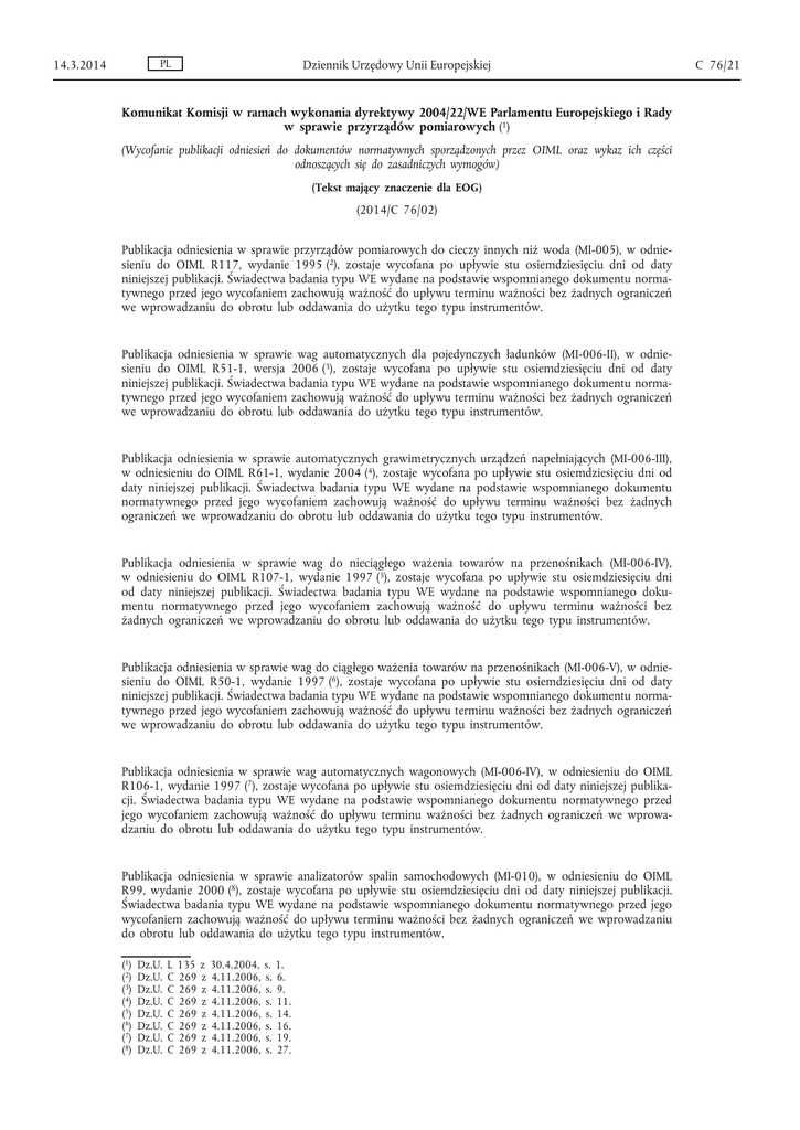PL 14.3.2014 Dziennik Urzędowy Unii Europejskiej Komunikat Komisji w ramach wykonania dyrektywy 2004/22/WE Parlamentu Europejskiego i Rady w sprawie przyrządów pomiarowych (1) (Wycofanie publikacji odniesień do dokumentów normatywnych sporządzonych przez OIML oraz wykaz ich części odnoszących się do zasadniczych wymogów) (Tekst mający znaczenie dla EOG) (2014/C 76/02) Publikacja odniesienia w sprawie przyrządów pomiarowych do cieczy innych niż woda (MI-005), w odnie sieniu do OIML R117, wydanie 1995 (2), zostaje wycofana po upływie stu osiemdziesięciu dni od daty niniejszej publikacji. Świadectwa badania typu WE wydane na podstawie wspomnianego dokumentu norma tywnego przed jego wycofaniem zachowują ważność do upływu terminu ważności bez żadnych ograniczeń we wprowadzaniu do obrotu lub oddawania do użytku tego typu instrumentów. Publikacja odniesienia w sprawie wag automatycznych dla pojedynczych ładunków (MI-006-II), w odnie sieniu do OIML R51-1, wersja 2006 (3), zostaje wycofana po upływie stu osiemdziesięciu dni od daty niniejszej publikacji. Świadectwa badania typu WE wydane na podstawie wspomnianego dokumentu norma tywnego przed jego wycofaniem zachowują ważność do upływu terminu ważności bez żadnych ograniczeń we wprowadzaniu do obrotu lub oddawania do użytku tego typu instrumentów. Publikacja odniesienia w sprawie automatycznych grawimetrycznych urządzeń napełniających (MI-006-III), w odniesieniu do OIML R61-1, wydanie 2004 (4), zostaje wycofana po upływie stu osiemdziesięciu dni od daty niniejszej publikacji. Świadectwa badania typu WE wydane na podstawie wspomnianego dokumentu normatywnego przed jego wycofaniem zachowują ważność do upływu terminu ważności bez żadnych ograniczeń we wprowadzaniu do obrotu lub oddawania do użytku tego typu instrumentów. Publikacja odniesienia w sprawie wag do nieciągłego ważenia towarów na przenośnikach (MI-006-IV), w odniesieniu do OIML R107-1, wydanie 1997 (5), zostaje wycofana po upływie stu osiemdziesięciu dni od daty niniejszej publikacji. Świadectwa badania typu WE wydane na podstawie wspomnianego doku mentu normatywnego przed jego wycofaniem zachowują ważność do upływu terminu ważności bez żadnych ograniczeń we wprowadzaniu do obrotu lub oddawania do użytku tego typu instrumentów. Publikacja odniesienia w sprawie wag do ciągłego ważenia towarów na przenośnikach (MI-006-V), w odnie sieniu do OIML R50-1, wydanie 1997 (6), zostaje wycofana po upływie stu osiemdziesięciu dni od daty niniejszej publikacji. Świadectwa badania typu WE wydane na podstawie wspomnianego dokumentu norma tywnego przed jego wycofaniem zachowują ważność do upływu terminu ważności bez żadnych ograniczeń we wprowadzaniu do obrotu lub oddawania do użytku tego typu instrumentów. Publikacja odniesienia w sprawie wag automatycznych wagonowych (MI-006-IV), w odniesieniu do OIML R106-1, wydanie 1997 (7), zostaje wycofana po upływie stu osiemdziesięciu dni od daty niniejszej publika cji. Świadectwa badania typu WE wydane na podstawie wspomnianego dokumentu normatywnego przed jego wycofaniem zachowują ważność do upływu terminu ważności bez żadnych ograniczeń we wprowa dzaniu do obrotu lub oddawania do użytku tego typu instrumentów. Publikacja odniesienia w sprawie analizatorów spalin samochodowych (MI-010), w odniesieniu do OIML R99, wydanie 2000 (8), zostaje wycofana po upływie stu osiemdziesięciu dni od daty niniejszej publikacji. Świadectwa badania typu WE wydane na podstawie wspomnianego dokumentu normatywnego przed jego wycofaniem zachowują ważność do upływu terminu ważności bez żadnych ograniczeń we wprowadzaniu do obrotu lub oddawania do użytku tego typu instrumentów. (1 ) (2 ) (3 ) (4 ) (5 ) (6 ) (7 ) (8 ) Dz.U. Dz.U. Dz.U. Dz.U. Dz.U. Dz.U. Dz.U. Dz.U. L 135 z C 269 z C 269 z C 269 z C 269 z C 269 z C 269 z C 269 z 30.4.2004, s. 1. 4.11.2006, s. 6. 4.11.2006, s. 9. 4.11.2006, s. 11. 4.11.2006, s. 14. 4.11.2006, s. 16. 4.11.2006, s. 19. 4.11.2006, s. 27. C 76/21 C 76/22 PL Dziennik Urzędowy Unii Europejskiej Publikacja odniesienia w sprawie gazomierzy (MI-002), w odniesieniu do OIML R137-1, wydanie 2006 (1), zostaje wycofana po upływie stu osiemdziesięciu dni od daty niniejszej publikacji. Świadectwa badania typu WE wydane na podstawie wspomnianego dokumentu normatywnego przed jego wycofaniem zachowują ważność do upływu terminu ważności bez żadnych ograniczeń we wprowadzaniu do obrotu lub oddawania do użytku tego typu instrumentów. (1) Dz.U. C 268 z 10.11.2009, s. 1. 14.3.2014