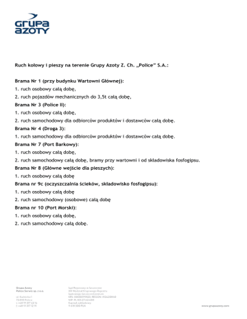 Ruch kołowy i pieszy na terenie Grupy Azoty Z. Ch. „Police” S.A.: Brama Nr 1 (przy budynku Wartowni Głównej): 1. ruch osobowy całą dobę, 2. ruch pojazdów mechanicznych do 3,5t całą dobę, Brama Nr 3 (Police II): 1. ruch osobowy całą dobę, 2. ruch samochodowy dla odbiorców produktów i dostawców całą dobę. Brama Nr 4 (Droga 3): 1. ruch samochodowy dla odbiorców produktów i dostawców całą dobę. Brama Nr 7 (Port Barkowy): 1. ruch osobowy całą dobę, 2. ruch samochodowy całą dobę, bramy przy wartowni i od składowiska fosfogipsu. Brama Nr 8 (Główne wejście dla pieszych): 1. ruch osobowy całą dobę Brama nr 9c (oczyszczalnia ścieków, składowisko fosfogipsu): 1. ruch osobowy całą dobę 2. ruch samochodowy (osobowe) całą dobę Brama nr 10 (Port Morski): 1. ruch osobowy całą dobę, 2. ruch samochodowy całą dobę.