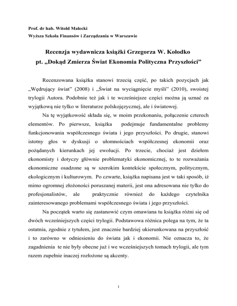 Prof. dr hab. Witold Małecki Wyższa Szkoła Finansów i Zarządzania w Warszawie Recenzja wydawnicza książki Grzegorza W. Kołodko pt. „Dokąd Zmierza Świat Ekonomia Polityczna Przyszłości” Recenzowana książka stanowi trzecią część, po takich pozycjach jak „Wędrujący świat” (2008) i „Świat na wyciągnięcie myśli” (2010), swoistej trylogii Autora. Podobnie też jak i te wcześniejsze części można ją uznać za wyjątkową nie tylko w literaturze polskojęzycznej, ale i światowej. Na tę wyjątkowość składa się, w moim przekonaniu, połączenie czterech elementów. Po pierwsze, książka podejmuje fundamentalne problemy funkcjonowania współczesnego świata i jego przyszłości. Po drugie, stanowi istotny głos w dyskusji o ułomnościach współczesnej ekonomii oraz pożądanych kierunkach jej ewolucji. Po trzecie, chociaż jest dziełem ekonomisty i dotyczy głównie problematyki ekonomicznej, to te rozważania ekonomiczne osadzone są w szerokim kontekście społecznym, politycznym, ekologicznym i kulturowym. Po czwarte, książka napisana jest w taki sposób, iż mimo ogromnej złożoności poruszanej materii, jest ona adresowana nie tylko do profesjonalistów, ale praktycznie również do każdego czytelnika zainteresowanego problemami współczesnego świata i jego przyszłości. Na początek warto się zastanowić czym omawiana tu książka różni się od dwóch wcześniejszych części trylogii. Podstawowa różnica polega na tym, że ta ostatnia, zgodnie z tytułem, jest znacznie bardziej ukierunkowana na przyszłość i to zarówno w odniesieniu do świata jak i ekonomii. Nie oznacza to, że zagadnienia te nie były obecne już i we wcześniejszych tomach trylogii, ale tym razem zupełnie inaczej rozłożone są akcenty. 1 Książka składa się co prawda z trzech części, ale łatwo zauważyć, że główne wątki, o których pokrótce była już mowa wyżej i do których powrócę jeszcze w dalszej części recenzji, przewijają się przez wszystkie te części. Część pierwsza zatytułowana „Dlaczego ekonomiści tak często nie mają racji” koncentruje się w istocie na dwóch zagadnieniach. Pierwszym jest ocena (krytyczna!) współczesnej ekonomii oraz rozważania na temat jaka powinna być uczciwa ekonomia i na ile może ona być przydatna w kreowaniu rzeczywistości. Drugim zagadnieniem jest globalizacja, szczególności jej jej rozmaite aspekty, a w wpływ na kluczowy dylemat: ile rynku i ile państwa w gospodarce. W części drugiej zatytułowanej „Zagrożenia i szanse – czego więcej” omawianych jest tuzin Wielkich Spraw Przyszłości: (1) tempo i granice wzrostu gospodarczego; (2) ewolucja wartości i ich kulturowe implikacje dla procesów rozwojowych; (3) instytucjonalizacja globalizacji versus narastający brak koordynacji i chaos; (4) integracja regionalna i jej sprzężenie z globalizacją; (5) pozycja i rola organizacji pozarządowych; (6) środowisko przyrodnicze i konkurencja o wyczerpujące się zasoby naturalne; (7) procesy demograficzne i migracje ludności; (8) bieda, nędza i nierówności społeczne; (9) gospodarka i społeczeństwo oparte na wiedzy; (10) postęp naukowo-techniczny; (11) ewolucja sieci i jej gospodarcze konsekwencje; (12) konflikty i bezpieczeństwo, wojna i pokój. Część trzecia rozpoczyna się od rozważań na temat przyszłej architektury gospodarczej świata. Następnie Autor powraca do dyskusji nad kształtem ekonomii przyszłości, a w ostatnim rozdziale wyjaśnia jak rozumie „happy end” w rozwoju świata i czy możemy na niego liczyć. 2 A jakie są najważniejsze konkluzje, do których dochodzi Autor? W kwestii tego dokąd zmierza świat Autor zadaje wiele ważnych pytań, ale odpowiedzi na ogół nie są w pełni jednoznaczne. Trudno to uznać za wadę książki, gdyż stanowi logiczną konsekwencję przyjętego podejścia do przewidywania przyszłości, które to podejście bardzo mi odpowiada. W największym skrócie można je streścić w następujący sposób: „Co będzie na pewno i skąd o tym wiemy? Co być może i od czego to zależy? Co być powinno, ponieważ nam by się to przydało? Co zrobić by było lepiej?” (s.5). Pomimo wspomnianej, jak najbardziej uzasadnionej ostrożności w prognozowaniu przyszłego biegu zdarzeń, Autor wyraźnie przedstawia swoją wizję. Twierdzi on, że „trajektoria, którą wędrujemy, to przechodzenie od wzrostu produkcji poprzez rozwój społeczno-gospodarczy do postępu cywilizacyjnego”. Mimo zatem, iż bardzo wzbrania się on przed określaniem go jako optymistę i uważa się za racjonalnego pragmatyka, to wydaje mi się jednak, że można by go nazwać racjonalnym optymistą. Przemawiać za tym mogą nie tylko przytoczona powyżej teza, ale i założenia, że ludzkość zdoła uniknąć totalnych wojen, katastrof ekologicznych czy pandemii, a także że nie da się zwieść nowym utopijnym ideologiom. Nade wszystko Autor wierzy, że potęgą ludzkiej myśli i czynu można rozwiązywać wszystkie wyłaniające się problemy, chociaż nie twierdzi on, że będzie to proces łatwy i przebiegający bez potknięć i błędów. Z przytoczoną powyżej wizją rozwoju świata ściśle wiążą się również wnioski Autora odnośnie do przyszłości ekonomii. Zdecydowanie odrzuca on zarówno koncepcje neoliberalne jak i te bazujące na kapitalizmie państwowym i proponuje Nowy Pragmatyzm czyli ekonomię umiaru. Założenia Nowego Pragmatyzmu najpełniej wyłożone zostały w rozdziale XV, ale pewne jego elementy znaleźć można również i w innych częściach książki. 3 Nowy Pragmatyzm zakłada, że potrzebny jest pragmatyzm, sprzyjający wielokulturowości i wychodzący z systemu wartości, które sprzyjają partycypacyjnej globalizacji, spójności społecznej i zrównoważonemu rozwojowi. Najważniejszy jest potrójnie zrównoważony, długofalowy rozwój społeczno-gospodarczy: (1) wzrost zrównoważony ekonomicznie, 