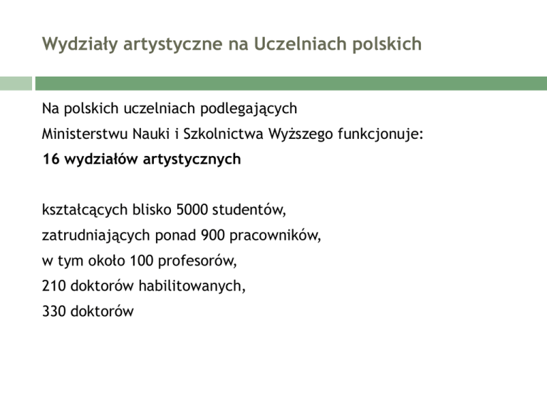 Wydziały artystyczne na Uczelniach polskich Na polskich uczelniach podlegających Ministerstwu Nauki i Szkolnictwa Wyższego funkcjonuje: 16 wydziałów artystycznych kształcących blisko 5000 studentów, zatrudniających ponad 900 pracowników, w tym około 100 profesorów, 210 doktorów habilitowanych, 330 doktorów Wydziały artystyczne na Uniwersytetach Wydział Sztuki Uniwersytetu Warmińsko-Mazurskiego w Olsztynie Wydział Sztuki Uniwersytetu Technologiczno-Humanistycznego im. Kazimierza Pułaskiego w Radomiu Wydział Artystyczny Uniwersytetu im. Marii Curie-Skłodowskiej w Lublinie Wydział Sztuki Akademii im. Jana Długosza w Częstochowie Instytut Edukacji Muzycznej Uniwersytetu Kazimierza Wielkiego w Bydgoszczy Wydział Muzyki Uniwersytetu Rzeszowskiego Wydział Sztuki Uniwersytetu Rzeszowskiego Wydział Pedagogiczny i Artystyczny Uniwersytetu Jana Kochanowskiego w Kielcach Wydział Pedagogiczno-Artystyczny w Kaliszu, Uniwersytetu im. Adama Mickiewicza w Poznaniu Wydział Sztuki Uniwersytetu Pedagogicznego w Krakowie Wydział Artystyczny Uniwersytetu Zielonogórskiego Wydział Sztuk Pięknych Uniwersytetu Mikołaja Kopernika w Toruniu Wydział Artystyczny Uniwersytetu Śląskiego w Cieszynie Instytut Architektury Tekstyliów Politechniki Łódzkiej Instytut Wzornictwa Politechniki Koszalińskiej Instytutu Edukacji Artystycznej Akademii Pedagogiki Specjalnej im. Marii Grzegorzewskiej w Warszawie Konferencja Dziekanów Wydziałów Artystycznych i Pedagogiczno-Artystycznych podległych MNiSW Naszą misją jest uświadamianie społeczeństwu jak wielkie znaczenie w ich życiu ma: kultura i sztuka są ważnymi czynnikami kształtującymi tożsamość społeczeństwa edukacja artystyczna jest kluczowym elementem wychowania dla przyszłości sztuka przeobraża człowieka i polepsza jakość życia indywidualnego studia artystyczne rozbudzają kreatywność oraz istotne kompetencje społeczne jak umiejętność dostosowywania się do wymogów rynku pracy Konferencja Dziekanów Wydziałów Artystycznych i Pedagogiczno-Artystycznych podległych MNiSW działa od 2014 r. – cele: integrowanie środowisk artystycznych polepszenie warunków finansowania jednostek artystycznych oraz realizowanych przez nie zadań statutowych, zmiana kryteriów parametrycznych, oceny jakości kształcenia i potencjału naukowego wydziałów artystycznych, wpisanie szczególnej roli jednostek artystycznych w promowaniu uczelni w misji poszczególnych uniwersytetów, szczególnie w zakresie kształtowania kultury regionu, wartości humanistycznych, związanych z lokalną społecznością, Konferencja Dziekanów Wydziałów Artystycznych i Pedagogiczno-Artystycznych podległych MNiSW działa od 2013 r. – cele: polepszenie warunków pracy na wydziałach artystycznych w zakresie liczebności grup warsztatowych, ćwiczeniowych i pracowni artystycznych, utworzenie Narodowego Centrum Sztuki lub stworzenie właściwego panelu aplikacyjnego z obszaru sztuki w Narodowym Centrum Nauki, dążenie do zmian na liście dziedzin i dyscyplin w obszarze sztuki, dążenie do regulacji prawnych dotyczących przewodów doktorskich i habilitacyjnych. strategia rozwoju szkolnictwa wyższego 2010-2020 projekt środowiskowy strategia rozwoju szkolnictwa wyższego 2010-2020 strategia rozwoju szkolnictwa wyższego 2010-2020 Nieodzownym elementem integralnej wizji szkolnictwa wyższego jest edukacja artystyczna. Obszar ten wymaga szczególnej rewitalizacji ze względu na zaniedbania lat ubiegłych. Uczelnie wyższe winny kształcić nauczycieli zdolnych zaszczepić u uczniów zarówno umiejętność praktykowania prostych form sztuki i muzyki, jak i rozmiłowania w nich. uzasadnienia: Zanik muzyki i plastyki w szkole w sensownym kształcie Pozorne uzdrowienie sytuacji (niekompetencje nauczycieli tych przedmiotów) Nacisk ustawowy umiejętności i kompetencje społeczne, które – w świetle badań – wykształca kontakt ze sztuką i muzyką Indywidualne korzyści psychologiczne zajmowania się sztuką i muzyką (połączenia neuronowe między półkulami mózgowymi), które potrzebne są dla zrównoważania wiedzy specjalistycznej nabywanej w szkole Niewielka waga przedmiotów artystycznych w Polsce w porównaniu ze szkolnictwem europejskim Niepodlegający pomiarowi czynnik transmisji dziedzictwa kulturowego, dziś szczególnie zagrożonego brak odpowiedniej edukacji artystycznej na poziomie szkoły podstawowej, gimnazjum i liceum Podjęcie działań w Ministerstwie Edukacji Narodowej na rzecz nowelizacji ustawy o systemie oświaty. Przywrócenie w szkołach nauczania przedmiotów artystycznych obligatoryjnie w obszarze plastyki i muzyki do 2 godzin tygodniowo – zamiast obecnego systemu wymiennego. problemy wydziałów artystycznych brak możliwości pozyskiwania funduszy na działalność artystyczną Dorobek artystyczny oraz dorobek naukowy zostały zrównane na mocy Rozporządzenia Ministra Nauki i Szkolnictwa Wyższego z dnia 8 sierpnia 2011 roku w sprawie obszarów wiedzy, dziedzin nauki i sztuki oraz dyscyplin naukowych i artystycznych (Dz. U. 2011 Nr 179, poz. 1065) Obszar sztuki jest jednym z 8 obszarów nauki Narodowe Centrum Nauki - z definicji- wspiera działalność naukową a twórczość artystyczna nie mieści się w ich interpretacji badań podstawowych. Dlaczego definicja badań podstawowych dzieli pracowników uczelni na dwie grupy, z których jedna otrzymuje wsparcie dla swojej działalności a druga nie? problemy wydziałów artystycznych brak możliwości pozyskiwania funduszy na działalność artystyczną utworzenie Narodowego Centrum Sztuki, który – wzorem Narodowego Centrum Nauki – zapewni wydziałom artystycznym dostęp do środków finansowych na działalność w obszarze sztuki lub utworzenie osobnego panelu HS2_14 lub HS2_16 o nazwie „Działalność artystyczna” lub podobnej. W panelu tym ocenialiby wyłącznie specjaliści z obszaru sztuki (artyści-plastycy i artyścimuzycy), a kryteria oce