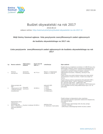 2017.03.04 Budżet obywatelski na rok 2017 2016.08.22 zobacz online: http://szemud.pl/artykuly/budzet-obywatelski-na-rok-2017-2/ Wójt Gminy Szemud ogłasza listę pozytywnie zweryfikowanych zadań zgłoszonych do budżetu obywatelskiego na 2017 rok. Lista pozytywnie zweryfikowanych zadań zgłoszonych do budżetu obywatelskiego na rok 2017 Lp. 1. 2. 3. Nazwa zadania Siłownia zewnętrzna Zgłaszający zadanie Agnieszka Kunikowska Zakup sprzętu dla OSP – Krzysztof „Wyposażenie OSP Grochocki = Bezpieczeństwo mieszkańców” Koszt (do 50 000 zł. ) 40 772 zł. 28 000 zł. Doposażenie placu rekreacyjno – sportowego dla Krystian Lindstead 45.000 zł. dzieci i młodzieży w sołectwie Jeleńska Huta Lokalizacja Opis zadania Bojano, ul. Wybickiego działka nr 2.209 UP Projekt dotyczy urządzenia na działce nr 2.209 UP przy ulicy Wybickiego w Bojanie siłowni zewnętrznej składającej się z 13 urządzeń na podwójnych i potrójnych stanowiskach do codziennych ćwiczeń o średnim stopniu trudności odpowiednich dla dzieci, młodzieży, dorosłych oraz seniorów. Całość terenu ma zostać obsiana trawą oraz maja zostać zamontowane 2 kosze na śmieci, 4 ławki oraz stojak na rowery. Jednostki OSP: 1. Kielno 2. Łebno 3. Częstkowo 4. Przetoczyno Jeleńska Huta ul. Szkolna/ul. Szemudzka Projekt dotyczy zakupu wyposażenia dla jednostek OSP z miejscowości Kielno, Łebno, Częstkowo i Przetoczyno. Dla jednostki OSP Kielno – Defibrylator AED. Dla jednostek OSP Łebno, OSP Częstkowo i OSP Przetoczyno 6 szt. aparatów ochrony dróg oddechowych (po 2 szt. na jednostkę) Projekt polega na doposażeniu placu sportowo – rekreacyjnego poprzez wykonanie nawierzchni bezpiecznej oraz poprzez zakup i montaż: – zewnętrznego, betonowego stołu do ping- ponga; – karuzeli „Trzmiel”; – piłkochwytu oddzielającego boisko od placu zabaw. www.szemud.pl | 1 2017.03.04 Modernizacja wjazdu do Szkoły Podstawowej w Łebieńskiej Hucie 4. Monika Brzeska 30 000 zł. Łebieńska Huta ul. Kartuska 25 84-217 Szemud Projekt polega na rozbiórce dotychczasowego wjazdu do szkoły, wyrównaniu terenu, utwardzeniu podłoża, ułożeniu krawężników oraz kostki brukowej lub innego materiału. Projekt zadania dotyczy budowy altanki ogrodowej wraz z grillem i koszem na śmieci, na podłożu z kostki brukowej nie przekraczającej 35 m2 5. 6. 7. Budowa altanki ogrodowej wraz z grillem na podłożu z kostki brukowej, zakup kosza na śmieci Wiata Grillowa w Częstkowie Maria Nowicka Iwona Białas – Rychlak Wykonanie odgrodzenia płyty boiska od kibiców oraz zakup bramek do piłki nożnej, zakup stojaków na Dorota Miotk rowery i koszy na śmieci LZS BOJANO Grzegorz Mierzejewski 8. Zakup wiat sportowych 9. Zakup 23 zestawów komputerowych Jan Barkowski typu laptop plus drukarka, na Sławomir Skiba potrzeby sołtysów Gminy Szemud ok. 26 500 zł. ok. 45.500 zł. Głazica, dzialka nr 16/3 Plac przy remizie OSP w Czestkowie, ul. Strażacka 1 84-217 Czestkowo działka nr 38/1 Projekt dotyczy poszerzenia oferty rekreacyjnej sołectwa Częstkowo poprzez stworzenie zadaszonego miejsca grillowego (altany ogrodowej z meblami i grillem) położonego przy remizie OSP w Czestkowie, które będzie dostępne dla wszystkich mieszkańców wsi. Wraz z istniejącym już zaplecze sportowym i placem zabaw stanie się ono centrum rekreacyjno – wypoczynkowym a także miejscem spotkań dla społeczności lokalnej. W projekcie znajduje się również zakup śmietników oraz drzewek ozdobnych oraz wykonanie fragmentu ogrodzenia Zadanie polega na zakupie: – 2 bramek do piłki nożnej (aluminiowych, przenośnych – Junior); – jednostronnego stojaka na 6 rowerów; – 6 szt. koszy na smieci oraz na wykonaniu odgrodzenia płyty boiska od kibiców 12 663,98 zł. Teren szkoły oraz boiska sportowego w Łebnie przy ul. Szkolnej 20 934,60 zł Boisko sportowe w Bojanie przy ul. Warszawskiej Zadanie polega na zakupie: – 2 szt. 13- osobowych wiat o konstrukcji aluminiowej z pokryciem litym i zamontowanymi kołami jezdnymi; – 1 wiaty 3 lub 4 – osobowej o konstrukcji aluminiowej z pokryciem litym i zamontowanymi kołami jezdnymi. 50.000 zł. Sołectwa Gminy Szemud Zadanie polega na zakupie 23 zestawów komputerowych typu laptop plus drukarka, na potrzeby sołtysów Gminy Szemud. www.szemud.pl | 2 2017.03.04 zarządzenie 421 IV 2016 procedury głosowania lista zadań – budżet obywatelski na rok 2017 wzór karty do głosowania – budżet obywatelski 2017 www.szemud.pl | 3