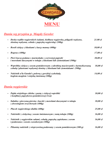 MENU Dania wg przepisu p. Magdy Gessler – Deska wędlin węgierskich (salami, kiełbasa węgierska, półgęski wędzone, słoniną wędzona, cebula z papryką węgierską) (300g) 21.00 zł – Rosół cielęcy z kluskami z kaszy manny (400g) 10,00 zł – Bogracz (400g) 17,00 zł – Pierś kacza podana z marmolada z czerwonej papryki i morelami duszonymi w tokaju z kluskami lub ziemniakami (500g) 30,00 zł – Wątróbka cielęca z sosem pomidorowym z odrobiną macierzanki z karmelizowaną cebulą i plastrami wędzonej słoniny z kluskami lub ziemniakami (500g) 18,00 zł – Naleśnik a'la Gundel z polewą z gorzkiej czekolady, koglem-moglem i wiejską śmietaną (300g) 14,00 zł Dania węgierskie – Pajda wiejskiego chleba z pastą z cielęcej wątróbki i konfitury paprykowo-pomidorowej (1szt) 10,00 zł – Sałatka z pieczoną piersią z kaczki z morelami duszonymi w tokaju z dressingiem orzechowym (400g) 18,00 zł – Placek węgierskiego diabła (400g) 25,00 zł – Naleśniki z cielęciną z sosem śmietanowym z nutą tokaju (300g) 16,00 zł – Naleśnik z węgierskim salami, cebulą, papryką zapiekana z serem i podawana z sosem czosnkowym (300g) 16,00 zł – Pikantny naleśnik z wieprzowiną podawany z sosem pomidorowym (300 g) 16,00 zł