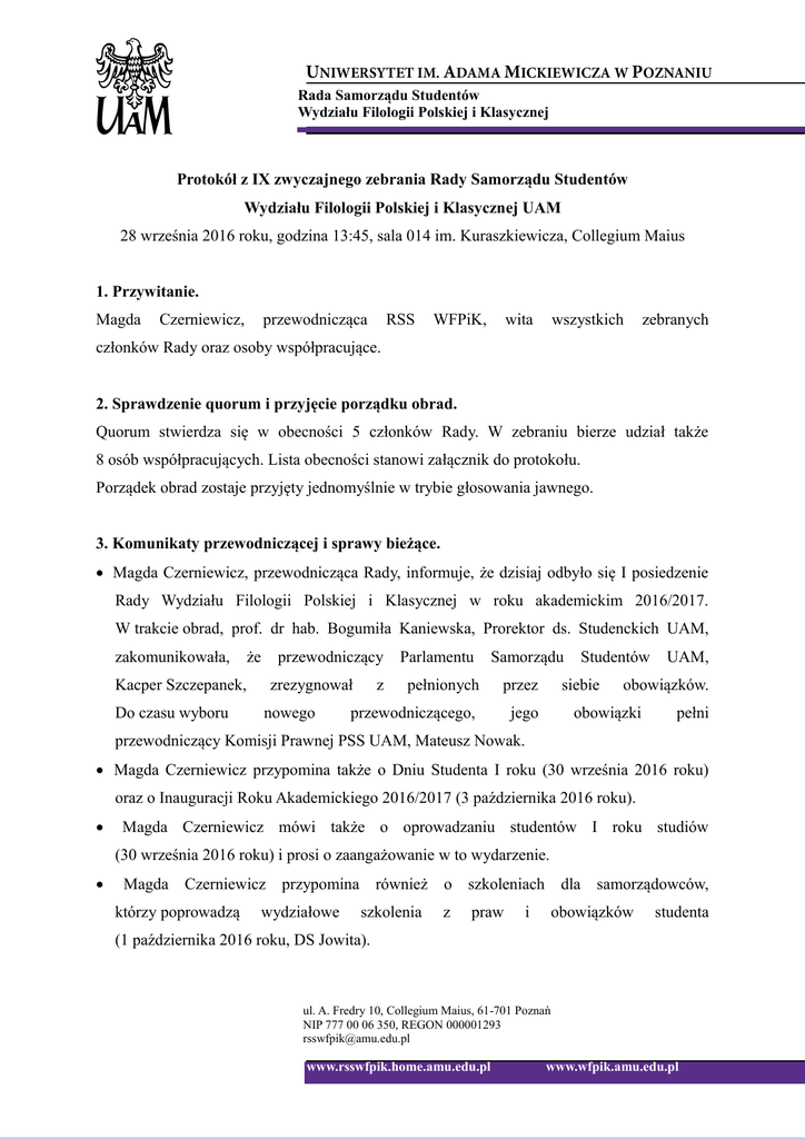 Rada Samorządu Studentów Wydziału Filologii Polskiej i Klasycznej Protokół z IX zwyczajnego zebrania Rady Samorządu Studentów Wydziału Filologii Polskiej i Klasycznej UAM 28 września 2016 roku, godzina 13:45, sala 014 im. Kuraszkiewicza, Collegium Maius 1. Przywitanie. Magda Czerniewicz, przewodnicząca RSS WFPiK, wita wszystkich zebranych członków Rady oraz osoby współpracujące. 2. Sprawdzenie quorum i przyjęcie porządku obrad. Quorum stwierdza się w obecności 5 członków Rady. W zebraniu bierze udział także 8 osób współpracujących. Lista obecności stanowi załącznik do protokołu. Porządek obrad zostaje przyjęty jednomyślnie w trybie głosowania jawnego. 3. Komunikaty przewodniczącej i sprawy bieżące. Magda Czerniewicz, przewodnicząca Rady, informuje, że dzisiaj odbyło się I posiedzenie Rady Wydziału Filologii Polskiej i Klasycznej w roku akademickim 2016/2017. W trakcie obrad, prof. dr hab. Bogumiła Kaniewska, Prorektor ds. Studenckich UAM, zakomunikowała, Kacper Szczepanek, Do czasu wyboru że przewodniczący zrezygnował nowego z Parlamentu Samorządu pełnionych przez przewodniczącego, jego Studentów siebie UAM, obowiązków. obowiązki pełni przewodniczący Komisji Prawnej PSS UAM, Mateusz Nowak. Magda Czerniewicz przypomina także o Dniu Studenta I roku (30 września 2016 roku) oraz o Inauguracji Roku Akademickiego 2016/2017 (3 października 2016 roku). Magda Czerniewicz mówi także o oprowadzaniu studentów I roku studiów (30 września 2016 roku) i prosi o zaangażowanie w to wydarzenie. Magda Czerniewicz przypomina również o szkoleniach dla samorządowców, którzy poprowadzą wydziałowe szkolenia z praw i obowiązków studenta (1 października 2016 roku, DS Jowita). ul. A. Fredry 10, Collegium Maius, 61-701 Poznań NIP 777 00 06 350, REGON 000001293 [email protected] www.rsswfpik.home.amu.edu.pl www.wfpik.amu.edu.pl Rada Samorządu Studentów Wydziału Filologii Polskiej i Klasycznej 4. Komunikaty wiceprzewodniczącego, sekretarz i pełnomocnik. Paweł Binkowski, wiceprzewodniczący Rady, nie ma komunikatów. Natalia Mąka, sekretarz Rady, nie ma komunikatów. Marta Kozłowska, pełnomocnik Rady ds. kulturalnych, informuje, że podczas Dnia Studenta I roku odbędzie się Wielki Finał II Wydziałowego Konkursu Fotograficznego Zoom na Collegium Maius. 5. Wybór członków Wydziałowej Komisji Ekonomicznej WFPiK. Magda Czerniewicz, przewodnicząca Rady, prosi o powołanie członków do Wydziałowej Komisji Ekonomicznej. Rekomenduje na to stanowisko 10 osób. Głosowanie przeprowadza komisja skrutacyjna I w składzie Natalia Mąka i Taida Wróblewska. Imię i nazwisko Głos za Głos przeciw Głos wstrzymujący Paweł Binkowski 5 0 0 Magda Czerniewicz 5 0 0 Agata Guzikowska 5 0 0 Łukasz Klawunn 5 0 0 Zbigniew Kotas 5 0 0 Patrycja Kryk 5 0 0 Natalia Mąka 5 0 0 Julia Pietrusewicz 5 0 0 Ina Sazon 5 0 0 Klaudia Stecka 5 0 0 Paweł Binkowski, Zbigniew Kotas, Magda Patrycja Czerniewicz, Kryk, Natalia Agata Guzikowska, Mąka, Julia Łukasz Pietrusewicz, Klawunn, Ina Sazon oraz Klaudia Stecka zostali członkami Wydziałowej Komisji Ekonomicznej. ul. A. Fredry 10, Collegium Maius, 61-701 Poznań NIP 777 00 06 350, REGON 000001293 [email protected] www.rsswfpik.home.amu.edu.pl www.wfpik.amu.edu.pl Rada Samorządu Studentów Wydziału Filologii Polskiej i Klasycznej 6. Wybór delegata do Parlamentu Samorządu Studentów. Natalia Mąka składa rezygnację z pełnienia funkcji delegata do Parlamentu Samorządu Studentów UAM. Magda Czerniewicz, przewodnicząca Rady, prosi o powołanie nowego delegata, na którego rekomenduje Łukasza Klawunna. Głosowanie przeprowadza komisja skrutacyjna II w składzie Natalia Rosicka i Klaudia Stecka. Imię i nazwisko Głos za Głos przeciw Głos wstrzymujący Łukasz Klawunn 5 0 0 Łukasz Klawunn został delegatem do Parlamentu Samorządu Studentów UAM. 7. Wolne głosy i wnioski. Brak wolnych głosów i wniosków. 8. Pożegnanie i zakończenie zebrania. Magda Czerniewicz, przewodnicząca Rady, dziękuje za obecność i zamyka IX zwyczajne zebranie Rady. Protokół sporządziła: Zebranie prowadziła: Natalia Mąka Magda Czerniewicz Sekretarz RSS WFPiK Przewodnicząca RSS WFPiK ul. A. Fredry 10, Collegium Maius, 61-701 Poznań NIP 777 00 06 350, REGON 000001293 [email protected] www.rsswfpik.home.amu.edu.pl www.wfpik.amu.edu.pl