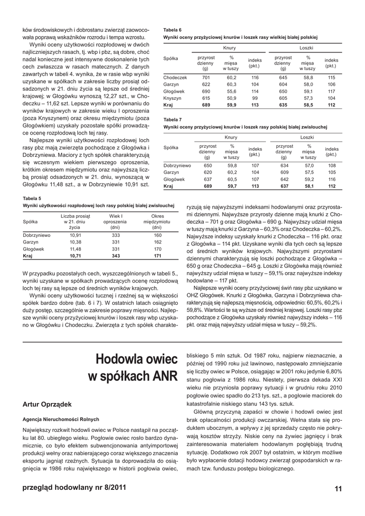 ków środowiskowych i dobrostanu zwierząt zaowocowała poprawą wskaźników rozrodu i tempa wzrostu. Wyniki oceny użytkowości rozpłodowej w dwóch najliczniejszych rasach, tj. wbp i pbz, są dobre, choć nadal konieczne jest intensywne doskonalenie tych cech zwłaszcza w rasach matecznych. Z danych zawartych w tabeli 4. wynika, że w rasie wbp wyniki uzyskane w spółkach w zakresie liczby prosiąt odsadzonych w 21. dniu życia są lepsze od średniej krajowej; w Głogówku wynoszą 12,27 szt., w Chodeczku – 11,62 szt. Lepsze wyniki w porównaniu do wyników krajowych w zakresie wieku I oproszenia (poza Knyszynem) oraz okresu międzymiotu (poza Głogówkiem) uzyskały pozostałe spółki prowadzące ocenę rozpłodową loch tej rasy. Najlepsze wyniki użytkowości rozpłodowej loch rasy pbz mają zwierzęta pochodzące z Głogówka i Dobrzyniewa. Maciory z tych spółek charakteryzują się wczesnym wiekiem pierwszego oproszenia, krótkim okresem międzymiotu oraz najwyższą liczbą prosiąt odsadzonych w 21. dniu, wynoszącą w Głogówku 11,48 szt., a w Dobrzyniewie 10,91 szt. Tabela 6 Wyniki oceny przyżyciowej knurów i loszek rasy wielkiej białej polskiej Knury Loszki przyrost dzienny (g) % mięsa w tuszy indeks (pkt.) przyrost dzienny (g) % mięsa w tuszy indeks (pkt.) Chodeczek Garzyn 701 622 60,2 60,3 116 104 645 604 58,8 58,0 115 106 Głogówek 690 55,6 114 650 59,1 117 Knyszyn Kraj 615 689 50,9 59,9 99 113 605 635 57,3 58,5 104 112 Spółka Tabela 7 Wyniki oceny przyżyciowej knurów i loszek rasy polskiej białej zwisłouchej Knury Loszki przyrost dzienny (g) % mięsa w tuszy indeks (pkt.) przyrost dzienny (g) % mięsa w tuszy indeks (pkt.) Dobrzyniewo Garzyn 650 620 59,8 60,2 107 104 634 609 57,0 57,5 108 105 Głogówek Kraj 637 689 60,5 59,7 107 113 642 637 59,2 58,1 116 112 Spółka Tabela 5 Wyniki użytkowości rozpłodowej loch rasy polskiej białej zwisłouchej Liczba prosiąt w 21. dniu życia Wiek I oproszenia (dni) Okres międzymiotu (dni) Dobrzyniewo Garzyn 10,91 10,38 333 331 160 162 Głogówek Kraj 11,48 10,71 331 343 170 171 Spółka W przypadku pozostałych cech, wyszczególnionych w tabeli 5., wyniki uzyskane w spółkach prowadzących ocenę rozpłodową loch tej rasy są lepsze od średnich wyników krajowych. Wyniki oceny użytkowości tucznej i rzeźnej są w większości spółek bardzo dobre (tab. 6 i 7). W ostatnich latach osiągnięto duży postęp, szczególnie w zakresie poprawy mięsności. Najlepsze wyniki oceny przyżyciowej knurów i loszek rasy wbp uzyskano w Głogówku i Chodeczku. Zwierzęta z tych spółek charakte- Hodowla owiec w spółkach ANR Artur Oprządek Agencja Nieruchomości Rolnych Największy rozkwit hodowli owiec w Polsce nastąpił na początku lat 80. ubiegłego wieku. Pogłowie owiec rosło bardzo dynamicznie, co było efektem subwencjonowania antyimportowej produkcji wełny oraz nabierającego coraz większego znaczenia eksportu jagniąt rzeźnych. Sytuacja ta doprowadziła do osiągnięcia w 1986 roku największego w historii pogłowia owiec, przegląd hodowlany nr 8/2011 ryzują się najwyższymi indeksami hodowlanymi oraz przyrostami dziennymi. Najwyższe przyrosty dzienne mają knurki z Chodeczka – 701 g oraz Głogówka – 690 g. Najwyższy udział mięsa w tuszy mają knurki z Garzyna – 60,3% oraz Chodeczka – 60,2%. Najwyższe indeksy uzyskały knurki z Chodeczka – 116 pkt. oraz z Głogówka – 114 pkt. Uzyskane wyniki dla tych cech są lepsze od średnich wyników krajowych. Najwyższymi przyrostami dziennymi charakteryzują się loszki pochodzące z Głogówka – 650 g oraz Chodeczka – 645 g. Loszki z Głogówka mają również najwyższy udział mięsa w tuszy – 59,1% oraz najwyższe indeksy hodowlane – 117 pkt. Najlepsze wyniki oceny przyżyciowej świń rasy pbz uzyskano w OHZ Głogówek. Knurki z Głogówka, Garzyna i Dobrzyniewa charakteryzują się najlepszą mięsnością, odpowiednio: 60,5%, 60,2% i 59,8%. Wartości te są wyższe od średniej krajowej. Loszki rasy pbz pochodzące z Głogówka uzyskały również najwyższy indeks – 116 pkt. oraz mają najwyższy udział mięsa w tuszy – 59,2%. bliskiego 5 mln sztuk. Od 1987 roku, najpierw nieznacznie, a później od 1990 roku już lawinowo, następowało zmniejszanie się liczby owiec w Polsce, osiągając w 2001 roku jedynie 6,80% stanu pogłowia z 1986 roku. Niestety, pierwsza dekada XXI wieku nie przyniosła poprawy sytuacji i w grudniu roku 2010 pogłowie owiec spadło do 213 tys. szt., a pogłowie maciorek do katastrofalnie niskiego stanu 143 tys. sztuk. Główną przyczyną zapaści w chowie i hodowli owiec jest brak opłacalności produkcji owczarskiej. Wełna stała się produktem ubocznym, a wpływy z jej sprzedaży często nie pokrywają kosztów strzyży. Niskie ceny na żywiec jagnięcy i brak zainteresowania materiałem hodowlanym pogłębiają trudną sytuację. Dodatkowo rok 2007 był ostatnim, w którym możliwe było wypłacenie dotacji hodowcy zwierząt gospodarskich w ramach tzw. funduszu postępu biologicznego. 11 zlokalizowana jest hodowla merynosa polskiego na poziomie zarodowym, natomiast w Rok Wyszczególnienie spółce „Spójnia” Nochowo 1994 1996 2001 2005 2007 2009 2010 znajduje się stado reprodukPogłowie owiec w Polsce* 870 000 552 000 343 000 317 000 315 600 224 000 213 000 cyjne. Ponadto w spółkach Pogłowie matek w Polsce* – 355 000 224 000 212 000 210 800 158 200 142 800 HZZ „Żołędnica” i GR-H Żydowo utrzymywane są rasy Stan matek ocenianych** – 143 527 121 912 110 552 83 316 69 549 70 607 mięsne: suffolk, charolaise i Stan matek w spółkach ANR 25 000 11 767 2841 3176 2536 1685 1478 berrichon. Obecna struktura *wg GUS; **wg Polskiego Związku Owczarskiego (od 2009 roku maciorki wpisane do ksiąg zarodowych) rasowa jest efektem przeOdzwierciedleniem tej sytuacji był również stan pogłowia kształceń związanych z realizacją „Programu rozwoju owczarowiec w spółkach ANR.