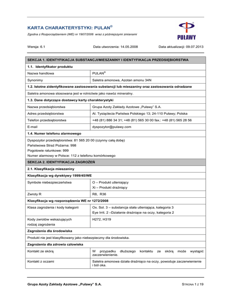 KARTA CHARAKTERYSTYKI: PULAN® Zgodna z Rozporządzeniem (WE) nr 1907/2006 wraz z późniejszymi zmianami Wersja: 6.1 Data utworzenia: 14.05.2008 Data aktualizacji: 09.07.2013 SEKCJA 1. IDENTYFIKACJA SUBSTANCJI/MIESZANINY I IDENTYFIKACJA PRZEDSIĘBIORSTWA 1.1. Identyfikator produktu ® Nazwa handlowa PULAN Synonimy Saletra amonowa, Azotan amonu 34N 1.2. Istotne zidentyfikowane zastosowania substancji lub mieszaniny oraz zastosowania odradzane Saletra amonowa stosowana jest w rolnictwie jako nawóz mineralny. 1.3. Dane dotyczące dostawcy karty charakterystyki Nazwa przedsiębiorstwa Grupa Azoty Zakłady Azotowe „Puławy” S.A. Adres przedsiębiorstwa Al. Tysiąclecia Państwa Polskiego 13; 24-110 Puławy; Polska Telefon przedsiębiorstwa +48 (81) 886 34 31; +48 (81) 565 30 00 fax.: +48 (81) 565 28 56 E-mail [email protected] 1.4. Numer telefonu alarmowego Dyspozytor przedsiębiorstwa: 81 565 20 00 (czynny całą dobę) Państwowa StraŜ PoŜarna: 998 Pogotowie ratunkowe: 999 Numer alarmowy w Polsce: 112 z telefonu komórkowego SEKCJA 2. IDENTYFIKACJA ZAGROśEŃ 2.1. Klasyfikacja mieszaniny Klasyfikacja wg dyrektywy 1999/45/WE Symbole niebezpieczeństwa O – Produkt utleniający Xi – Produkt draŜniący Zwroty R R8, R36 Klasyfikacja wg rozporządzenia WE nr 1272/2008 Klasa zagroŜenia i kody kategorii Ox. Sol. 3 – substancja stała utleniająca, kategoria 3 Eye Irrit. 2 –Działanie draŜniące na oczy, kategoria 2 Kody zwrotów wskazujących H272, H319 rodzaj zagroŜenia ZagroŜenia dla środowiska Produkt nie jest klasyfikowany jako niebezpieczny dla środowiska. ZagroŜenia dla zdrowia człowieka Kontakt ze skórą W przypadku dłuŜszego zaczerwienienie. Kontakt z oczami Saletra amonowa działa draŜniąco na oczy, powoduje zaczerwienienie i ból oka. Grupa Azoty Zakłady Azotowe „Puławy” S.A. kontaktu ze skórą moŜe wystąpić STRONA 1 Z 19 KARTA CHARAKTERYSTYKI: PULAN® Zgodna z Rozporządzeniem (WE) nr 1907/2006 wraz z późniejszymi zmianami Wersja: 6.1 Data utworzenia: 14.05.2008 Data aktualizacji: 09.07.2013 Połknięcie Połknięcie duŜych ilości saletry amonowej moŜe spowodować zaburzenia gastryczno-jelitowe powodujące wymioty, biegunki oraz tworzenie się methemoglobiny i powstanie sinicy. Wdychanie Pyły saletry amonowej mogą spowodować podraŜnienie dróg oddechowych. Efekty długoterminowe W kilka godzin po zatruciu drogą pokarmową moŜe wystąpić sinoniebieskie zabarwienie warg, paznokci, skóry wskutek methemoglobinemii. ZagroŜenia związane z właściwościami fizykochemicznymi Azotan amonowy jest produktem niepalnym, niemniej jednak wzmaga palność innych substancji. W temperaturach wyŜszych niŜ temperatura topnienia (patrz pkt. 9.1.) czysty azotan amonu ulega rozkładowi. W zamkniętych przestrzeniach rozkład moŜe prowadzić do wybuchu. Substancje wymienione w pkt.10.5. katalizują rozkład zwiększając zagroŜenie poŜarowo-wybuchowe. Podczas poŜaru z udziałem azotanu amonu powstają toksyczne produkty rozkładu: NOx, NH3. 2.2. Elementy oznakowania Piktogram GHS03 GHS07 Hasło ostrzegawcze Uwaga Zwroty H H272 - MoŜe intensyfikować poŜar; utleniacz H319 - Działa draŜniąco na oczy. Zwroty P P210: Przechowywać z dala od źródeł ciepła/iskrzenia/otwartego ognia/gorących powierzchni. – Palenie wzbronione. P221: Zastosować wszelkie środki ostroŜności w celu uniknięcia mieszania z innymi materiałami zapalnymi. P280: Stosować rękawice ochronne/odzieŜ ochronną/ochronę oczu/ochronę twarzy. P305 + P351 + P338: W PRZYPADKU DOSTANIA SIĘ DO OCZU: OstroŜnie płukać wodą przez kilka minut. Wyjąć soczewki kontaktowe, jeŜeli są i moŜna je łatwo usunąć. Nadal płukać. P337 + P313: W przypadku utrzymywania się działania draŜniącego na oczy: Zasięgnąć porady/zgłosić się pod opiekę lekarza. 2.3. Inne zagroŜenia Dla substancji nie stosuje się kryteriów przyjętych dla substancji trwałych, wykazujących zdolność do bioakumulacji i toksycznych (ang. Persistent, Bioaccumulative, Toxic – PBT) ani substancji bardzo trwałych i wykazujących bardzo duŜą zdolność do bioakumulacji (ang. very Persistent very Bioaccumulative - vPvB). SEKCJA 3. SKŁAD/INFORMACJA O SKŁADNIKACH 3.1. Substancje Nie dotyczy 3.2. Mieszaniny Grupa Azoty Zakłady Azotowe „Puławy” S.A. STRONA 2 Z 19 KARTA CHARAKTERYSTYKI: PULAN® Zgodna z Rozporządzeniem (WE) nr 1907/2006 wraz z późniejszymi zmianami Wersja: 6.1 Data utworzenia: 14.05.2008 Identyfikator produktu PULAN Data aktualizacji: 09.07.2013 ® Klasyfikacja składników wg dyrektywy 67/548/EWG Nazwa składnika StęŜenie Nr WE Nr rejestracji Symbole zagroŜenia Zwroty R Azotan (V) amonu ≥ 98% 229-347-8 01-2119490981-27-0025 O; Xi R8; R36 Azotan (V) magnezu ≤ 2% 233-826-7 01-2119491164-38-0008 O R8 Klasyfikacja składników wg Rozporządzenia (WE) 1272/2008 Nazwa składnika StęŜenie Nr WE Nr rejestracji Azotan (V) amonu ≥ 98% 229-347-8 01-2119490981-27-0025 Azotan (V) magnezu ≤ 2% 233-826-7 01-2119491164-38-0008 Klasy zagroŜenia i kody kategorii Zwroty H Oxid. Solid 3 H272 Eye Irrit. 2 H319 Oxid. Solid 3 H272 Pełne brzmienie zwrotów ryzyka (zwrotów R) oraz zwrotów wskazujących rodzaj zagroŜenia (zwrotów H) znajduje się w punkcie 16. SEKCJA 4. ŚRODKI PIERWSZEJ POMOCY 4.1. Opis środków pierwszej pomocy Informacje ogólne Stosować odpowiednią wentylację miejscową i ogólną. Zaleca się wyposaŜenie miejsca pracy w prysznic oraz myjkę oczu. Inhalacja Usunąć poszkodowanego z miejsca zagroŜenia zapewniając dostęp świeŜego powietrza. W przypadku wystąpienia objawów zatrucia zapewnić pomoc medyczną. Połknięcie W przypadku spoŜycia, naleŜy poszkodowanemu podać do picia duŜą ilość wody. Nie wywoływać wymiotów. Małe dawki zazwyczaj nie wywołują objawów zatrucia. SpoŜycie większych ilości nawozu prowadzić moŜe do zaburzeń Ŝołądkowo trawiennych, spadku ciśnienia krwi oraz tworzenia się methemoglobiny. Wezwać pomoc