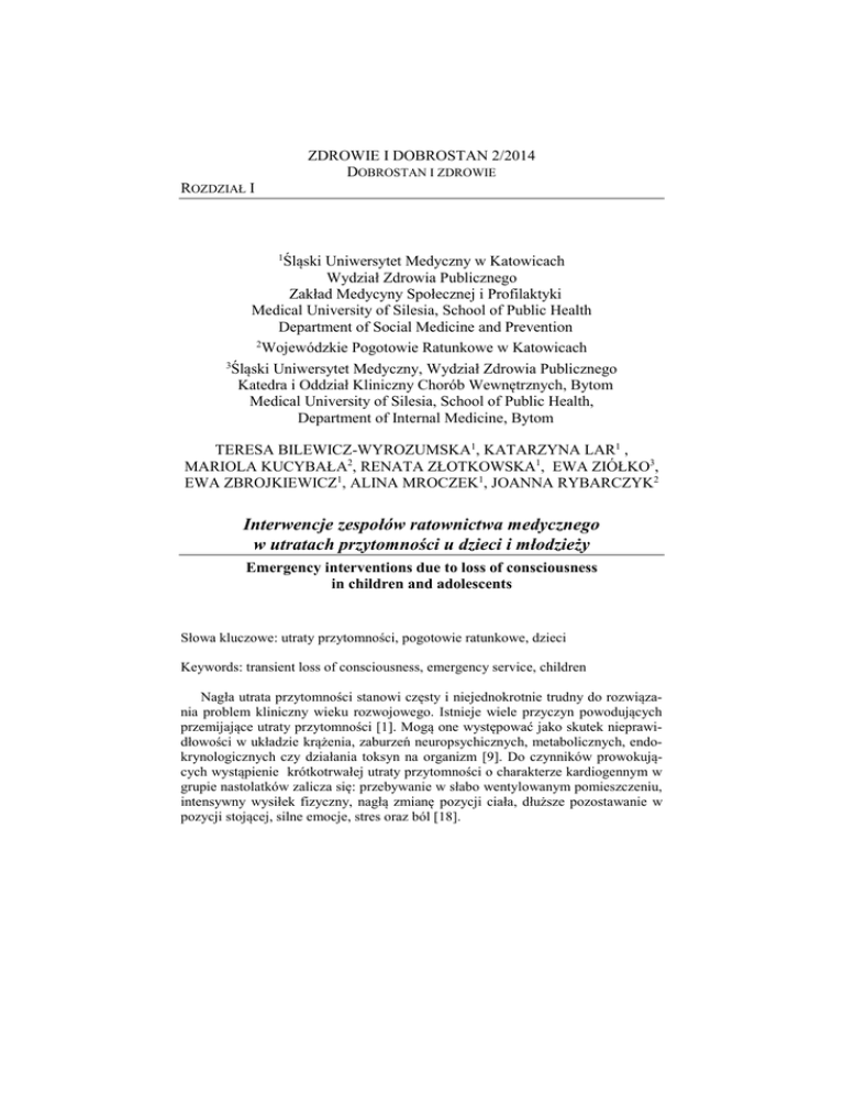 ZDROWIE I DOBROSTAN 2/2014 DOBROSTAN I ZDROWIE ROZDZIAŁ I Śląski Uniwersytet Medyczny w Katowicach Wydział Zdrowia Publicznego Zakład Medycyny Społecznej i Profilaktyki Medical University of Silesia, School of Public Health Department of Social Medicine and Prevention 2 Wojewódzkie Pogotowie Ratunkowe w Katowicach 3 Śląski Uniwersytet Medyczny, Wydział Zdrowia Publicznego Katedra i Oddział Kliniczny Chorób Wewnętrznych, Bytom Medical University of Silesia, School of Public Health, Department of Internal Medicine, Bytom 1 TERESA BILEWICZ-WYROZUMSKA1, KATARZYNA LAR1 , MARIOLA KUCYBAŁA2, RENATA ZŁOTKOWSKA1, EWA ZIÓŁKO3, EWA ZBROJKIEWICZ1, ALINA MROCZEK1, JOANNA RYBARCZYK2 Interwencje zespołów ratownictwa medycznego w utratach przytomności u dzieci i młodzieży Emergency interventions due to loss of consciousness in children and adolescents Słowa kluczowe: utraty przytomności, pogotowie ratunkowe, dzieci Keywords: transient loss of consciousness, emergency service, children Nagła utrata przytomności stanowi częsty i niejednokrotnie trudny do rozwiązania problem kliniczny wieku rozwojowego. Istnieje wiele przyczyn powodujących przemijające utraty przytomności [1]. Mogą one występować jako skutek nieprawidłowości w układzie krążenia, zaburzeń neuropsychicznych, metabolicznych, endokrynologicznych czy działania toksyn na organizm [9]. Do czynników prowokujących wystąpienie krótkotrwałej utraty przytomności o charakterze kardiogennym w grupie nastolatków zalicza się: przebywanie w słabo wentylowanym pomieszczeniu, intensywny wysiłek fizyczny, nagłą zmianę pozycji ciała, dłuższe pozostawanie w pozycji stojącej, silne emocje, stres oraz ból [18]. ZDROWIE I DOBROSTAN 2/2014 Dobrostan i zdrowie Nawet krótkotrwała utrata przytomności może stanowić zagrożenie dla zdrowia i/lub życia dziecka w każdym wieku, dlatego zwłaszcza powtarzające się, incydenty należy zawsze diagnozować. W sytuacji, kiedy utrata przytomności ma nagły początek, jest krótkotrwała i samoistnie ustępuje, najczęściej określana jest jako omdlenie. Wiele różnego rodzaju zaburzeń tylko przypomina omdlenia; inny mechanizm charakteryzuje utraty przytomności występuje w padaczce, hipoglikemii, zatruciach, napadach niedokrwienia mózgu. W niektórych sytuacjach może dochodzić do pozornej utraty przytomności jak w: katapleksji, napadach padania, pseudoomdleniach psychogennych, napadach niedokrwienia mózgu w wyniku zwężenia tętnic szyjnych [9]. Omdlenie, pojawia się nagle, najczęściej po pewnym czasie od przyjęcia pozycji stojącej. Powoduje je zakłócenie samoregulacji układu krążenia. Jest objawem przemijającym, trwającym krótko i często nie wymaga pomocy personelu medycznego czy osób trzecich, a największym niebezpieczeństwem zdrowotnym jest uraz podczas upadku, szczególnie uraz głowy. Najczęściej tuż przed wystąpieniem omdlenia pojawiają się objawy zwiastujące takie jak: zawroty głowy, nudności, niepokój, wrażenie osłabienia, zaburzeniu w układzie słuchu i widzenia, może wystąpić nadmierna potliwość oraz bladość powłok skórnych. Po zaistniałym incydencie omdlenia trwającym najczęściej, jak określają niektórzy autorzy, nie dłużej niż 20 sekund stan pacjenta powraca do stanu wyjściowego, bardzo rzadko obserwuje się uczucie zmęczenia czy niepamięć wsteczną [10,20]. Dzięki zastosowaniu testu pochyleniowego (tilt-test), zwanego też testem pionizacyjnym, z grupy omdleń o niewyjaśnionej etiologii udaje się wyodrębnić te o podłożu wazowagalnym. Test pionizacyjny jest badaniem nieinwazyjnym, pozwalającym wywołać omdlenie (lub stan bliski omdlenia) w sposób kontrolowany, co wskazuje na predyspozycję badanego do wystąpienia reakcji wazowagalnej. W trakcie pionizacji wykonywanej za pomocą mechanicznie podnoszonego stołu z podpórką pod stopy, obserwuje się czynność serca, ciśnienie tętnicze krwi i coraz częściej wiele innych parametrów. W celu zwiększenia czułości badania, w wielu ośrodkach stosuje się test z użyciem izoprenaliny. W klasyfikacji omdleń zaproponowanej przez Europejskie Towarzystwo Kardiologiczne (European Society of Cardiology, ESC) oprócz omdleń odruchowych (neurogennych) wyróżniono omdlenia sercowo-naczyniowe i omdlenia spowodowane hipotonią ortostatyczną, w których zaburzenia pojawiające się wkrótce po zmianie pozycji ciała. Podstawową przyczyną ich występowania są zaburzenia funkcjonowania układu autonomicznego. Niektórzy autorzy wyróżniają różne postacie omdleń ortostatycznych np. postać wczesną, późną, pierwotną i wtórną [9,20,26]. Omdlenie kardiogenne obserwowane są znacznie rzadziej, natomiast przyczyny ich występowania mogą w wielu przypadkach stwarzać zagrożenie dla życia, dlatego w postępowaniu diagnostycznym zawsze należy brać pod uwagę czynnik ryzyka występowania tych omdleń. Bradyarytmie, blok zatokowo-przedsionkowy, przedsionkowo-komorowy i tachyarytmie, częstoskurcze oraz zwężenie zastawki aortalnej, nadciśnienie płucne, kardiomiopatia przerostowa należą do głównych przyczyn 12 Teresa Bilewicz-Wyrozumska, Katarzyna Lar, Mariola Kucybała, Renata Złotkowska, Ewa Ziółko, Ewa Zbrojkiewicz, Alina Mroczek, Joanna Rybarczyk Interwencje zespołów ratownictwa medycznego w utratach przytomności u dzieci i młodzieży występowania omdleń kardiogennych. Wśród objawów sugerujących przyczynę kardiogenną omdlenia zwraca się uwagę na uczucie szybkiej akcji serca, ból w klatce piersiowej, omdlenia w pozycji leżącej oraz wywiad rodzinny wskazujący na zgon w młodym wieku z niejasnej przyczyny [19,20,26]. Omdlenia występujące w wieku rozwojowym są częste, a większość z nich ma charakter odruchowy. W populacji wieku rozwojowego stanowią jedną z częstszych przyczyn wezwań zespołu ratownictwa medycznego [9]. Od zespołów tych oczekuje się nie tylko znajomości medycznych czynno