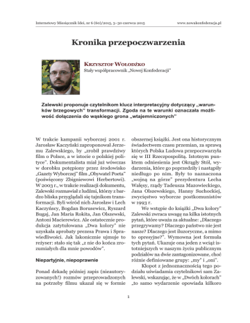 Internetowy Miesięcznik Idei, nr 6 (60)/2015, 3–30 czerwca 2015 www.nowakonfederacja.pl Kronika przepoczwarzenia Krzysztof WołodźKo Stały współpracownik „Nowej Konfederacji” Zalewski proponuje czytelnikom klucz interpretacyjny dotyczący „warunków brzegowych” transformacji. Zgoda na te warunki oznaczała możliwość dołączenia do wąskiego grona „wtajemniczonych” W trakcie kampanii wyborczej 2001 r. Jarosław Kaczyński zaproponował Jerzemu Zalewskiego, by „zrobił prawdziwy film o Polsce, a w istocie o polskiej polityce”. Dokumentalista miał już wówczas w dorobku potępiony przez środowisko „Gazety Wyborczej” film „Obywatel Poeta” (poświęcony Zbigniewowi Herbertowi). W 2003 r., w trakcie realizacji dokumentu, Zalewski rozmawiał z ludźmi, którzy z bardzo bliska przyglądali się tajnikom transformacji. Byli wśród nich Jarosław i Lech Kaczyńscy, Bogdan Borusewicz, Ryszard Bugaj, Jan Maria Rokita, Jan Olszewski, Antoni Macierewicz. Ale ostatecznie produkcja zatytułowana „Dwa kolory” nie uzyskała aprobaty prezesa Prawa i Sprawiedliwości. Jak lakonicznie ujmuje to reżyser: stało się tak „z nie do końca zrozumiałych dla mnie powodów”. obszernej książki. Jest ona historycznym świadectwem czasu przemian, za sprawą których Polska Ludowa przepoczwarzyła się w III Rzeczpospolitą. Istotnym punktem odniesienia jest Okrągły Stół, wydarzenia, które go poprzedziły i nastąpiły niedługo po nim. Były to naznaczona „wojną na górze” prezydentura Lecha Wałęsy, rządy Tadeusza Mazowieckiego, Jana Olszewskiego, Hanny Suchockiej, zwycięstwo wyborcze postkomunistów w 1993 r. We wstępie do książki „Dwa kolory” Zalewski zwraca uwagę na kilka istotnych pytań, które uważa za aktualne: „Dlaczego przegrywamy? Dlaczego państwo nie jest nasze? Dlaczego jest iluzoryczne, a mimo to opresyjne?”. Wymowna jest formuła tych pytań. Ukazuje ona jeden z wciąż istotniejszych w naszym życiu publicznym podziałów na dwie zantagonizowane, choć różnie definiowane grupy: „my” i „oni”. Kłopot z jednoznacznością tego podziału uświadamia czytelnikowi sam Zalewski, wskazując, że w „Dwóch kolorach” „to samo wydarzenie opowiada kilkoro Niepartyjnie, niepoprawnie Ponad dekadę później zapis (nieautoryzowanych!) rozmów przeprowadzonych na potrzeby filmu ukazał się w formie 1 Internetowy Miesięcznik Idei, nr 6 (60)/2015, 3–30 czerwca 2015 www.nowakonfederacja.pl Skomplikowane warunki świadków, pamiętając je inaczej i wyciągając z niego odmienne bądź różniące się wnioski”. Być może właśnie ta niejednoznaczność przekazu, jego zniuansowanie sprawiły, że film stanowiący punkt wyjścia dla książki nie nadawał się na partyjny „dokument światopoglądowy”. Asumpt do powstania filmu i znaczniej późniejszej książki dały wydarzenia z początku lat dwutysięcznych. Odsłoniły one na moment „miękkie podbrzusze” stabilizującego się już bez problemów – jak się wydawało – systemu III Rzeczpospolitej. Jego istotą był okrągłostołowy kompromis między beneficjentami transformacji, z których część reprezentowała wąską grupę poopozycyjnej elity z czasów Polski Ludowej, z drugiej – wpływowe środowiska postkomunistyczne. Polityka, szczególnie ta uprawiana na potrzeby mas, była jedynie czubkiem góry lodowej, jaką tworzyła rzeczywistość zbudowana na tym wieloaspektowym kompromisie, który przenikał głęboko struktury biznesowe, medialne, administracyjne III RP. I całościowo zdeterminował nasze realia społeczne. W momencie, w którym Zalewski rozpoczynał rozmowy z bohaterami „Dwóch kolorów” prezydentem państwa drugą kadencję był Aleksander Kwaśniewski, a Leszek Miller kierował rządem koalicji SLD-UP-PSL. W tym czasie pracowała już sejmowa Komisja Śledcza w sprawie „afery Rywina”. Jan Maria Rokita, wówczas prominentny polityk niedawno powstałej Platformy Obywatelskiej i błyskotliwy śledczy komisji sejmowej ds. „afery Rywina”, wieszczył „szarpnięcie za cugle demokracji”. To był dobry moment, by głośniej niż dotąd zadać pytanie, wcześniej kompletnie niemal ignorowane przez mainstream: co jest nie tak z Polską? „Dwa kolory” mogą sprawić części czytelników pewien kłopot. Dla młodszych roczników bardzo nieraz szczegółowe opowieści bohaterów książki o wydarzeniach, które doprowadziły do Okrągłego Stołu, mogą być nużące jak lekcja prehistorii. Ale drobiazgowość, dotycząca choćby rozbicia i sporów w obrębie schyłkowej opozycji czasów PRL, unaocznia, w jak skomplikowanych warunkach rodził się kraj, w którym żyjemy. Zalewski proponuje czytelnikom klucz interpretacyjny, który na ogół potwierdzają jego rozmówcy, dotyczący „warunków brzegowych” przemian. Otóż zgoda na te warunki oznaczała możliwość dołączenia do wąskiego grona okrągłostołowych „wtajemniczonych”. obywatele Polski częściej spotykają się z fasadą demokracji niż z realną demokracją Zdaniem Jarosława Kaczyńskiego „rewizjoniści” z kręgu opozycji solidarnościowej, na czele z Adamem Michnikiem, zaczęli „traktować Okrągły Stół nie jako posunięcie taktyczne (…), tylko jako posunięcie zmierzające do co najmniej prefiguracji sytuacji w Polsce, na bardzo wiele lat”. Powyższa teza jest dobrze utrwalona w większości antymainstreamowych opowieści o transformacji. Nie była niczym nowym w 2003 r., gdy różnymi słowami przedstawiali ją rozmówcy Zalewskiego. Nietypowe i zasługujące na uwagę było to, że mniej więcej od czasu „afery Rywina” 2 Internetowy Miesięcznik Idei, nr 6 (60)/2015, 3–30 czerwca 2015 www.nowakonfederacja.pl Opowieść trójwarstwowa zdecydowanie krytyczny obraz Okrągłego Stołu przestał być „teorią spiskową” wartą co najwyżej „drugoobiegowych broszur” sprzedawanych w ultraprawicowych księgarniach i rozdawanych