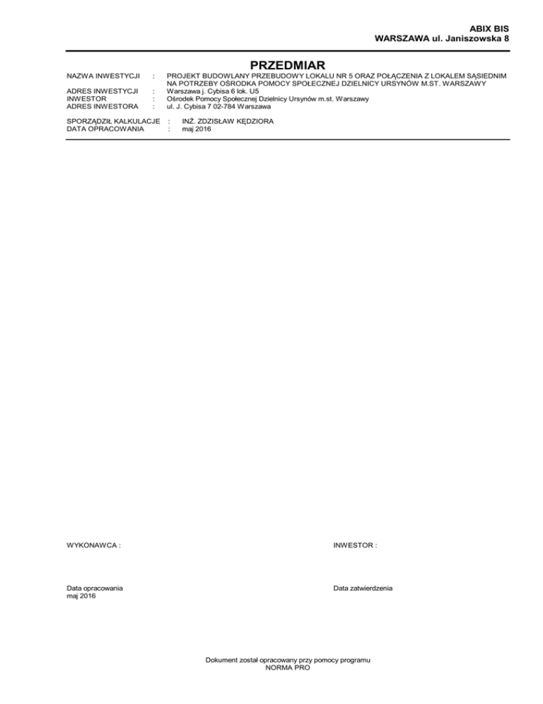 ABIX BIS WARSZAWA ul. Janiszowska 8 PRZEDMIAR NAZWA INWESTYCJI : ADRES INWESTYCJI INWESTOR ADRES INWESTORA : : : SPORZĄDZIŁ KALKULACJE DATA OPRACOWANIA PROJEKT BUDOWLANY PRZEBUDOWY LOKALU NR 5 ORAZ POŁĄCZENIA Z LOKALEM SĄSIEDNIM NA POTRZEBY OŚRODKA POMOCY SPOŁECZNEJ DZIELNICY URSYNÓW M.ST. WARSZAWY Warszawa j. Cybisa 6 lok. U5 Ośrodek Pomocy Społecznej Dzielnicy Ursynów m.st. Warszawy ul. J. Cybisa 7 02-784 Warszawa : : INŻ. ZDZISŁAW KĘDZIORA maj 2016 WYKONAWCA : INWESTOR : Data opracowania maj 2016 Data zatwierdzenia Dokument został opracowany przy pomocy programu NORMA PRO Cybisa 6 przedmiar KSIĄŻKA PRZEDMIARÓW Lp. Podst Opis i wyliczenia j.m. Wykonanie instalacji elektrycznej i teletechnicznej 1 Rozdzielnie 1.1 Rozdzielnia TU-1 1 KNR-W 5-08 Montaż osprzętu modułowego w rozdzielnicach - rozłącznik lub wyłącznik przeciw- szt d.1. 0407-03 porażeniowy 1 (2) - bieg. 1 1 szt 2 KNR-W 5-08 Montaż osprzętu modułowego w rozdzielnicach - wyłącznik nadprądowy 1-bieg. d.1. 0407-01 S301 C16 1 1 1.2 1.2. 1 3 d.1. 2.1 Poszcz Razem 1.000 RAZEM 1.000 1.000 RAZEM 1.000 14.000 RAZEM 14.000 10.000 RAZEM 10.000 1.000 RAZEM 1.000 1.000 RAZEM 1.000 61.000 RAZEM 61.000 37.000 RAZEM 37.000 37.000 RAZEM 37.000 3.000 RAZEM 3.000 12.000 RAZEM 12.000 12.000 RAZEM 12.000 11.000 RAZEM 11.000 66.000 RAZEM 66.000 szt szt Rozdzielnia TU-2 Zasilanie rozdzielni KNR-W 5-08 Przewody kabelkowe o łącznym przekroju żył do 30 mm2 układane w gotowych ko- m 0212-03 rytkach i na drabinkach bez mocowania YDYżo 750V 5x6mm2 14 m 4 KNR-W 5-08 Podłączenie przewodów kabelkowych pod zaciski lub bolce; przekrój żył do 6 mm2 szt.żył d.1. 0804-03 2.1 10 szt.żył 1.2. Rozdzielnia TU-2 2 5 KNR-W 5-08 Przygotowanie podłoża do zabudowania aparatów - kucie mechan. pod kołki d.1. 0401-08 rozp.plast.w podł. z cegły - aparat o 3-4 otworach mocujących 2.2 1 aparat aparat 6 KNR-W 5-08 Montaż skrzynek i rozdzielnic skrzynkowych o masie do 20kg wraz z konstrukcją - szt. d.1. 0404-08 mocowanie przez przykręcenie do gotowego podłoża TU-2 2.2 1 szt. 2 Korytka 7 KNNR 5 d.2 0111-02 8 KNNR 5 d.2 0301-02 9 KNNR 5 d.2 0304-04 10 KNR 4-01 d.2 0333-15 Kanał instalacyjny z PCW o szerokości podstawy do 60 mm - podłoże inne niż be- m tonowe LN 40X40 61 m Przygotowanie podłoża pod osprzęt instalacyjny mocowany przez przykręcenie do szt. kołków plastykowych osadzonych w podłożu ceglanym 37 szt. Odgałęźniki bryzgoszczelne z tworzywa sztucznego o 4 wylotach przykręcane PIN szt. 80/B 37 szt. Przebicie otworów w ścianach z cegieł o grub. 1/2 ceg. na zaprawie cementowej szt. 3 szt. 11 KNR-W 5-08 Przygotowanie podłoża do zabudowania aparatów - kucie mechan. pod kołki d.2 0401-08 rozp.plast.w podł. z cegły - aparat o 3-4 otworach mocujących 12 aparat 12 KNR-W 5-08 Montaż na gotowym podłożu konstrukcji wsporczych przykręcanych do 5 kg na d.2 0701-11 ścianie (do 4 mocow.) - Wspornik wieszak szerokość 75/100 12 szt. 13 KNNR 5 d.2 0111-04 analogia Kanał instalacyjny z PCW o szerokości podstawy do 130 mm - podłoże inne niż betonowe - Koryto DLPC 100x50 m 11 m 14 KNR-W 5-08 Montaż elementów systemu 'U'- wymagających dodatkowego skręcenia - śruby d.2 0710-02 specjalne 6/25 U91 66 3 Oświetlenie 15 KNR-W 4-03 Mechaniczne przebijanie otworów w ścianach lub stropach z cegły o długości d.3 1003-06 przebicia do 1 ceg. - śr.rury do 25 mm -2- Norma PRO Wersja 4.01, Marzec 2003 r. aparat szt. szt. szt. otw. Cybisa 6 przedmiar Lp. KSIĄŻKA PRZEDMIARÓW Podst Opis i wyliczenia 8 j.m. otw. 16 KNR-W 5-08 Przygotowanie podłoża pod mocowanie osprzętu przez przykręcenie do konsolek d.3 0301-08 osadzonych w podłożu z cegły - wykonanie ślepych otworów mechanicznie 5 szt. 17 KNR-W 4-03 Mechaniczne wykucie bruzd dla rur: RKLG18, RS-P16,RS22 o śr.do 47 mm w d.3 1001-09 cegle 25 m 18 KNR-W 5-08 Montaż na gotowym podłożu puszek p.t.bakelitowych o śr.do 60mm d.3 0302-01 5 szt. 19 KNR-W 5-08 Montaż uchwytów pod rury winidurowe układane pojedynczo z przygotowaniem d.3 0101-04 podłoża mechanicznie - przykręcenie do kołków plastykowych w podłożu betonowym fi 18mm 24 m 20 KNR-W 5-08 Rury winidurowe o śr. do 20 mm układane n.t. na gotowych uchwytach - fi 18 d.3 0110-01 24 m 21 KNR-W 5-08 Rury winidurowe karbowane (giętkie) układane p.t. w gotowych bruzdach(śr.do d.3 0109-05 19mm podłoże inne niż beton) 13 m 22 KNR-W 5-08 Przewody kabelkowe o łącznym przekroju żył do 7.5 mm2 układane w gotowych d.3 0212-01 korytkach i na drabinkach bez mocowania YDYżo 750V 2x1,5mm 4 m 23 KNR-W 5-08 Przewody kabelkowe o łącznym przekroju żył do 7.5 mm2 układane w gotowych d.3 0212-01 korytkach i na drabinkach bez mocowania YDYżo 3x1,5mm2 23 m 24 KNR-W 5-08 Przewody kabelkowe o łącznym przekroju żył do 7.5 mm2 układane w gotowych d.3 0212-01 korytkach i na drabinkach bez mocowania YDYżo 4x1,5mm2 35 m szt. m szt. m m m m m m 25 KNR-W 5-08 Przewody kabelkowe o łącznym przekroju żył do 7.5 mm2 wciągane do rur YDYżo m d.3 0207-01 750V 2x1,5mm 4 m 26 KNR-W 5-08 Przewody kabelkowe o łącznym przekroju żył do 7.5 mm2 wciągane do rur YDYżo m d.3 0207-01 750V 3x1,5mm2 41 m 27 KNR-W 5-08 Przewody kabelkowe o łącznym przekroju żył do 7.5 mm2 wciągane do rur YDYżo m d.3 0207-01 750V 4x1,5mm2 10 m 28 KNR-W 5-08 Montaż na gotowym podłożu łączników instalacyjnych podtynkowych jednobiegud.3 0307-02 nowych, przycisków w puszce instalacyjnej 2 szt. 29 KNR-W 5-08 Montaż na gotowym podłożu łączników instalacyjnych podtynkowych świecznikod.3 0307-03 wych w puszce instalacyjnej 3 szt. szt. szt. 30 KNR-W 5-08 Montaż opraw oświetleniowych w sufitach podwieszanych - LUXIONA Troll AGAT kpl. d.3 0512-02 3x24W T5 analogia 10 kpl. 31 KNR-W 5-08 Montaż opraw oświetleniowych w sufitach podwieszanych - LUXIONA Troll AGAT kpl. d.3 0512-02 2x14W T5 analogia 3 kpl. 32 KNR-W 5-08 Montaż opraw oświetleniowych w sufitach podwieszanych - FBS 120 2X18W, d.3 0512-01 IP44 3 N
