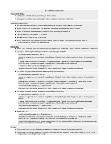 REGULAMIN KONKURSU CELE KONKURSU: Zachęcanie artystów do szukania nowych form wyrazu; Znajdywanie punktów stycznych między sztuką a zastosowaniem jej w biznesie; WARUNKI KONKURSU: Konkurs adresowany jest do studentów i absolwentów Akademii Sztuk Pięknych w Gdańsku.; Prace powinny być indywidualne, nie zbiorowe, podpisane nazwiskiem lub pseudonimem; Prace są składane w formie elektronicznej na adres: [email protected]; Termin składania prac upływa 11.11.2016; Finał konkursu odbędzie się 14.11.2016; Przez przekazanie prac Organizatorowi w ramach konkursu artysta nie przekazuje żadnych praw do wykorzystywania dzieła przez Organizatora; NAGRODY: Prace będą oceniane przez jury powołane przez organizatora w składzie: Damian Raupuk oraz Monika Markiewicz Za zajęcie pierwszego miejsca przewidziane są następujące nagrody: - wynagrodzenie w wysokości 500 zł; - zostanie podpisana umowa o dzieło na podstawie której artysta przekaże majątkowe prawa do zwycięskiego projektu; - futerał marki Mobiwear z naniesionym projektem laureata. Futerały są dostępne na kilkadziesiąt modeli telefonów. Lista z modelami znajduje się pod linkiem: http://mobiwear.pl/modele.pdf; - możliwość stałej współpracy z Organizatorem; - nagrodzona praca będzie wykorzystana przez Organizatora w jego działalności biznesowej. Za zajęcie drugiego miejsca przewidziane są następujące nagrody : - wynagrodzenie w wysokości 300 zł; - zostanie podpisana umowa o dzieło na podstawie której artysta przekaże majątkowe prawa do zwycięskiego projektu ; - futerał marki Mobiwear z naniesionym projektem laureata. Futerały są dostępne na kilkadziesiąt modeli telefonów. Lista z modelami znajduje się pod linkiem: http://mobiwear.pl/modele.pdf; - możliwość stałej współpracy z Organizatorem ; - nagrodzona praca będzie wykorzystana przez Organizatora w jego działalności biznesowej. Za zajęcie trzeciego miejsca przewidziane są następujące nagrody: - wynagrodzenie w wysokości 200 zł ; - zostanie podpisana umowa o dzieło na podstawie której artysta przekaże majątkowe prawa do zwycięskiego projektu; - futerał marki Mobiwear z naniesionym projektem laureata. Futerały są dostępne na kilkadziesiąt modeli telefonów. Lista z modelami znajduje się pod linkiem: http://mobiwear.pl/modele.pdf; - możliwość stałej współpracy z Organizatorem ; - nagrodzona praca będzie wykorzystana przez Organizatora w jego działalności biznesowej. Miejsca 4 – 10: - możliwość stałej współpracy z Organizatorem; - futerał marki Mobiwear z naniesionym projektem laureata. Futerały są dostępne na kilkadziesiąt modeli telefonów. Lista z modelami znajduje się pod linkiem: http://mobiwear.pl/modele.pdf; - możliwość podpisania umowy dzieło, na podstawie której artysta przekaże majątkowe prawa do zwycięskiego projektu (na wcześniej ustalonych warunkach) UWAGI: W sprawach spornych wynikających z regulaminu ostateczną decyzję podejmuje organizator; Dodatkowe informacje o konkursie można uzyskać mailowo pod adresem: [email protected] lub na stronie Organizatora: www.tropiki.mobiwear.pl ;