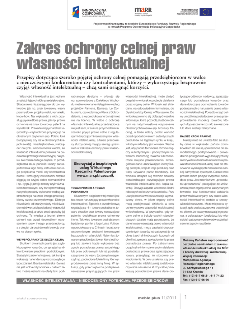 Zakres ochrony celnej praw własności intelektualnej Przepisy dotyczące szeroko pojętej ochrony celnej pomagają przedsiębiorcom w walce z nieuczciwymi konkurentami czy kontrahentami, którzy – wykorzystując bezprawnie czyjąś własność intelektualną – chcą sami osiągnąć korzyści. Własność intelektualna jest jednym z najistotniejszych dóbr przedsiębiorstwa. Składa się na nią szereg praw do tzw. wytworów, jak np. znak towarowy, wzory przemysłowe, projekty mebli, wynalazki, know-how. Na większość z nich przysługują określone prawa, jak np. prawo ochronne na znak towarowy, patent na wynalazek. Prawa te mają charakter terytorialny – czyli ochrona przysługuje na określonym terytorium (np. Polski, Unii Europejskiej, czy też w określonych krajach świata). Przedsiębiorstwa „walczące” na rynku o konsumenta wiedzą, że własność intelektualna pozwala na budowanie przewagi konkurencyjnej na rynku. Ale zanim do tego dojdzie, to przedsiębiorca musi ponieść koszty zaprojektowania logo firmy, zatrudnić dobrego projektanta mebli, czy konstruktora butów. Przestępcy intelektualni chętnie sięgają po czyjeś dobra niematerialne i np. sygnują swoje towary czyimś znakiem towarowym, czy też wprowadzają na rynek produkty wykonane według zastrzeżonego na rzecz innego przedsiębiorcy wzoru przemysłowego. Dlatego niezależnie od branży należy mieć świadomość wartości posiadanej własności intelektualnej, a także znać sposoby jej ochrony. Ta wiedza z jednej strony uchroni nas przed nieumyślnym naruszeniem praw innego przedsiębiorcy, a z drugiej da oręż do walki o swoje prawa na obcym rynku. WE WSPÓŁPRACY ZE SŁUŻBĄ CELNĄ Skutkiem otwartych granic jest szybki przepływ towarów, co sprzyja handlowi towarami pirackimi i podrobionymi. Statystyki zarówno krajowe, jak i unijne wskazują na tendencję wzrostową tego typu zdarzeń. Branża meblarska również nie jest wolna od podróbek – całkiem łatwo można natrafić na oferty tzw. pod- rabianego designu – oferuje się np. sprowadzone z Dalekiego Wschodu meble wykonane nielegalnie według projektów Pantona, Eamesa, Le Corbusier’a, czy rodzimego Klera z Dobrodzienia, a wyprodukowane bynajmniej nie na licencji. W walce o ochronę własności intelektualnej przedsiębiorca nie jest sam, w sukurs przychodzi m.in. szeroko pojęte prawo celne z regulacjami dotyczącymi naruszeń praw własności intelektualnej, a także pracownicy służby celnej mający szereg uprawnień w zakresie ochrony praw własności intelektualnej. Skorzystaj z bezpłatnych usług Wirtualnego Rzecznika Patentowego www.marr.pl/rzecznik TOWAR PIRACKI A TOWAR PODRABIANY Kluczowym pojęciem w tej materii jest tzw. towar naruszający prawo własności intelektualnej. Zgodnie z przedmiotową regulacją są nim towary podrabiane, towary pirackie oraz towary naruszające patenty, dodatkowe prawa ochronne i inne. Tak więc towarem podrabianym będzie np. portfel z logo Luisa Vuitton, wyprodukowany w Chinach i opatrzony wspomnianymi znakami towarowymi bez zgody ich właścicieli. Natomiast towarem pirackim jest towar, który jest kopią lub zawiera kopie wykonane bez zgody posiadacza prawa autorskiego lub praw pokrewnych lub też posiadacza prawa do wzoru (przemysłowego), czyli np. podrobione fotele firmy Kler wyprodukowane przez inną firmę. W sytuacji, gdy przedsiębiorca podejrzewa naruszenie przysługujących mu praw własności intelektualnej, może złożyć bezpłatny wniosek o podjęcie działania przez organy celne. Wniosek jest składany, na odpowiednim formularzu, do Dyrektora Izby Celnej w Warszawie. Do wniosku powinno się dołączyć wszelkie informacje, które pozwolą służbom celnym na natychmiastowe rozpoznanie określonych towarów (np. broszury, foldery), a także należy podać wartość przed opodatkowaniem autentycznych produktów na legalnym rynku w kraju, w którym składany jest wniosek. Ważne jest, aby podać techniczne różnice między autentycznymi i podejrzanymi towarami, lokalizację towarów lub zamierzone miejsce przeznaczenia, szczegółowe dane umożliwiające identyfikację przesyłki, kraj lub kraje produkcji oraz trasy używane przez handlarzy. Do wniosku dołącza się również dowody potwierdzające przysługujące prawa własności intelektualnej (np. kopia patentu). Decyzja zapada w terminie 30 dni roboczych od otrzymania wniosku. Przy uwzględnieniu wniosku zostaje wyznaczony okres, w jakim organy celne mają podejmować działania w celu ochrony prawa własności intelektualnej wnioskodawcy. W przypadku, gdy organy celne w trakcie swoich standardowych działań mają podejrzenie, że dane towary naruszają prawo własności intelektualnej, mogą zawiesić dopuszczenie tych towarów lub zatrzymać je na okres trzech dni roboczych liczonych od chwili otrzymania zawiadomienia przez posiadacza prawa. Po zatrzymaniu urząd celny informuje o swoim działaniu posiadacza prawa oraz zgłaszającego towary, przesyłając im stosowne zawiadomienie. W celu ustalenia, czy prawo własności intelektualnej zostało rzeczywiście naruszone służby celne przekazują posiadaczowi prawa dane do- WŁASNOŚĆ INTELEKTUALNA – NIEDOCENIONY POTENCJAŁ PRZEDSIĘBIORCÓW artykuł sponsorowany meble plus 11/2011 tyczące odbiorcy, nadawcy, zgłaszającego lub posiadacza towarów oraz dane dotyczące pochodzenia towarów podejrzanych o naruszenie prawa własności intelektualnej. Ponadto urząd celny umożliwia posiadaczowi prawa przeprowadzenie inspekcji towarów, których dopuszczenie zostało zawieszone lub które zostały zatrzymane. DALSZE KROKI PRAWNE Należy mieć na uwadze fakt, że służby celne w większości państw członkowskich UE nie są upoważnione do samodzielnego podejmowania i prowadzenia postępowań wyjaśniających czy rzeczywiście doszło do naruszenia prawa własności intelektualnej oraz do stosowania wynikających z naruszenia sankcji karnych lub cywilnych. Dalsz