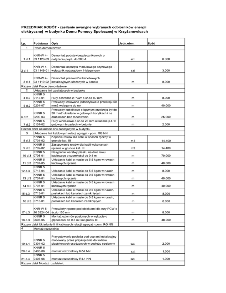 PRZEDMIAR ROBÓT - zasilanie awaryjne wybranych odbiorników energii elektrycznej w budynku Domu Pomocy Społecznej w Krzyżanowicach Lp. Podstawa 1 1 d.1 2 d.1 3 d.1 Opis 7 d.2 Ilość Prace demontażowe KNR-W 4- Demontaż podstawbezpiecznikowych o 03 1126-03 natężeniu prądu do 200 A szt. 6.000 KNR-W 4- Demontaż osprzętu modułowego szynowego 03 1149-01 wyłącznik nadprądowy 1-biegunowy szt 3.000 KNR-W 4- Demontaż przewodów kabelkowych 03 1119-02 instalacyjnych ułożonych w kanale m 8.000 m 8.000 m 40.000 m 25.000 m 2.000 m3 14.400 m3 14.400 m 70.000 m 40.000 m 8.000 m 40.000 m 40.000 m 8.000 m 8.000 m 8.000 m 48.000 Przygotowanie podłoża pod osprzęt instalacyjny mocowany przez przykręcenie do kołków plastykowych osadzonych w podłożu ceglanym szt. 2.000 montaz rozdzielnicy RZA NN szt. 1.000 montaz rozdzielnicy R4.1 NN szt. 1.000 Razem dział Prace demontażowe 2 Układanie linii zasilajacych w budynku KNNR 5 4 d.2 0113-01 Rury ochronne z PCW o śr.do 80 mm KNNR 5 Przewody izolowane jednożyłowe o przekroju 50 mm2 wciągane do rur 5 d.2 0201-07 6 d.2 Jedn.obm. KNNR 5 0209-03 KNNR 5 0101-02 Przewody kabelkowe o łącznym przekroju żył do 30 mm2 układane w gotowych korytkach i na drabinkach bez mocowania Rury winidurowe o śr.do 28 mm układane p.t. w gotowych bruzdach w betonie Razem dział Układanie linii zasilajacych w budynku 3 8 d.3 9 d.3 10 d.3 11 d.3 12 d.3 13 d.3 14 d.3 15 d.3 16 d.3 17 d.3 18 d.3 Układanie linii kablowych relacji agregat - pom. RG NN KNNR 5 Kopanie rowów dla kabli w sposób ręczny w 0701-02 gruncie kat. III KNNR 5 Zasypywanie rowów dla kabli wykonanych 0702-02 ręcznie w gruncie kat. III KNNR 5 Nasypanie warstwy piasku na dnie rowu 0706-01 kablowego o szerokości do 0.4 m KNNR 5 Układanie kabli o masie do 5.5 kg/m w rowach 0707-05 kablowych ręcznie KNNR 5 0713-04 Układanie kabli o masie do 5.5 kg/m w rurach KNNR 5 Układanie kabli o masie do 0.5 kg/m w rowach 0707-01 kablowych ręcznie KNNR 5 Układanie kabli o masie do 0.5 kg/m w rowach 0707-01 kablowych ręcznie KNNR 5 Układanie kabli o masie do 0.5 kg/m w rurach, 0713-01 pustakach lub kanałach zamkniętych KNNR 5 Układanie kabli o masie do 0.5 kg/m w rurach, 0713-01 pustakach lub kanałach zamkniętych KNR-W 510 0324-04 KNNR 5 0605-05 Przewierty ręczne pod obiektami dla rury PCW o śr.do 150 mm Montaż uziomów poziomych w wykopie o głębokości do 0.8 m; kat.gruntu III Razem dział Układanie linii kablowych relacji agregat - pom. RG NN 4 Montaż rozdzielnic 19 d.4 20 d.4 21 d.4 KNNR 5 0301-02 KNNR 5 0405-06 KNNR 5 0405-06 Razem dział Montaż rozdzielnic 5 25 d.5 Prace uzupełniające KNNR 5 0404-03 Montaż szafki SZR KNNR 5 Montaż końcówek kablowych przez zaciskanie 1204-03 przekrój żył do 50 mm2 KNNR 5 1207-12 Wykucie bruzd dla rur RKLG28, RS37 w cegle KNNR 5 1208-02 Zaprawianie bruzd o szerokości do 50 mm 26 d.5 KNNR 5 1203-01 Podłączenie przewodów pojedynczych o przekroju żyły do 2.5 mm2 pod zaciski lub bolce szt.żył 20.000 27 d.5 KNNR 5 1203-04 Podłączenie przewodów pojedynczych o przekroju żyły do 16 mm2 pod zaciski lub bolce szt.żył 30.000 28 d.5 KNNR 5 1203-05 Podłączenie przewodów pojedynczych o przekroju żyły do 50 mm2 pod zaciski lub bolce szt.żył 50.000 KNNR 5 0602-03 Przewody uziemiające i wyrównawcze w budynkach mocowane na kołkach wstrzeliwanych m 6.000 22 d.5 23 d.5 24 d.5 29 d.5 szt. 1.000 szt. 30.000 m 2.000 m 2.000 Razem dział Prace uzupełniające 6 Pomiary 30 d.6 KNNR 5 1303-01 Pomiar rezystancji izolacji instalacji elektrycznej obwód 1-fazowy (pomiar pierwszy) pomiar 1.000 31 d.6 KNNR 5 1303-02 Pomiar rezystancji izolacji instalacji elektrycznej obwód 1-fazowy (każdy następny pomiar) pomiar 3.000 32 d.6 KNNR 5 1303-03 Pomiar rezystancji izolacji instalacji elektrycznej obwód 3-fazowy (pomiar pierwszy) pomiar 1.000 KNNR 5 1303-04 KNNR 5 1304-06 KNNR 5 1304-01 KNNR 5 1304-02 Pomiar rezystancji izolacji instalacji elektrycznej obwód 3-fazowy (każdy następny pomiar) Badania i pomiary instalacji skuteczności zerowania (każdy następny pomiar) Badania i pomiary instalacji uziemiającej (pierwszy pomiar) Badania i pomiary instalacji uziemiającej (każdy następny pomiar) pomiar 4.000 szt. 6.000 szt. 1.000 szt. 1.000 szt. 1.000 szt 20.000 szt. 1.000 szt. 1.000 m 10.000 33 d.6 34 d.6 35 d.6 36 d.6 Razem dział Pomiary 7 37 d.7 38 d.7 Montaż i uruchomienie agregatu Kalkulacja Wykonanie fundamentu i montaż agregatu własna prądotwórczego na fundamencie kalkulacja koszt pierwszego uruchomienia, próby i własna przeszkolenie obsługi Razem dział Montaż i uruchomienie agregatu 8 39 d.8 40 d.8 41 d.8 Montaż głównego wyłącznika prądu KNNR 5 0406-02 Montaz głównego wyłącznika prądu KNNR 5 0406-01 Montaż przycisku GWP KNNR 5 0206-01 Przewody kabelkowe niepalne o łącznym przekroju żył do 7.5 mm2 układane n.t. na betonie Razem dział Montaż głównego wyłącznika prądu