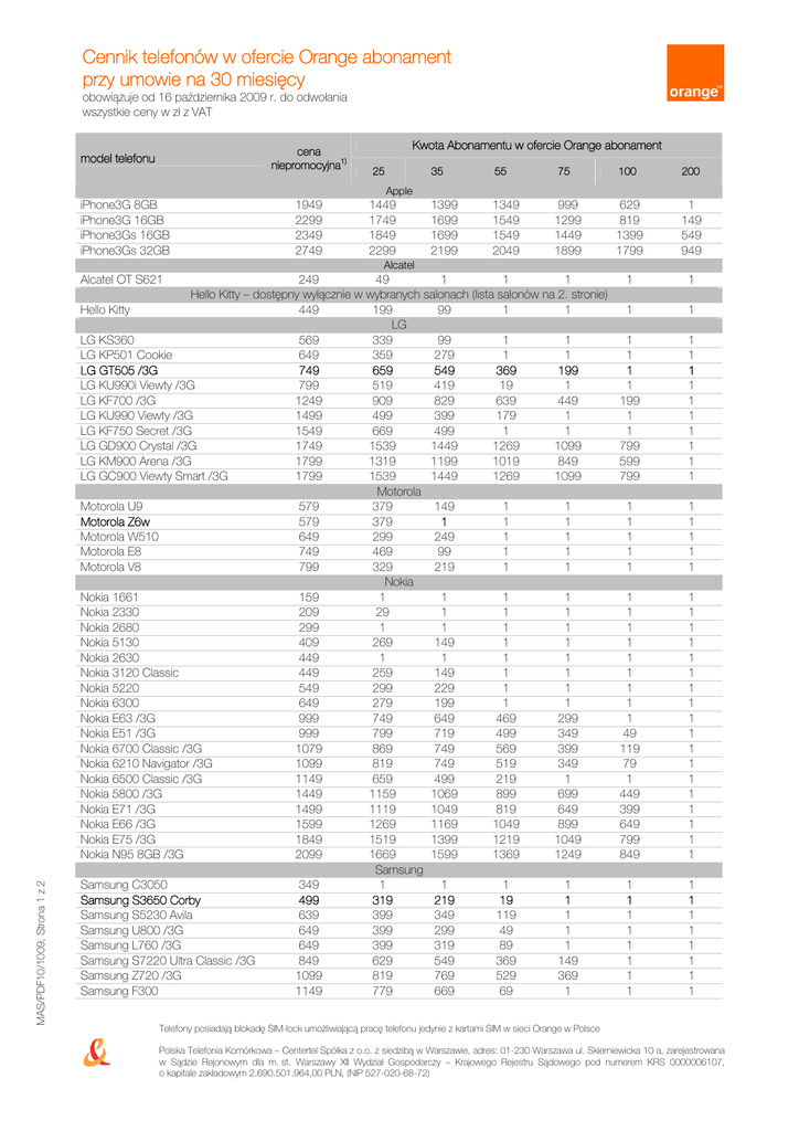 Cennik telefonów w ofercie Orange abonament przy umowie na 30 miesięcy obowiązuje od 16 października 2009 r. do odwołania wszystkie ceny w zł z VAT cena niepromocyjna1) model telefonu Kwota Abonamentu w ofercie Orange abonament 25 35 55 1399 1699 1699 2199 1349 1549 1549 2049 75 100 200 629 819 1399 1799 1 149 549 949 1 1 1 1 1 1 1 1 199 1 1 799 599 799 1 1 1 1 1 1 1 1 1 1 1 1 1 1 1 1 1 1 1 1 1 1 1 1 1 1 1 1 1 49 119 79 1 449 399 649 799 849 1 1 1 1 1 1 1 1 1 1 1 1 1 1 1 1 1 1 1 1 1 1 1 1 1 1 1 1 1 1 1 1 1 1 Apple iPhone3G 8GB iPhone3G 16GB iPhone3Gs 16GB iPhone3Gs 32GB 1949 2299 2349 2749 1449 1749 1849 2299 999 1299 1449 1899 Alcatel MAS/PDF10/1009, Strona 1 z 2 Alcatel OT S621 249 49 1 1 1 Hello Kitty – dostępny wyłącznie w wybranych salonach (lista salonów na 2. stronie) Hello Kitty 449 199 99 1 1 LG LG KS360 569 339 99 1 1 LG KP501 Cookie 649 359 279 1 1 LG GT505 /3G 749 659 549 369 199 LG KU990i Viewty /3G 799 519 419 19 1 LG KF700 /3G 1249 909 829 639 449 LG KU990 Viewty /3G 1499 499 399 179 1 LG KF750 Secret /3G 1549 669 499 1 1 LG GD900 Crystal /3G 1749 1539 1449 1269 1099 LG KM900 Arena /3G 1799 1319 1199 1019 849 LG GC900 Viewty Smart /3G 1799 1539 1449 1269 1099 Motorola Motorola U9 579 379 149 1 1 Motorola Z6w 579 379 1 1 1 Motorola W510 649 299 249 1 1 Motorola E8 749 469 99 1 1 Motorola V8 799 329 219 1 1 Nokia Nokia 1661 159 1 1 1 1 Nokia 2330 209 29 1 1 1 Nokia 2680 299 1 1 1 1 Nokia 5130 409 269 149 1 1 Nokia 2630 449 1 1 1 1 Nokia 3120 Classic 449 259 149 1 1 Nokia 5220 549 299 229 1 1 Nokia 6300 649 279 199 1 1 Nokia E63 /3G 999 749 649 469 299 Nokia E51 /3G 999 799 719 499 349 Nokia 6700 Classic /3G 1079 869 749 569 399 Nokia 6210 Navigator /3G 1099 819 749 519 349 Nokia 6500 Classic /3G 1149 659 499 219 1 Nokia 5800 /3G 1449 1159 1069 899 699 Nokia E71 /3G 1499 1119 1049 819 649 Nokia E66 /3G 1599 1269 1169 1049 899 Nokia E75 /3G 1849 1519 1399 1219 1049 Nokia N95 8GB /3G 2099 1669 1599 1369 1249 Samsung Samsung C3050 349 1 1 1 1 Samsung S3650 Corby 499 319 219 19 1 Samsung S5230 Avila 639 399 349 119 1 Samsung U800 /3G 649 399 299 49 1 Samsung L760 /3G 649 399 319 89 1 Samsung S7220 Ultra Classic /3G 849 629 549 369 149 Samsung Z720 /3G 1099 819 769 529 369 Samsung F300 1149 779 669 69 1 Telefony posiadają blokadę SIM-lock umożliwiającą pracę telefonu jedynie z kartami SIM w sieci Orange w Polsce Polska Telefonia Komórkowa – Centertel Spółka z o.o. z siedzibą w Warszawie, adres: 01-230 Warszawa ul. Skierniewicka 10 a, zarejestrowana w Sądzie Rejonowym dla m. st. Warszawy XII Wydział Gospodarczy – Krajowego Rejestru Sądowego pod numerem KRS 0000006107, o kapitale zakładowym 2.690.501.964,00 PLN, (NIP 527-020-68-72) Samsung F480 /3G Samsung U900 /3G Samsung S8300 Ultra Touch /3G Samsung I900 Omnia /3G Samsung I8910 Omnia HD /3G 1449 1499 1899 1999 2549 Sony Ericsson W205 Sony Ericsson W380i Sony Ericsson F305 z grami Sony Ericsson W350i Sony Ericsson C702 /3G Sony Ericsson C510 /3G Sony Ericsson C902 /3G Sony Ericsson W595s /3G Sony Ericsson C702 + Navifon /3G Sony Ericsson C702 z akc. samoch. + Navifon /3G Sony Ericsson C905 /3G Sony Ericsson X1 8GB z pakietem nawig. /3G 249 499 549 549 699 769 769 799 1049 SPV E650 HTC Touch Dual /3G HTC Diamond /3G HTC Magic /3G HTC Touch Pro /3G HTC Touch HD /3G 659 499 1249 1149 1579 1499 1559 1499 2229 2149 Sony Ericsson 79 1 259 99 299 199 359 1 529 429 519 399 559 499 549 449 769 699 269 899 1299 1319 1969 1 799 1099 1079 1779 1 399 869 849 1519 1 1 1 49 669 1 1 1 1 249 1 259 149 1 1 1 1 1 69 1 49 1 1 1 1 1 1 1 1 1 1 1 1 1 1 1 1 1 1 1 1 1 1199 1749 959 1399 879 1349 1 1149 1 949 1 699 1 2449 2079 1999 1819 1619 1349 499 1199 1699 1899 1849 2399 2449 HTC 499 1449 1559 1669 1959 2039 449 1399 1499 1549 1899 1949 219 1199 1269 1399 1719 1749 99 1049 1099 1199 1599 1599 1 599 849 949 1199 1299 1 1 1 99 299 469 1) Cena niepromocyjna dotyczy zakupu telefonu przy umowie na 12 miesięcy lub na czas nieokreślony oraz przy zakupie telefonu bez aktywacji w ofercie Orange Abonament lub Orange Mix. MAS/PDF10/1009, Strona 2 z 2 Telefon Hello Kitty dostępny jest wyłącznie w dwóch salonach Orange: Centrum Handlowe Blue City (Al. Jerozolimskie 179, Warszawa) Centrum Handlowe Wola Park (ul. Górczewska 124, Warszawa) oraz w sklepie internetowym www.orange.pl. Telefony posiadają blokadę SIM-lock umożliwiającą pracę telefonu jedynie z kartami SIM w sieci Orange w Polsce. Polska Telefonia Komórkowa Centertel Spółka z o.o. z siedzibą w Warszawie, adres: 01-230 Warszawa ul. Skierniewicka 10 a, zarejestrowana w Sądzie Rejonowym dla m. st. Warszawy XII Wydział Gospodarczy – Krajowego Rejestru Sądowego pod numerem KRS 0000006107, o kapitale zakładowym 2.690.501.964,00 PLN, (NIP 527-020-68-72)