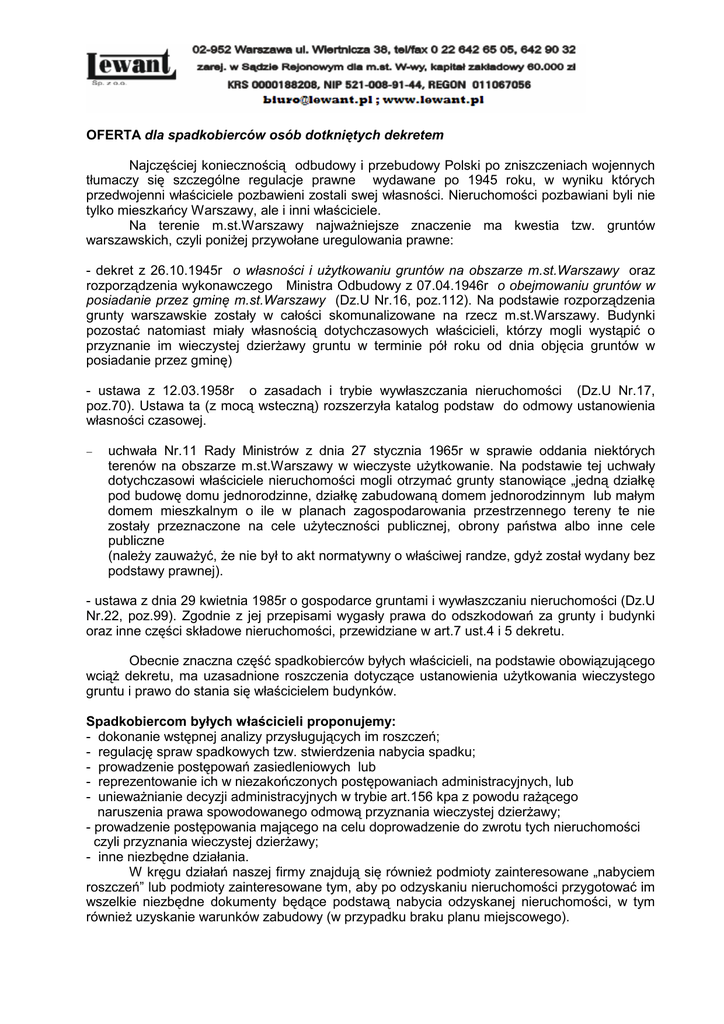OFERTA dla spadkobierców osób dotkniętych dekretem Najczęściej koniecznością odbudowy i przebudowy Polski po zniszczeniach wojennych tłumaczy się szczególne regulacje prawne wydawane po 1945 roku, w wyniku których przedwojenni właściciele pozbawieni zostali swej własności. Nieruchomości pozbawiani byli nie tylko mieszkańcy Warszawy, ale i inni właściciele. Na terenie m.st.Warszawy najwaŜniejsze znaczenie ma kwestia tzw. gruntów warszawskich, czyli poniŜej przywołane uregulowania prawne: - dekret z 26.10.1945r o własności i uŜytkowaniu gruntów na obszarze m.st.Warszawy oraz rozporządzenia wykonawczego Ministra Odbudowy z 07.04.1946r o obejmowaniu gruntów w posiadanie przez gminę m.st.Warszawy (Dz.U Nr.16, poz.112). Na podstawie rozporządzenia grunty warszawskie zostały w całości skomunalizowane na rzecz m.st.Warszawy. Budynki pozostać natomiast miały własnością dotychczasowych właścicieli, którzy mogli wystąpić o przyznanie im wieczystej dzierŜawy gruntu w terminie pół roku od dnia objęcia gruntów w posiadanie przez gminę) - ustawa z 12.03.1958r o zasadach i trybie wywłaszczania nieruchomości (Dz.U Nr.17, poz.70). Ustawa ta (z mocą wsteczną) rozszerzyła katalog podstaw do odmowy ustanowienia własności czasowej. − uchwała Nr.11 Rady Ministrów z dnia 27 stycznia 1965r w sprawie oddania niektórych terenów na obszarze m.st.Warszawy w wieczyste uŜytkowanie. Na podstawie tej uchwały dotychczasowi właściciele nieruchomości mogli otrzymać grunty stanowiące „jedną działkę pod budowę domu jednorodzinne, działkę zabudowaną domem jednorodzinnym lub małym domem mieszkalnym o ile w planach zagospodarowania przestrzennego tereny te nie zostały przeznaczone na cele uŜyteczności publicznej, obrony państwa albo inne cele publiczne (naleŜy zauwaŜyć, Ŝe nie był to akt normatywny o właściwej randze, gdyŜ został wydany bez podstawy prawnej). - ustawa z dnia 29 kwietnia 1985r o gospodarce gruntami i wywłaszczaniu nieruchomości (Dz.U Nr.22, poz.99). Zgodnie z jej przepisami wygasły prawa do odszkodowań za grunty i budynki oraz inne części składowe nieruchomości, przewidziane w art.7 ust.4 i 5 dekretu. Obecnie znaczna część spadkobierców byłych właścicieli, na podstawie obowiązującego wciąŜ dekretu, ma uzasadnione roszczenia dotyczące ustanowienia uŜytkowania wieczystego gruntu i prawo do stania się właścicielem budynków. Spadkobiercom byłych właścicieli proponujemy: - dokonanie wstępnej analizy przysługujących im roszczeń; - regulację spraw spadkowych tzw. stwierdzenia nabycia spadku; - prowadzenie postępowań zasiedleniowych lub - reprezentowanie ich w niezakończonych postępowaniach administracyjnych, lub - uniewaŜnianie decyzji administracyjnych w trybie art.156 kpa z powodu raŜącego naruszenia prawa spowodowanego odmową przyznania wieczystej dzierŜawy; - prowadzenie postępowania mającego na celu doprowadzenie do zwrotu tych nieruchomości czyli przyznania wieczystej dzierŜawy; - inne niezbędne działania. W kręgu działań naszej firmy znajdują się równieŜ podmioty zainteresowane „nabyciem roszczeń” lub podmioty zainteresowane tym, aby po odzyskaniu nieruchomości przygotować im wszelkie niezbędne dokumenty będące podstawą nabycia odzyskanej nieruchomości, w tym równieŜ uzyskanie warunków zabudowy (w przypadku braku planu miejscowego). 2 Roszczenia dekretowe są trudną i złoŜoną sferą praw byłych właścicieli. Decydujące znaczenie dla uzyskania powodzenia w dochodzeniu tych roszczeń ma czas jaki upłynął od chwili wejścia w Ŝycie „dekretu bierutowskiego” tj. ponad 60 lat. Konsekwencją upływu czasu są trudności w odszukaniu dokumentów źródłowych zaświadczających o istnieniu bądź braku roszczeń, które przechowywane są często w prywatnych zbiorach archiwalnych, czy teŜ wśród rodzinnych pamiątek. RównieŜ zasoby archiwalne znajdujące się w urzędach prowadzących sprawy roszczeń lub archiwizujących dokumentację są w duŜej mierze zdekompletowane. Podstawową kwestią jest udowodnienie złoŜenia przez byłego właściciela wniosku dekretowego we właściwym określonym przez prawo terminie. Dopiero udowodnienie złoŜenia takiego wniosku daje pełną podstawę do skutecznego złoŜenie wniosku nie wyklucza prawnych moŜliwości odzyskania nieruchomości przy spełnieniu innych warunków przewidzianych przez prawo. Lecz nawet wówczas, gdy wniosek dekretowy został złoŜony w terminie 6 miesięcy licząc od dnia objęcia nieruchomości warszawskiej w imieniu M. St. Warszawy, naleŜy zgromadzić pozostałe niezbędne dokumenty, które składają się na cały kompletny materiał dowodowy dający podstawę do wydania decyzji o zwrocie lub uprzedniego uchylenia decyzji odmawiającej zwrotu a następnie wydania decyzji o zwrocie czyli ustanowienia wieczystej dzierŜawy. Takimi dowodami są przykładowo materiały z planu zagospodarowania przestrzennego określające przeznaczenie nieruchomości w ówczesnym planie, decyzje uzgadniające i opinie wydawane przez urzędy, dokumenty zaświadczające o uregulowanie spraw spadkowych wymagające często poszukiwania i odszukania (najlepiej) wszystkich spadkobierców, którzy bardzo często nie wiedzą o swoim istnieniu. Zapraszamy do zapoznania się z szczegółowym profilem działalności naszej firmy na www.lewant.pl. Posiadamy duŜe doświadczenie i stosowne rekomendacje. Jeśli jesteście Państwo zainteresowani sygnalizowaną problematyką proponujemy spotkanie w dogodnym dla Państwa terminie.