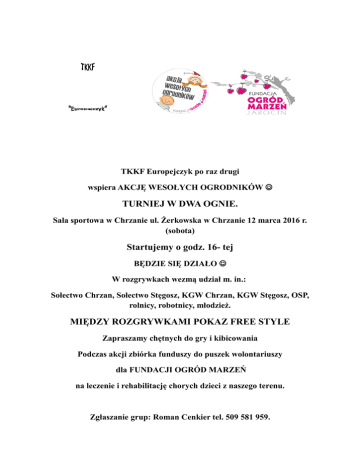 TKKF Europejczyk po raz drugi wspiera AKCJĘ WESOŁYCH OGRODNIKÓW TURNIEJ W DWA OGNIE. Sala sportowa w Chrzanie ul. Żerkowska w Chrzanie 12 marca 2016 r. (sobota) Startujemy o godz. 16- tej BĘDZIE SIĘ DZIAŁO W rozgrywkach wezmą udział m. in.: Sołectwo Chrzan, Sołectwo Stęgosz, KGW Chrzan, KGW Stęgosz, OSP, rolnicy, robotnicy, młodzież. MIĘDZY ROZGRYWKAMI POKAZ FREE STYLE Zapraszamy chętnych do gry i kibicowania Podczas akcji zbiórka funduszy do puszek wolontariuszy dla FUNDACJI OGRÓD MARZEŃ na leczenie i rehabilitację chorych dzieci z naszego terenu. Zgłaszanie grup: Roman Cenkier tel. 509 581 959.