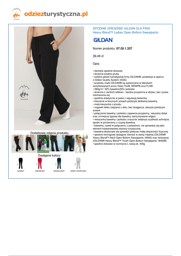 SPODNIE DRESOWE GILDAN DLA PANI Heavy Blend™ Ladies Open Bottom Sweatpants Numer produktu: 07.GI.1.337 39,49 zł Opis: • damskie spodnie dresowe • dzianina średnio gruba • solidna jakość kanadyjskiej firmy GILDAN®, produkcja w oparciu o Gildan Quality System (GQS) • produkty marki GILDAN® są wytwarzane w fabrykach certyfikowanych przez Oeko-Tex®, WRAP® oraz FLA® • 280g/m², 50% bawełna/50% poliester • dzianina z cienkich włókien - bardzo przyjemna w dotyku, bez ryzyka mechacenia się • spodnie elastyczne w pasie z regulacją tasiemką • kieszenie w bocznych szwach podszyte delikatną bawełną • mała kieszonka z przodu • nogawki lekko zwężane u dołu, bez ściągacza, obszyte potrójnym szwem • połączenie bawełny i poliestru zapewnia przyjemny, naturalny dotyk oraz zmniejsza typowe dla bawełny zatrzymywanie wilgoci • mieszanka bawełny i poliestru znacznie zwiększa szybkość schnięcia spodni w porównaniu z czystą bawełną • bawełna, nawet w połączeniu z poliestrem, nie sprawdza się jako element trójwarstwowej odzieży turystycznej • bawełna doskonale się sprawdzi podczas małej aktywności fizycznej • spodnie treningowe dostępne również w wersji męskiej (GILDAN® Heavy Blend™ Adult Open Bottom Sweatpants 18400) oraz dziecięcej (GILDAN® Heavy Blend™ Youth Open Bottom Sweatpants 18400B) • spodnie dresowe w rozmiarze L ważą ok. 430g Dodatkowe zdjęcia produktu Dostępne kolory: CZARNY Powered by TCPDF (www.tcpdf.org) CZERWONY GRANATOWY SZARY SPORTOWY