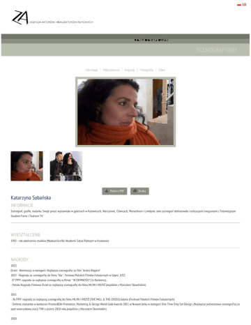 SCENOGRAFOWIE SCENOGRAFOWIE Pobierz PDF Drukuj Katarzyna Sobańska INFORMACJE Scenograf, grafik, malarka. Swoje prace wystawiała w galeriach w Katowicach, Warszawie, Gliwicach, Monachium i Londynie. Jako scenograf debiutowała realizacjami związanymi z Telewizyjnym Studiem Form i Teatrem TV. WYKSZTAŁCENIE 1992 - rok ukończenia studiów (Wydział Grafiki Akademii Sztuk Pięknych w Krakowie) NAGRODY 2013 Orzeł - Nominacja w kategorii: Najlepsza scenografia za film "Jesteś Bogiem" 2013 - Nagroda za scenografię do filmu "Ida", Festiwal Polskich Filmów Fabularnych w Gdyni. 2012 -37 FPFF nagroda za najlepsza scenografię w filmie " W CIEMNOŚCI"( In Darkness) , - Polska Nagroda Filmowa Orzeł za najlepszą scenografię do filmu MŁYN I KRZYŻ (wspólnie z Marcelem Sławińskim) 2011 - 36 FPFF nagroda za najlepszą scenografię do filmu MŁYN I KRZYŻ (THE MILL & THE CROSS) Gdynia (Festiwal Polskich Filmów Fabularnych) - Srebrna statuetka w konkursie PromaxBDA Promotion, Marketing & Design World Gold Awards 2011 w Nowym Jorku w kategorii One Time Only Set Design; (Najlepsza jednorazowa scenografia) za spot wizerunkowy stacji TVN z jesieni 2010 roku.(wspólnie z Marcelem Sławińskim) 2010 - Nagroda (śląska "Złota Maska" za scenografię do spektaklu "Oliver!" Lionela Barta w reżyserii Magdaleny Piekorz w Teatrze Rozrywki w Chorzowie) 2008 - STYGMATYCZKA - Sopot (Krajowy Festiwal Teatry Polskiego Radia i Teatru TV "Dwa Teatry") - nagroda za scenografię 2002 - ANGELUS, reż. L. Majewski - nominacja do Polskiej Nagrody Filmowej Orzeł w kategorii : najlepsza scenografia za rok 2001 1999 - TOROWISKO Koszalin (KSF "Młodzi i Film") nagroda SFP za kształt wizualny filmu; przyznana przez Jury Profesjonalne FILMOGRAFIA 2016 ZIMNA WOJNA, reż. Paweł Pawlikowski, (w produkcji) ZA NIEBIESKIMI DRZWIAMI, reż. M. Palej, 2015 EDERLY - reż. P. Dumała, MIŁOŚĆ W MIEŚCIE OGRODÓW - reż.Adam Sikora ZJEDNOCZONE STANY MIŁOŚCI - reż.Tomasz Wasilewski NOC WALPURGI - reż.Marcin Bortkiewicz 2014 OBIETNICA - reż.Anna Kazejak KARSKI - reż.Magda Łazarkiewicz 2013 GRY - reż.Maciej Marczewski IDA - reż.Paweł Pawlikowski SKUTKI UBOCZNE - reż.Leszek Dawid TRZY RAZY FREDRO - reż.Jerzy Sthur 2012: ZBLIŻENIA - reż. Magdalena Piekorz MIŁOŚĆ W MIEŚCIE OGRÓDÓW - reż. Ingmar Villqist, Adam Sikora SIOSTRA MIŁOSIERDZIA - reż. Paweł Pawlikowski JESTEŚ BOGIEM- reż. Leszek Dawid 2011 BYĆ JAK KAZIMIERZ DEYNA- reż. Anna Wieczur-Bluszcz MOJA AUSTRALIA-reż.Ami Drozd IN DARKNESS- reż.Agnieszka Holland 2010 THE MILE&THE CROSS -reż.Lech Majewski MARATON TAŃCA-reż.Magdalena Łazarkiewicz EWA - reż.Adam Sikora 2009: NIGDY NIE MÓW NIGDY-reż.Wojciech Pacyna 2008-2009: TERAZ ALBO NIGDY2008: SENNOŚĆ-reż.Magdalena Piekorz BOISKO BEZDOMNYCH-reż.Katarzyna Adamik 0_1_0-reż.Piotr Łazarkiewicz 2007: EKIPA- reż.A.Holland, M.Łazarkiewicz,K.Adamik 2004-2006: BULIONERZY-reż.G.Warchoł, A.Kostenko, K.Łukaszewicz 2003: ZOSTAĆ MISS 2-reż.Wojciech Pacyna 2003-2004: RODZINKA 2002: JULIA WRACA DO DOMU-reż.Agnieszka Holland 2001: ZOSTAĆ MISS-reż.Wojciech Pacyna ANGELUS-reż.Lech Majewski 1999: TOROWISKO-reż.Urszula Urbaniak NA KONIEC ŚWIATA-reż.Magdalena Łazarkiewicz 1997: POKÓJ SAREN-reż.Lech Majewski WYBRANE SPEKTAKLE TEATRU TV: 2009: NAPIS-reż.Maciej Englert 2008: MORD ZAŁOŻYCIELSKI-Maciej Pisuk KONCERT ŻYCZEŃ-Beata Dzianowicz 2007: STYGMATYCZKA-reż.Wojciech Nowak 2006: TRELEMORELE-reż.Piotr Łazarkiewicz DOBRZE-Tomasz Man 2005: FOTOPLASTIKON-Piotr Łazarkiewicz 2003: PRZYPADEK KLARY-reż.Magdalena Łazarkiewicz MARTWA KRÓLEWNA-reż.Piotr Łazarkiewicz LEKCJA ANGIELSKIEGO-reż.Jarosław Marczewski 2002: COURAGE MOJEJ MATKI-reż.M.Łazarkiewicz 2000: PRZETARG-reż.Krzysztof Balicki GOLDEN JOE-reż.Wojciech Nowak 1998: GDY TAŃCZYŁA IZADORA-reż.M.Łazarkiewicz DUŻE I MAŁE--reż.Piotr Łazarkiewicz DOKUMENT PODRÓŻY-reż.M.Łazarkiewicz, Gołda Tencer 1997: DIABELSKI PATROL-reż.Urszula Urbaniak 1996: TRYPTYK-reż.Urszula Urbaniak WYBRANE SPEKTAKLE TEATRALNE: 2011 BALLADYNA , reż. I. Villqist, Teatr Nowy Zabrze - scenografia i kostiumy 2010 WIZYTA STARSZEJ PANI , reż. M. Piekorz, Teatr Śląski im. Stanisława Wyspiańskiego Katowice HOTEL NOWY ŚWIAT , reż. M. Piekorz, Teatr Polski Bielsko-Biała 2009 KOMPOZYCJA W BŁĘKICIE, reż. I. Villqist, Teatr na Woli Warszawa OLIVER!, reż. M. Piekorz, Teatr Rozrywki Chorzów MIŁOŚĆ I GNIEW , reż. M. Piekorz, Teatr im. Juliusza Słowackiego Kraków 2008 NAPIS , reż. W. Patlewicz, Teatr Polski Bielsko-Biała MĘŻCZYŹNI NA SKRAJU ZAŁAMANIA NERWOWEGO, reż. P. Łazarkiewicz, Teatr Bajka Warszawa ANTONI S., CZYLI WIEŻA BABEL, reż. P. Łazarkiewicz, Teatr im. Stanisława Ignacego Witkiewicza Zakopane 2007 PLOTKA, reż. T. Man, Teatr Miejski im. Witolda Gombrowicza Gdynia DZIKA KACZKA, reż. M. Łazarkiewicz, Teatr im. Juliusza Słowackiego Kraków METODA , reż. P. Łazarkiewicz, Teatr Komedia Warszawa 2006 CZARNY PUNKT , reż. P. Łazarkiewicz, Teatr im. Stanisława Ignacego Witkiewicza Zakopane 3 X 2, reż. P. Łazarkiewicz, Teatr Stara ProchOFFnia Warszawa 2005 SZKLANA KOLEKCJA, reż. M. Łazarkiewicz, Teatr Nowy Praga Warszawa KARTOTEKA, reż. P. Łazarkiewicz, Teatr Miejski im. Witolda Gombrowicza Gdynia 2004 ŚMIECI, reż. P. Łazarkiewicz, Teatr Współczesny Szczecin PAJACE, reż. M. Łazarkiewicz, Teatr Wielki Łódź 2003 RYCERSKOŚĆ WIEŚNIACZA, , reż. M. Łazarkiewicz, Teatr Wielki Łódź LOMBARD POD APOKALIPSĄ, reż. P. Łazarkiewicz, Teatr Polski Warszawa PANNA JULIA, reż. P. Łazarkiewicz, Teatr im. Wandy Siemaszkowej Rzeszów 2002 NONDUM, reż. M. Łazarkiewicz, Teatr im. Juliusza Słowackiego Kraków DOWCIP, reż. M. Łazarkiewicz, Teatr Studio im. Stanisława Ignacego Witkiewicza Warszawa NORWAY.TODAY, reż. P. Łazarkiewicz, Teatr Polski Bielsko-Biała VIDEO Rutinoscorbin TVP spot wizerunkowy 2012 Netia 2 Netia TVN jesienna ramówka TVN Bank Milennium © 2008-2010 „ZA” agencja aktorów i realizator