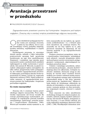 Kszta∏cenie, doskonalenie Aran˝acja przestrzeni w przedszkolu ■ MA¸GORZATA FALKIEWICZ-SZULT (Szczecin) Zagospodarowanie przestrzeni powinno byç funkcjonalne i bezpieczne pod ka˝dym wzgl´dem. Znacznà rol´ w aran˝acji wn´trza przedszkolnego odgrywa nauczycielka. O prócz dzia∏alnoÊci pedagogicznej bardzo wa˝na jest aran˝acja otoczenia, w jakim si´ ona odbywa. Jest to czynnik warunkujàcy rozwój, pomyÊlnà adaptacj´, ˝yczliwà atmosfer´, wspó∏dzia∏anie w zespole dzieci´cym. Psychologowie przyznajà, ˝e otaczajàce dziecko sprz´ty, zabawki, a tak˝e kolorystyka pomieszczenia sprzyjajà bàdê ograniczajà kszta∏towanie si´ jego sfery psychofizycznej. ZnajomoÊç i rozumienie tego zjawiska przez nauczycieli to jeden z podstawowych czynników wp∏ywajàcych na efekty wychowania w przedszkolu. Jak zauwa˝a B. Âliwerski, na jakoÊç warunków edukacyjnych wp∏ywa niewàtpliwie nie tylko dobrze przygotowana kadra pedagogiczna, ale i w∏aÊciwe zagospodarowanie przestrzeni edukacyjnej, pozwalajàcej dziecku swoim wyposa˝eniem na zabaw´, uczenie si´, wspieranie aktywnoÊci ruchowej (1993). Nale˝y jednak wyraênie zaznaczyç, ˝e zagospodarowanie przestrzeni powinno byç funkcjonalne i bezpieczne pod ka˝dym wzgl´dem. Co mo˝e nauczycielka? Znacznà rol´ w aran˝acji wn´trza przedszkolnego odgrywa nauczycielka. Przez odpowiednie wyposa˝enie sali tworzy warunki dla rozwoju psychofizycznego wychowanków, pozwalajàce na zaspokojenie potrzeby kontaktu emocjonalnego, spo∏ecznego, potrzeby poznania i bezpieczeƒstwa (Szymaƒska, 1986). WÊród tych warunków mo˝na wymieniç te, na 396 WYCHOWANIE W PRZEDSZKOLU które nauczycielka nie ma wp∏ywu, np. ograniczenia architektoniczne i te, o których sama mo˝e decydowaç, np. aran˝acja wn´trza. Nauczycielka nie ma wi´c wp∏ywu na to, jakà przestrzeƒ otrzymuje do dyspozycji, ale ma znacznà swobod´ w jej zagospodarowaniu (Arends, 1995). Przyj´cie powy˝szej perspektywy wià˝e si´ z dostarczaniem ró˝norodnych, wielofunkcyjnych zabawek i narz´dzi skrupulatnie dobranych pod kàtem wartoÊci estetycznych, pedagogicznych i technicznych, odpowiadajàcych naturalnym potrzebom dzieci. Ciekawe i stymulujàce przedmioty, zabawki, instrumenty perkusyjne, „skrzynie skarbów” inspirujà dzieci do odkrywania, rozwijania wyobraêni i dzia∏ania. Zwrócenie uwagi na adekwatnà do wzrostu dzieci wysokoÊç krzese∏, stolików jest równie˝ zadaniem ka˝dej nauczycielki. PrzemyÊlenia wymaga tak˝e wydzielenie odpowiednich miejsc w sali, które umownie mo˝na nazwaç np. „kàcikiem ciszy”. Miejsca te b´dà s∏u˝y∏y do Êwiadomego oddzielenia si´ dziecka od rówieÊników, w razie potrzeby wyciszenia i zaznania spokoju czy ch´ci prowadzenia wzajemnych rozmów, zwierzeƒ w ma∏ych grupach. Du˝e znaczenie ma tak˝e umo˝liwienie swobodnego dost´pu do ró˝nych urzàdzeƒ, materia∏ów, zabawek, ksià˝ek, kàcików zainteresowaƒ itp. Jak twierdzi W. Hajnicz, dost´pnoÊç ca∏oÊci otoczenia, a w tym równie˝ zabawek, jest cechà najbardziej stymulujàcà aktywnoÊç dzieci (1985, s. 200). Nieod∏àcznym elementem aran7/2003 Kszta∏cenie, doskonalenie ˝acji przestrzeni jest stworzenie miejsc swobodnej aktywnoÊci dziecka, sprzyjajàcych stymulowaniu i wspó∏dzia∏aniu w zespole (por. Brzeziƒska, 1990; Âliwerski, 1993). Nie bez znaczenia wydaje si´ tak˝e starannie zaprojektowany wystrój pomieszczeƒ. Dziecko b´dzie czu∏o si´ dobrze w sali przedszkolnej wtedy, kiedy jej wyposa˝enie i udekorowanie nie b´dà stanowi∏y przestrzeni ograniczajàcej rozwój oraz poczucie wolnoÊci zewn´trznej i wewn´trznej zarówno dzieci, jak i nauczycielek (Âliwerski, 1993, s. 72). Zdaniem E. T. Halla u∏o˝enie przedmiotów w przestrzeni mo˝e zach´caç lub zniech´caç do kontaktowania si´; b´dzie sprzyja∏o lub przeszkadza∏o w nawiàzywaniu kontaktów (Kielar-Turska, 1992). Mo˝e tak˝e z jednej strony sprawiaç wra˝enie ∏adu i harmonii, z drugiej zaÊ – chaosu i niepokoju. Pragn´ zwróciç uwag´ na: • preferowane sposoby zagospodarowania przestrzeni w przedszkolu przez badane nauczycielki; • konsekwencje pozytywne i negatywne dla rozwoju dziecka wynikajàce z okreÊlonego sposobu aran˝acji przestrzeni; • êród∏a, do jakich nauczycielki si´gajà, z jakich czerpià argumenty i przes∏anki dla swoich dzia∏aƒ. Za pomocà sonda˝u diagnostycznego i odpowiednio dobranych do tej metody technik badawczych, takich jak: ankieta, obserwacja naturalnych zdarzeƒ w przedszkolu i swobodny wywiad narracyjny, zebrano informacje na ten temat. W badaniach bra∏o udzia∏ 261 nauczycielek. Obserwacje zachowaƒ nauczycielek ukaza∏y ró˝norodny sposób aran˝acji sali przedszkolnej. Wywiad wykorzystano w celu zweryfikowania danych uzyskanych na podstawie analizy odpowiedzi ankietowych i analizy zapisów obserwacji. Badania przeprowadzono w 2000/2001 roku. Nale˝y zaznaczyç, i˝ interpretacje zawarte w tym opracowaniu odnoszà si´ tylko do badanej grupy i trudno je uogólniaç. Wyniki badaƒ Stosunek badanych nauczycielek do poruszanej kwestii nie jest jednoznaczny. Ponad trzecia cz´Êç badanych uwa˝a, ˝e przestrzeƒ dla dziecka nale˝y kszta∏towaç na podstawie ˝y7/2003 czeƒ, upodobaƒ i potrzeb wszystkich cz∏onków grupy. Nauczycielki zdajà sobie spraw´ z tego, ˝e udost´pniona im przestrzeƒ jest miejscem dla wszystkich uczestników edukacji, którzy majà takie samo prawo do jej wykorzystania. Jak wynika z relacji wychowawczyƒ, rozmieszczenie ksià˝ek, zabawek, urzàdzanie kàcików do pracy, zabawy itp. powinno odbywaç si´ z udzia∏em dzieci jako wspó∏gospodarzy sali. Ponadto wszystkie znajdujàce si´ sprz´ty – jak twierdzà badane – majà u∏atwiaç prowadzenie zaj´ç i dawaç mo˝liwoÊç wyboru dowolnej formy aktywnoÊci. Pozwala to na modyfikowanie przez dzieci przestrzeni zgodnie z potrzebami w danej chwili. Przez umo˝liwienie wychowankom