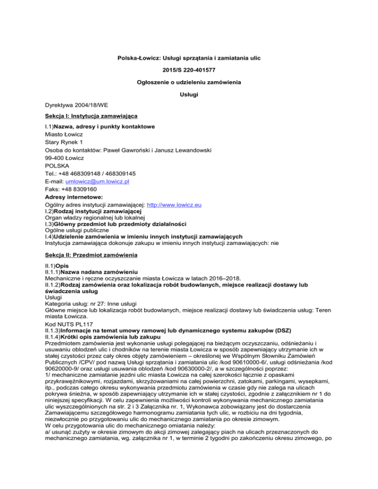 Polska-Łowicz: Usługi sprzątania i zamiatania ulic 2015/S 220-401577 Ogłoszenie o udzieleniu zamówienia Usługi Dyrektywa 2004/18/WE Sekcja I: Instytucja zamawiająca I.1)Nazwa, adresy i punkty kontaktowe Miasto Łowicz Stary Rynek 1 Osoba do kontaktów: Paweł Gawroński i Janusz Lewandowski 99-400 Łowicz POLSKA Tel.: +48 468309148 / 468309145 E-mail: [email protected] Faks: +48 8309160 Adresy internetowe: Ogólny adres instytucji zamawiającej: http://www.lowicz.eu I.2)Rodzaj instytucji zamawiającej Organ władzy regionalnej lub lokalnej I.3)Główny przedmiot lub przedmioty działalności Ogólne usługi publiczne I.4)Udzielenie zamówienia w imieniu innych instytucji zamawiających Instytucja zamawiająca dokonuje zakupu w imieniu innych instytucji zamawiających: nie Sekcja II: Przedmiot zamówienia II.1)Opis II.1.1)Nazwa nadana zamówieniu Mechaniczne i ręczne oczyszczanie miasta Łowicza w latach 2016–2018. II.1.2)Rodzaj zamówienia oraz lokalizacja robót budowlanych, miejsce realizacji dostawy lub świadczenia usług Usługi Kategoria usług: nr 27: Inne usługi Główne miejsce lub lokalizacja robót budowlanych, miejsce realizacji dostawy lub świadczenia usług: Teren miasta Łowicza. Kod NUTS PL117 II.1.3)Informacje na temat umowy ramowej lub dynamicznego systemu zakupów (DSZ) II.1.4)Krótki opis zamówienia lub zakupu Przedmiotem zamówienia jest wykonanie usługi polegającej na bieżącym oczyszczaniu, odśnieżaniu i usuwaniu oblodzeń ulic i chodników na terenie miasta Łowicza w sposób zapewniający utrzymanie ich w stałej czystości przez cały okres objęty zamówieniem – określonej we Wspólnym Słowniku Zamówień Publicznych /CPV/ pod nazwą Usługi sprzątania i zamiatania ulic /kod 90610000-6/, usługi odśnieżania /kod 90620000-9/ oraz usługi usuwania oblodzeń /kod 90630000-2/, a w szczególności poprzez: 1/ mechaniczne zamiatanie jezdni ulic miasta Łowicza na całej szerokości łącznie z opaskami przykrawężnikowymi, rozjazdami, skrzyżowaniami na całej powierzchni, zatokami, parkingami, wysepkami, itp., podczas całego okresu wykonywania przedmiotu zamówienia w czasie gdy nie zalega na ulicach pokrywa śnieżna, w sposób zapewniający utrzymanie ich w stałej czystości, zgodnie z załącznikiem nr 1 do niniejszej specyfikacji. W celu zapewnienia możliwości kontroli wykonywania mechanicznego zamiatania ulic wyszczególnionych na str. 2 i 3 Załącznika nr. 1, Wykonawca zobowiązany jest do dostarczenia Zamawiającemu szczegółowego harmonogramu zamiatania tych ulic, w rozbiciu na dni tygodnia, niezwłocznie po przygotowaniu ulic do mechanicznego zamiatania po okresie zimowym. W celu przygotowania ulic do mechanicznego omiatania należy: a/ usunąć zużyty w okresie zimowym do akcji zimowej zalegający piach na ulicach przeznaczonych do mechanicznego zamiatania, wg. załącznika nr 1, w terminie 2 tygodni po zakończeniu okresu zimowego, po ustąpieniu mrozów i niezaleganiu na ulicach pokrywy śnieżno – lodowej; b/ usunąć wyrastające chwasty i trawy oraz śmieci z rowków przy krawężnikach ulic, tam gdzie one występują. Usuwanie wyrastającej trawy i chwastów przy krawężnikach jezdni winno być czynnością wykonywaną w sposób systematyczny, na bieżąco przez cały okres pracy zamiatarek mechanicznych, kiedy nie zalega na ulicach porywa śnieżno-lodowa. Godziny pracy zamiatarek ustala się w sposób następujący: c/ zamiatarki mechaniczne oczyszczające ulice w centrum miasta, przeznaczone do codziennego zamiatania, wg. Załącznika nr 1, str. 1, winny pracować w godzinach rannych, z wyjątkiem niedziel i świąt, chyba, że w tym terminie odbywały się imprezy ogólnomiejskie, wyszczególnione w punkcie 3.7. niniejszej specyfikacji, jednak nie przekraczając czasu zamiatania od godz. 5:00–11:00; d/ zamiatarki mechaniczne oczyszczające ulice miasta przeznaczone do mechanicznego zamiatania 2 razy w tygodniu, wg. Załącznika nr 1, str. 2, winny pracować również w godzinach rannych, z wyjątkiem niedziel i świąt, jednak nie przekraczając czasu zamiatania od godz. 500 do godz. 2200, z tym, że w strefach zamieszkania /na osiedlach mieszkaniowych/ w godz. 6:00–22:00; e/ zamiatarki mechaniczne oczyszczające ulice miasta przeznaczone do mechanicznego zamiatania 1 raz w tygodniu, wg. Załącznika nr 1, str. 3, winny pracować również w godzinach rannych, z wyjątkiem niedziel i świąt, jednak nie przekraczając czasu zamiatania od godz. 5:00 do godz. 2200, z tym, że w strefach zamieszkania /na osiedlach mieszkaniowych/ w godz. 6:00–22:00. f/ Zabrania się pracy zamiatarek w godzinach nocnych, tj. od godz. 22:00–5:00, oraz w niedziele i święta, z wyjątkiem punktu 3 ppkt. 7 niniejszej specyfikacji. 2/ ręczne omiatanie chodników, placów oraz części jezdni, w sposób zapewniający utrzymanie ich w stałej czystości, zgodnie z załącznikiem nr 2 do niniejszej specyfikacji. Do zakresu ręcznego omiatania wprowadza się prace polegające na odśnieżaniu, posypywaniu piaskiem i usuwaniu gołoledzi w okresie zimowym na wszystkich omiatanych ręcznie obiektach, oraz usuwanie chwastów wyrastających pomiędzy płytami chodnikowymi, przy znakach drogowych i przy krawędzi jezdni, 3/ w okresie roztopów i niezaleganiu na chodnikach i jezdniach warstwy śnieżnej po okresie zimowym, usuwanie na bieżąco, w sposób ciągły, pozostałego na jezdni piasku służącego do likwidacji śliskości pośniegowej, w celu uniemożliwienia jego spływu do kanalizacji deszczowej; 4/ codzienne opróżnianie koszy ulicznych, również w dni wolne od pracy, a więc w soboty, niedziele i święta /z uwzględnieniem uwag podanych w załączniku nr 2 do niniejszej SIWZ/ oraz wywóz nieczystości stałych transportem wykonawcy. W przypadkach przepełnienia koszy w ścisłym centrum miasta /tj. ulice: 3 Maja, Tkaczew, Koński Targ, Stary Rynek, 11 Listopada, Pijarska, Zduńska, Nowy Rynek, Browarna, Podrzeczna, Al. 