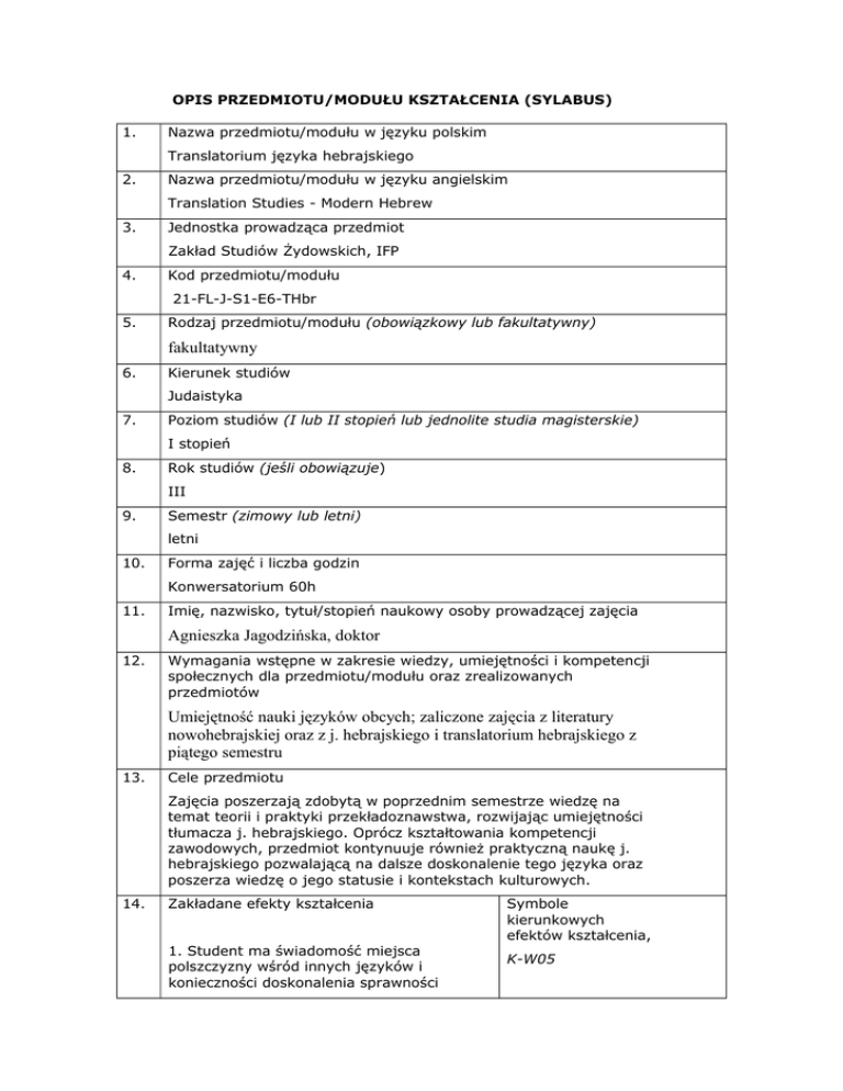OPIS PRZEDMIOTU/MODUŁU KSZTAŁCENIA (SYLABUS) 1. Nazwa przedmiotu/modułu w języku polskim Translatorium języka hebrajskiego 2. Nazwa przedmiotu/modułu w języku angielskim Translation Studies - Modern Hebrew 3. Jednostka prowadząca przedmiot Zakład Studiów Żydowskich, IFP 4. Kod przedmiotu/modułu 21-FL-J-S1-E6-THbr 5. Rodzaj przedmiotu/modułu (obowiązkowy lub fakultatywny) fakultatywny 6. Kierunek studiów Judaistyka 7. Poziom studiów (I lub II stopień lub jednolite studia magisterskie) I stopień 8. Rok studiów (jeśli obowiązuje) III 9. Semestr (zimowy lub letni) letni 10. Forma zajęć i liczba godzin Konwersatorium 60h 11. Imię, nazwisko, tytuł/stopień naukowy osoby prowadzącej zajęcia Agnieszka Jagodzińska, doktor 12. Wymagania wstępne w zakresie wiedzy, umiejętności i kompetencji społecznych dla przedmiotu/modułu oraz zrealizowanych przedmiotów Umiejętność nauki języków obcych; zaliczone zajęcia z literatury nowohebrajskiej oraz z j. hebrajskiego i translatorium hebrajskiego z piątego semestru 13. Cele przedmiotu Zajęcia poszerzają zdobytą w poprzednim semestrze wiedzę na temat teorii i praktyki przekładoznawstwa, rozwijając umiejętności tłumacza j. hebrajskiego. Oprócz kształtowania kompetencji zawodowych, przedmiot kontynuuje również praktyczną naukę j. hebrajskiego pozwalającą na dalsze doskonalenie tego języka oraz poszerza wiedzę o jego statusie i kontekstach kulturowych. 14. Zakładane efekty kształcenia 1. Student ma świadomość miejsca polszczyzny wśród innych języków i konieczności doskonalenia sprawności Symbole kierunkowych efektów kształcenia, K-W05 językowej w języku polskim. 2. Student ma uporządkowaną wiedzę o systemach fonologicznym, gramatycznym i leksykalnym współczesnego języka hebrajskiego, a także o ich historycznej zmienności. Potrafi dokonać podstawowego zestawienia struktur i zjawisk języka polskiego oraz hebrajskiego, a także ma podstawową wiedzę o przechodzeniu od struktur jednego języka do struktur drugiego. 3. Student potrafi wyszukiwać, selekcjonować, analizować, oceniać i użytkować wiedzę z zakresu literaturoznawstwa, językoznawstwa i kulturoznawstwa z wykorzystaniem różnych źródeł i metod. 4. Student potrafi posługiwać się podstawowymi narzędziami badawczymi wypracowanymi na gruncie odpowiedniej filologii szczegółowej (tu: języka hebrajskiego) i pojęciami dla niej właściwymi. 15. K-W08 K-U01 K-U04 5. Student potrafi identyfikować różne rodzaje wytworów kultury będące przedmiotem badań literaturoznawstwa, językoznawstwa i kulturoznawstwa. K-U11 6. Student rozumie potrzebę uczenia się przez całe życie, zwłaszcza w zakresie rozwijania umiejętności językowych (w tym przypadku – współczesnego języka hebrajskiego). K-K01 7. Student umie odpowiednio określić priorytety służące realizacji zadań; potrafi gospodarować czasem i realizować określone zadania w wyznaczonych terminach. K-K03 Treści programowe Wybrane zagadnienia z dziedziny przekładoznawstwa Przekłady literatury nowohebrajskiej na polski i polskiej na język hebrajski (proza i poezja) Warsztat tłumacza Kontekst kulturowy przekładu Przekład na przykładzie – analiza wybranych przekładów na j. hebrajski i z hebrajskiego na j. polski Praktyka przekładu – ćwiczenia translatorskie kształcące sprawności tłumaczenia różnych typów tekstów (pisanych i mówionych) z hebrajskiego i na hebrajski 16. Zalecana literatura (podręczniki) I. Literatura dotycząca teorii i praktyki przekładu - przykładowe pozycje: E. Balcerzan, Tłumaczenie jako „wojna światów”. W kręgu translatologii i komparatystyki, Poznań 2010. S. Barańczak, Ocalone w tłumaczeniu. Szkice o warsztacie tłumacza poezji..., Poznań 1992. B. Kielar, Zarys translatoryki, Warszawa 2013. K. Lipiński, Vademecum tłumacza, Kraków 2003. Wybrane pozycje z serii: Przekład – mity i rzeczywistość (Wydawnictwo Naukowe PWN) oraz Język a komunikacja (Krakowskie Towarzystwo Popularyzowania Wiedzy o Komunikacji Językowej „TERTIUM”) II. Przekłady literatury nowohebrajskiej – konteksty: S. Avneri, „Pocałunek przez chusteczkę” – poeta jako tłumacz, [w:] Literackie spotkania w międzywojennej Polsce. Chaim Nachman Bialik i Salomon Dykman, red. M. Zawanowska, R. Gromadzka, Kraków-Budapeszt 2012, s. 199-214. T. Korzeniowski, Posłowie, [w:] A. Oz, To samo morze, Warszawa 2002, s. 239-241. T. Korzeniowski, Od Tłumacza, [w:] J. Amichaj, Koniec sezonu pomarańczy, Izabelin 2000, s. 138-140. G. Taub, Dwa rodzaje odchudzonego języka, „Literatura na świecie”, nr 11-12/2004, s. 188-209. III. Wybór materiałów – praktyka translatorska Zestaw różnorodnych materiałów przygotowany przez prowadzącego, m.in. fragmenty literatury pięknej, piosenka, film, komiks, prasa, teksty naukowe, użytkowe, specjalistyczne. IV. Materiały pomocnicze: podręczniki do nauki j. hebrajskiego, tabele gramatyczne, słowniki j. polskiego i hebrajskiego, leksykony, encyklopedie 17. Forma zaliczenia poszczególnych komponentów przedmiotu/modułu, sposób sprawdzenia osiągnięcia zamierzonych efektów kształcenia: Warunki zaliczenia translatorium - lektura zadanych tekstów - zaliczenie wszystkich zadanych prac - zaliczenie wszystkich sprawdzianów - frekwencja i aktywność na zajęciach 18. Język wykładowy polski, hebrajski 19. Obciążenie pracą studenta Forma aktywności studenta Średnia liczba godzin na zrealizowanie aktywności Godziny zajęć (wg planu studiów) z nauczycielem: - translatorium 60h Praca własna studenta np.: - przygotowanie do zajęć - czytanie wskazanej literatury - ćwiczenia praktyczne z przekładu 60h Suma godzin 120h Liczba punktów ECTS 4