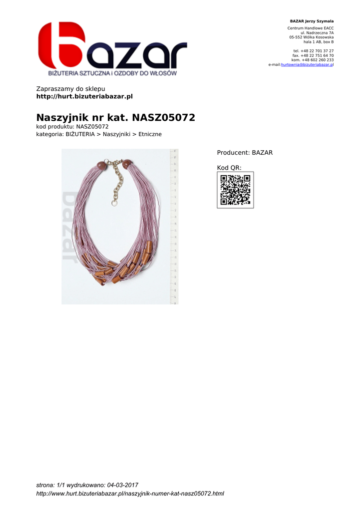 BAZAR Jerzy Szymala Centrum Handlowe EACC ul. Nadrzeczna 7A 05-552 Wólka Kosowska hala 1 AB, box B tel. +48 22 701 37 27 fax. +48 22 751 64 70 kom. +48 602 260 233 e-mail:[email protected] Zapraszamy do sklepu http://hurt.bizuteriabazar.pl Naszyjnik nr kat. NASZ05072 kod produktu: NASZ05072 kategoria: BIŻUTERIA > Naszyjniki > Etniczne Producent: BAZAR Kod QR: strona: 1/1 wydrukowano: 04-03-2017 http://www.hurt.bizuteriabazar.pl/naszyjnik-numer-kat-nasz05072.html