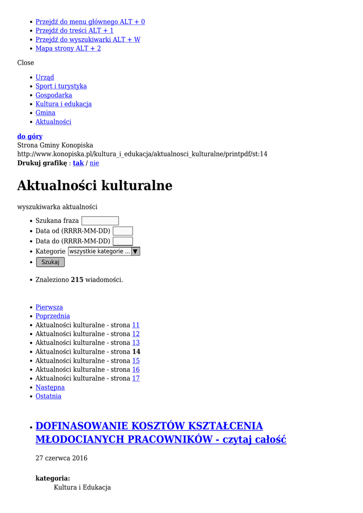 Przejdź do menu głównego ALT + 0 Przejdź do treści ALT + 1 Przejdź do wyszukiwarki ALT + W Mapa strony ALT + 2 Close Urząd Sport i turystyka Gospodarka Kultura i edukacja Gmina Aktualności do góry Strona Gminy Konopiska http://www.konopiska.pl/kultura_i_edukacja/aktualnosci_kulturalne/printpdf/st:14 Drukuj grafikę : tak / nie Aktualności kulturalne wyszukiwarka aktualności Szukana fraza Data od (RRRR-MM-DD) Data do (RRRR-MM-DD) Kategorie wszystkie kategorie ... ▼ Szukaj Znaleziono 215 wiadomości. Pierwsza Poprzednia Aktualności kulturalne - strona 11 Aktualności kulturalne - strona 12 Aktualności kulturalne - strona 13 Aktualności kulturalne - strona 14 Aktualności kulturalne - strona 15 Aktualności kulturalne - strona 16 Aktualności kulturalne - strona 17 Następna Ostatnia DOFINASOWANIE KOSZTÓW KSZTAŁCENIA MŁODOCIANYCH PRACOWNIKÓW - czytaj całość 27 czerwca 2016 kategoria: Kultura i Edukacja Pracodawcy, którzy zawarli umowę o pracę z młodocianymi pracownikami w celu przygotowania zawodowego, po zakończeniu nauki zawodu lub przyuczeniu do wykonywania określonej pracy i zdaniu przez młodocianego egzaminu, mogą otrzymać pomoc w formie dofinansowania kosztów kształcenia młodocianych pracowników. DOFINASOWANIE KOSZTÓW KSZTAŁCENIA MŁODOCIANYCH DOFINASOWANIE KOSZTÓW KSZTAŁCENIA MŁODOCIANYCH PRACOWNIKÓW - czytaj całość Pomoc zdrowotna dla nauczycieli - czytaj całość 27 czerwca 2016 kategoria: Kultura i Edukacja Uwaga! Zmiana do uchwały w sprawie pomocy zdrowotnej dla nauczycieli Pomoc zdrowotna dla nauczycieli Pomoc zdrowotna dla nauczycieli - czytaj całość GRATULACJE DLA GIMNAZJALISTÓW I UCZNIÓW SZKÓŁ PODSTAWOWYCH - czytaj całość 24 czerwca 2016 kategoria: Kultura i Edukacja Egzamin gimnazjalny w Gminie Konopiska pisało 83 uczniów od 18 do 20 kwietnia. GRATULACJE DLA GIMNAZJALISTÓW I UCZNIÓW SZKÓŁ GRATULACJE DLA GIMNAZJALISTÓW I UCZNIÓW SZKÓŁ PODSTAWOWYCH - czytaj całość XVI EDYCJA KRAJOWEGO KONKURSU: „NASZE KULINARNE DZIEDZICTWO – SMAKI REGIONÓW” - czytaj całość 23 czerwca 2016 kategoria: Kultura i Edukacja 18.06.2016 r. Koło Gospodyń Wiejskich w Wygodzie po raz pierwszy wzięło udział w XVI EDYCJI KRAJOWEGO KONKURSU: „NASZE KULINARNE DZIEDZICTWO – SMAKI REGIONÓW” zorganizowanym w Częstochowie na Placu Biegańskiego. W konkursie uczestniczyło 52 wystawców produktów i potraw z województwa śląskiego. XVI EDYCJA KRAJOWEGO KONKURSU: „NASZE KULINARNE XVI EDYCJA KRAJOWEGO KONKURSU: „NASZE KULINARNE DZIEDZICTWO – SMAKI REGIONÓW” - czytaj całość Piknik rodzinny w Kopalni - czytaj całość 23 czerwca 2016 kategoria: Kultura i Edukacja 18 czerwca 2016 r. przy Zespole Szkolno – Przedszkolnym im. Jana Pawła II w Kopalni odbył się piknik zorganizowany przez Radę Rodziców i Grono Pedagogiczne. Piknik rodzinny w Kopalni Piknik rodzinny w Kopalni - czytaj całość Bezpieczne wakacje - apel - czytaj całość 23 czerwca 2016 kategoria: Kultura i Edukacja Apel Pana Jacka Dubińskiego - Prezesa Kasy Rolniczego Ubezpieczenia Społecznego o zapewnienie dzieciom bezpiecznych wakacji Bezpieczne wakacje - apel Bezpieczne wakacje - apel - czytaj całość Święto Młodości w Aleksandrii na ludowo - czytaj całość 18 czerwca 2016 kategoria: Kultura i Edukacja Coroczna impreza, która odbywa się przy naszej szkole to prawdziwe święto, które integruje naszą lokalną społeczność. Bogaty program festynu, liczne atrakcje i niespodzianki a także olbrzymie zaangażowanie uczniów, nauczycieli, rodziców, lokalnych organizacji, mieszkańców oraz sponsorów zapewniają świetną zabawę, nie tylko dzieciom. Święto Młodości w Aleksandrii na ludowo Święto Młodości w Aleksandrii na ludowo - czytaj całość WOLNE MIEJSCA W PRZEDSZKOLACH PUBLICZNYCH czytaj całość 18 czerwca 2016 kategoria: Kultura i Edukacja Informujemy wszystkich zainteresowanych rodziców i opiekunów dzieci w wieku przedszkolnym, że dysponujemy wolnymi miejscami w przedszkolach publicznych w Gminie Konopiska. WOLNE MIEJSCA W PRZEDSZKOLACH PUBLICZNYCH WOLNE MIEJSCA W PRZEDSZKOLACH PUBLICZNYCH - czytaj całość Śląskie Centrum Społeczeństwa Informacyjnego - czytaj całość 17 czerwca 2016 kategoria: Kultura i Edukacja Śląskie Centrum Społeczeństwa Informacyjnego kolejny raz rusza z cyklem bezpłatnych warsztatów nt. wykorzystania nowoczesnych technologii w życiu codziennym i zawodowym. Warsztaty skierowane są do wszystkich mieszkańców województwa śląskiego. Warsztaty są bezpłatne. Śląskie Centrum Społeczeństwa Informacyjnego Śląskie Centrum Społeczeństwa Informacyjnego - czytaj całość DYŻURY PRZEDSZKOLI W GMINIE KONOPISKA PODCZAS WAKACJI w 2016 ROKU - czytaj całość 16 czerwca 2016 kategoria: Kultura i Edukacja Harmonogram dyżurów przedszkoli publicznych w okresie wakacyjnym od 27 czerwca do 31 sierpnia 2016 r. DYŻURY PRZEDSZKOLI W GMINIE KONOPISKA PODCZAS WAK DYŻURY PRZEDSZKOLI W GMINIE KONOPISKA PODCZAS WAKACJI w 2016 ROKU - czytaj całość Pierwsza Poprzednia Aktualności kulturalne - strona 11 Aktualności kulturalne - strona 12 Aktualności kulturalne - strona 13 Aktualności kulturalne - strona 14 Aktualności kulturalne - strona 15 Aktualności kulturalne - strona 16 Aktualności kulturalne - strona 17 Następna Ostatnia