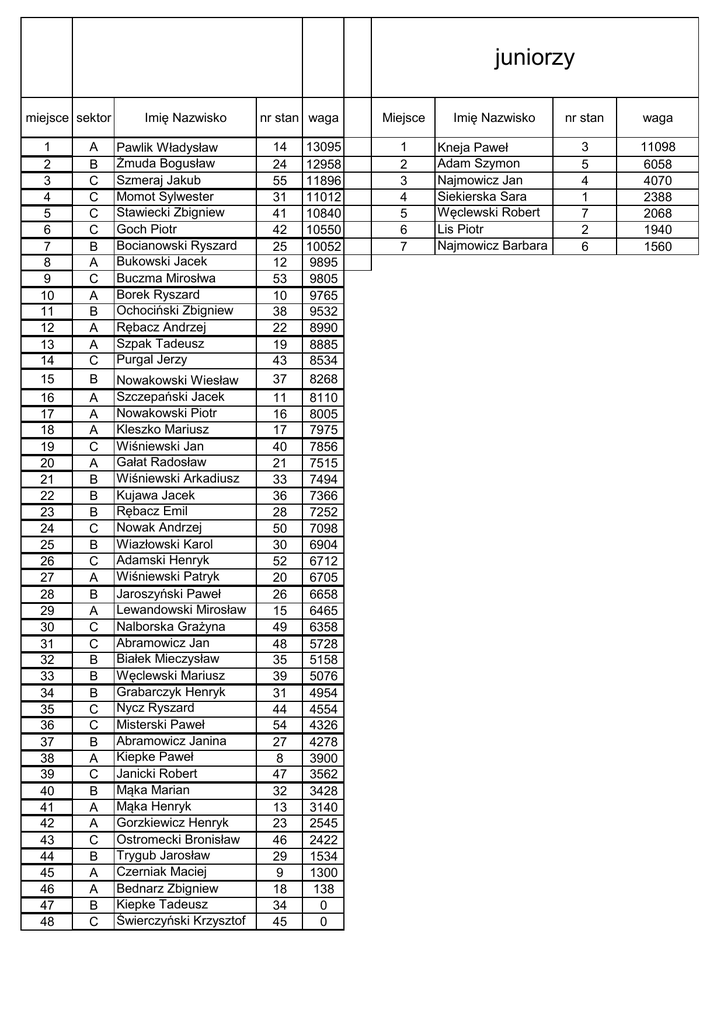 juniorzy miejsce sektor 1 2 3 4 5 6 7 8 9 10 11 12 13 14 15 16 17 18 19 20 21 22 23 24 25 26 27 28 29 30 31 32 33 34 35 36 37 38 39 40 41 42 43 44 45 46 47 48 A B C C C C B A C A B A A C B A A A C A B B B C B C A B A C C B B B C C B A C B A A C B A A B C Imię Nazwisko Pawlik Władysław Żmuda Bogusław Szmeraj Jakub Momot Sylwester Stawiecki Zbigniew Goch Piotr Bocianowski Ryszard Bukowski Jacek Buczma Mirosłwa Borek Ryszard Ochociński Zbigniew Rębacz Andrzej Szpak Tadeusz Purgal Jerzy Nowakowski Wiesław Szczepański Jacek Nowakowski Piotr Kleszko Mariusz Wiśniewski Jan Gałat Radosław Wiśniewski Arkadiusz Kujawa Jacek Rębacz Emil Nowak Andrzej Wiazłowski Karol Adamski Henryk Wiśniewski Patryk Jaroszyński Paweł Lewandowski Mirosław Nalborska Grażyna Abramowicz Jan Białek Mieczysław Węclewski Mariusz Grabarczyk Henryk Nycz Ryszard Misterski Paweł Abramowicz Janina Kiepke Paweł Janicki Robert Mąka Marian Mąka Henryk Gorzkiewicz Henryk Ostromecki Bronisław Trygub Jarosław Czerniak Maciej Bednarz Zbigniew Kiepke Tadeusz Świerczyński Krzysztof nr stan waga 14 24 55 31 41 42 25 12 53 10 38 22 19 43 37 11 16 17 40 21 33 36 28 50 30 52 20 26 15 49 48 35 39 31 44 54 27 8 47 32 13 23 46 29 9 18 34 45 13095 12958 11896 11012 10840 10550 10052 9895 9805 9765 9532 8990 8885 8534 8268 8110 8005 7975 7856 7515 7494 7366 7252 7098 6904 6712 6705 6658 6465 6358 5728 5158 5076 4954 4554 4326 4278 3900 3562 3428 3140 2545 2422 1534 1300 138 0 0 Miejsce Imię Nazwisko nr stan waga 1 2 3 4 5 6 7 Kneja Paweł Adam Szymon Najmowicz Jan Siekierska Sara Węclewski Robert Lis Piotr Najmowicz Barbara 3 5 4 1 7 2 6 11098 6058 4070 2388 2068 1940 1560