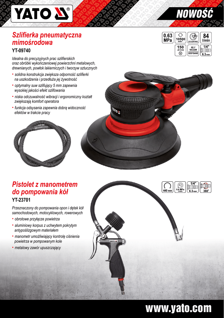 NOWOŚĆ Szlifierka pneumatyczna mimośrodowa YT-09740 Idealna do precyzyjnych prac szlifierskich oraz obróbki wykończeniowej powierzchni metalowych, drewnianych, powłok lakierniczych i tworzyw sztucznych • solidna konstrukcja zwiększa odporność szlifierki na uszkodzenia i przedłuża jej żywotność • optymalny suw szlifujący 5 mm zapewnia wysokiej jakości efekt szlifowania • niska odczuwalność wibracji i ergonomiczny kształt zwiększają komfort operatora • funkcja odsysania zapewnia dobrą widoczność efektów w trakcie pracy Pistolet z manometrem do pompowania kół YT-23701 Przeznaczony do pompowania opon i dętek kół samochodowych, motocyklowych, rowerowych • obrotowe przyłącze powietrza • aluminiowy korpus z uchwytem pokrytym antypoślizgowym materiałem • manometr umożliwiający kontrolę ciśnienia powietrza w pompowanym kole • metalowy zawór upuszczający www.yato.com