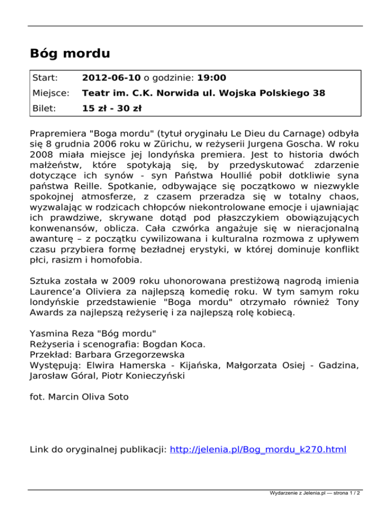 Bóg mordu Start: 2012-06-10 o godzinie: 19:00 Miejsce: Teatr im. C.K. Norwida ul. Wojska Polskiego 38 Bilet: 15 zł - 30 zł Prapremiera "Boga mordu" (tytuł oryginału Le Dieu du Carnage) odbyła się 8 grudnia 2006 roku w Zürichu, w reżyserii Jurgena Goscha. W roku 2008 miała miejsce jej londyńska premiera. Jest to historia dwóch małżeństw, które spotykają się, by przedyskutować zdarzenie dotyczące ich synów - syn Państwa Houllié pobił dotkliwie syna państwa Reille. Spotkanie, odbywające się początkowo w niezwykle spokojnej atmosferze, z czasem przeradza się w totalny chaos, wyzwalając w rodzicach chłopców niekontrolowane emocje i ujawniając ich prawdziwe, skrywane dotąd pod płaszczykiem obowiązujących konwenansów, oblicza. Cała czwórka angażuje się w nieracjonalną awanturę – z początku cywilizowana i kulturalna rozmowa z upływem czasu przybiera formę bezładnej erystyki, w której dominuje konflikt płci, rasizm i homofobia. Sztuka została w 2009 roku uhonorowana prestiżową nagrodą imienia Laurence’a Oliviera za najlepszą komedię roku. W tym samym roku londyńskie przedstawienie "Boga mordu" otrzymało również Tony Awards za najlepszą reżyserię i za najlepszą rolę kobiecą. Yasmina Reza "Bóg mordu" Reżyseria i scenografia: Bogdan Koca. Przekład: Barbara Grzegorzewska Występują: Elwira Hamerska - Kijańska, Małgorzata Osiej - Gadzina, Jarosław Góral, Piotr Konieczyński fot. Marcin Oliva Soto Link do oryginalnej publikacji: http://jelenia.pl/Bog_mordu_k270.html Wydarzenie z Jelenia.pl — strona 1 / 2 Wygenerowano: 11/08/2013 14:45:13 © Jelenia.pl Wydarzenie z Jelenia.pl — strona 2 / 2 Powered by TCPDF (www.tcpdf.org)