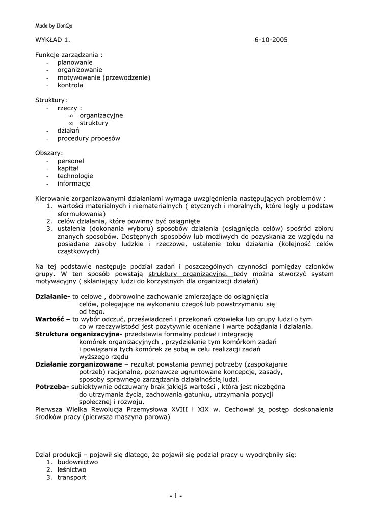 Made by IlonQa WYKŁAD 1. 6-10-2005 Funkcje zarządzania : - planowanie - organizowanie - motywowanie (przewodzenie) - kontrola Struktury: - rzeczy : • organizacyjne • struktury - działań - procedury procesów Obszary: - personel - kapitał - technologie - informacje Kierowanie zorganizowanymi działaniami wymaga uwzględnienia następujących problemów : 1. wartości materialnych i niematerialnych ( etycznych i moralnych, które legły u podstaw sformułowania) 2. celów działania, które powinny być osiągnięte 3. ustalenia (dokonania wyboru) sposobów działania (osiągnięcia celów) spośród zbioru znanych sposobów. Dostępnych sposobów lub możliwych do pozyskania ze względu na posiadane zasoby ludzkie i rzeczowe, ustalenie toku działania (kolejność celów cząstkowych) Na tej podstawie następuje podział zadań i poszczególnych czynności pomiędzy członków grupy. W ten sposób powstają struktury organizacyjne. tedy można stworzyć system motywacyjny ( skłaniający ludzi do korzystnych dla organizacji działań) Działanie- to celowe , dobrowolne zachowanie zmierzające do osiągnięcia celów, polegające na wykonaniu czegoś lub powstrzymaniu się od tego. Wartość – to wybór odczuć, przeświadczeń i przekonań człowieka lub grupy ludzi o tym co w rzeczywistości jest pozytywnie oceniane i warte pożądania i działania. Struktura organizacyjna- przedstawia formalny podział i integrację komórek organizacyjnych , przydzielenie tym komórkom zadań i powiązania tych komórek ze sobą w celu realizacji zadań wyższego rzędu Działanie zorganizowane – rezultat powstania pewnej potrzeby (zaspokajanie potrzeb) racjonalne, poznawcze ugruntowane koncepcje, zasady, sposoby sprawnego zarządzania działalnością ludzi. Potrzeba- subiektywnie odczuwany brak jakiejś wartości , która jest niezbędna do utrzymania życia, zachowania gatunku, utrzymania pozycji społecznej i rozwoju. Pierwsza Wielka Rewolucja Przemysłowa XVIII i XIX w. Cechował ją postęp doskonalenia środków pracy (pierwsza maszyna parowa) Dział produkcji – pojawił się dlatego, że pojawił się podział pracy u wyodrębniły się: 1. budownictwo 2. leśnictwo 3. transport -1- Made by IlonQa 4. handel 5. łączność w skali przedsiębiorstwa ten podział pracy przejawiał się pojawieniem się faz produkcji. Fazy działalności produkcyjnej, jej główne części składowe: - przygotowanie produkcji konstrukcyjne i technologiczne - realizacji produkcji ( wytworzenie , kontrola, sterowanie) - zbytu (marketing, sprzedaż, serwis) operacje produkcyjne – to zespoły działań mające na celu realizację cząstkowych zadań produkcyjnych wykonywane przez jednego pracownika lub grupę na jednym przedmiocie pracy lub kilku podobnych , bez przerwy na inne prace Pojawienie się procesu specjalizacji i standaryzacji produkcji. Specjalizacja produkcji (technologiczna) – to dobór konkretnego sposobu wytworzenia produktu lub usługi dokonany dla całego przedsiębiorstwa lub jego części Standaryzacja działań – to określenie stopnia typowości działań mających na celu ujednolicenie sposobu ich realizacji Obecnie wyodrębniły się trzy fazy: przedprodukcyjna (organizacja zasileń przychodzących do przedsiębiorstwa) produkcyjna proces produkcji <stricte> poprodukcyjna sprzedaż, zbyt, kontakt z klientem (marketing) Funkcje : - zarządcza - produkcji (wytwarzanie produktu lub usługi) 1. 2. 3. 4. pozyskiwanie informacji przekazanie informacji kanałami informacji przetwarzanie informacji w decyzje porównanie osiągniętych wyników z pewnymi wzorcami Powstanie zapotrzebowania na wiedzę o zarządzaniu ( o koncepcjach, zasadach, regułach zarządzania) -2- Made by IlonQa Potrzeby społeczne (ludzkie) Doskonalenie techniki wytwarzania zwłaszcza narzędzi pracy Rozwój podziału pracy, standaryzacji, specjalizacji produkcji Konieczność synchronizacji, koordynacji i interpretacji działań Powstanie zarządzania jako formy praktyki społecznej Wzrost skali i koncentracji produkcji, doskonalenie wyrobów Zapotrzebowa nie na wiedzę o organizacji i zarządzaniu Uwarunkowania : Powstanie nauki o organizacji i zarządzaniu Główne Dodatkowe Sprzężenie zwrotne Sfera Regulacyjna f. zarządcza (procesy informacyjno- decyzyjne) Sfera Realna (procesy materialno–energetyczne) f. wytworzenia (realizacji) Kierowanie- jest oddziaływaniem informacyjno- decyzyjnym aparatu zarządzającego przekazywanym kanałami informacyjnymi ukształtowanymi przez stosunki organizacyjne na komórki organizacji sfery realnej, powodującym, że komórki te poprzez odpowiednie oddziaływania materialno-energetyczne zmierzają do osiągnięcia celów organizacji komentarz : 1.kierowanie oddziaływaniem obiektu kierującego na obiekt kierowany -3- Made by IlonQa 2.obiektem kierującym jest aparat zarządzający 3. wpływa on na obiekt kierowany , to jest na sferę realną poprzez stosunki organizacyjne , które można tak kwalifikować : - zwierzchności i podporządkowania - współdziałania - uporządkowania ( uprawnienia, obowiązki, odpowiedzialność) - należnie (każda komórka organizacyjna należy do jednej lub kilku większych całości) 4. stosunki organizacyjne są „rozpięte” na tzw. rzeczowych składnikach organizacji i w ten sposób powstaje struktura organizacji Zarządzanie – to taki rodzaj kierowania, w którym tytuł do wywierania wpływu na hierarchię systemy wartości, interesy, dążenia i postawy, organizacyjne zachowania kierowanych wynikają w głównej mierze z faktu dysponowania przez kierującego zasobami komentarz : 1.Podstawą kierowania jest władza; polega na tym, że daje ona tytuł kierującemu do wywierania wpływu na podwładnych 2.Źródła władzy: - kompetencje formalne, materialne lub intelektualne a) kompetencje formalne – stanowią podstawę administrowania , zarządzania i dowodzenia ( przepisy, prawa, także prawa organizacji) b) kompetencje mater
