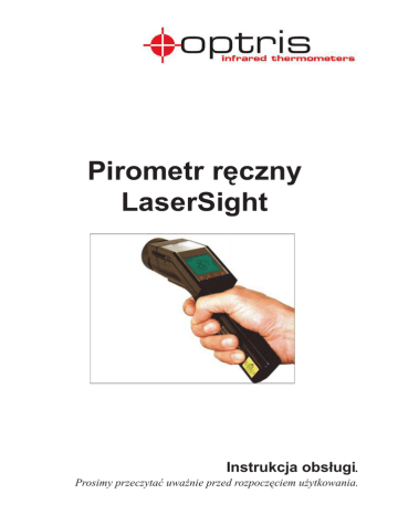 Pirometr rêczny LaserSight Instrukcja obs³ugi. Prosimy przeczytaæ uwa¿nie przed rozpoczêciem u¿ytkowania. Kompatybilnoœæ CE Niniejszy produkt jest zgodny z nastêpuj¹cymi normami: EMC: Bezpieczeñstwo: EN 61326-1 EN 61010-1:1993/ A2:1995 Produkt spe³nia wymagania Dyrektywy EMC 89/336/EEC oraz niskonapiêciowej 73/23/EEC. Zakres dostawy • • • • • • • • Pirometr LaserSight 2 baterie (typ AA) Sonda penetracyjna Kabel USB Oprogramowanie Miêkkie etui Twarda walizeczka Instrukcja obs³ugi Na przyrz¹dzie znajduje siê numer fabryczny. Nale¿y go zawsze podawaæ przy kontakcie z biurem obs³ugi klienta w sprawach napraw, konserwacji, obs³ugi zamawiania dodatkowego wyposa¿enia. Dziêkujemy za zakup pirometru przenoœnego optris LaserSight. Komentarz dotycz¹cy niniejszej instrukcji. Przed ropoczêciem u¿ytkowania przyrz¹du nale¿y starannie przeczytaæ instrukcjê. Producent zastrzega sobie prawo do zmiany opisanej tutaj specyfikacji w razie technicznego rozwoju produktu. Gwarancja Ka¿dy przyrz¹d podlega procesowi kontroli jakoœci. Jednak¿e jeœli wyst¹pi uszkodzenie, proszê siê jak najszybciej skontaktowaæ z dostawc¹. Okres gwarancji obejmuje 24 miesi¹ce od daty dostawy. Po up³ywie okresu gwarancyjnego producent gwarantuje dodatkowe 6 miesiêcy na wszystkie wymienione elementy lub podzespo³y. Gwarancja nie dotyczy bezpieczników elektrycznych, bateriioraz uszkodzeñ wynik³ych z nieprawid³owego u¿ytkowania. Gwarancja traci wa¿noœæ tak¿e w przypadku otwarcia obudowy przyrz¹du. Producent udziela 3 miesiêcznej gwarancji na akumulatory. Producent nie jest odpowiedzialny za uszkodzenia bêd¹ce konsekwencj¹ innych zdarzeñ. Jeœli uszkodzenia powstan¹ w czasie okresu gwarancyjnego produkt zostanie wymieniony, skalibrowany lub naprawiony bezp³atnie. Koszty transportu ponosi nadawca. Producent zastrzega sobie prawo do wymiany podzespo³ów zamiast ich naprawy. Jeœli uszkodzenia s¹ wynikiem nieprawid³owej eksploatacji, u¿ytkownik zostanie obi¹¿ony kosztami naprawy. W tym wypadku istnieje mo¿liwoœæ uzyskania kosztów przed dokonaniem naprawy. 2 TEST-THERM Sp. z o.o., ul. Friedleina 4-6, 30-009 Kraków Spis treœci 1. Operacje podstawowe ................................................................................................ 5 1.1. Baterie ..................................................................................................................... 5 1.2. Interfejs u¿ytkownika ............................................................................................. 5 1.3. Wyœwietlacz ........................................................................................................... 6 2. Pomiary ......................................................................................................................... 6 2.1. Trzymanie przyrz¹du ............................................................................................. 6 2.1. Funkcje pomiarowe ................................................................................................. 7 2.3. Podœwietlenie wyœwietlacza ................................................................................. 8 2.4. Celownik laserowy ................................................................................................. 8 2.5. Optyka ..................................................................................................................... 9 2.5.1. Optyka standardowa ........................................................................................... 9 2.5.2. Optyka bliskiego widzenia ................................................................................. 10 2.6. Menu konfiguracji 1 ............................................................................................... 10 2.6.1. Ustawianie emisyjnoœci ...................................................................................... 11 2.6.2. Alarm górny ........................................................................................................ 11 2.6.3. Alarm dolny ......................................................................................................... 11 2.6.4. Pomiary d³ugotrwa³e (Lock) ............................................................................... 12 2.7. Menu konfiguracji 2 ............................................................................................... 13 2.7.1. Jednostka temperatury ....................................................................................... 13 2.7.2. Brzêczyk (Buzzer) ............................................................................................. 13 2.7.3. Obrót wyœwietlacza (Flip) ................................................................................. 14 2.7.4. Kompensacja temperatury otoczenia (Ambient Temperature Compensation) . 14 2.7.5. Reset ................................................................................................................... 15 3. Rejestrator (Data Logger) .......................................................................................... 16 3.1. Zapisywanie danych do pamiêci ......................................................................... 16 3.1.1. Nazwy materia³ów i lokalizacji ........................................................................... 16 3.2. Odczyt danych z pamiêci ..................................................................................... 17 4. Czujnik temperatury ................................................................................................... 18 5. Oprogramowanie OptrisConnect ............................................................................... 18 5.1. Instalacja i uruchomienie ............................................................................................ 18 5.2. Pod³¹czenie do komputera .................................................................................... 19 5.3. Funkcje rejestra