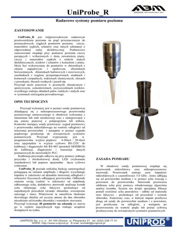 UniProbe_R Radarowe systemy pomiaru poziomu ZASTOSOWANIE UniProbe_R jest trójprzewodowym radarowym przetwornikiem poziomu na prąd przeznaczonym do przemysłowych, ciągłych pomiarów poziomu cieczy, materiałów sypkich, szlamów oraz innych substancji o odpowiedniej stałej dielektrycznej. Podstawowe zastosowanie znajduje przy pomiarze poziomu cieczy parujących i wzburzonych z dużą zawartością piany, cieczy i materiałów sypkich o niskich stałych dielektrycznych, ścieków i szlamów z kożuchem z piany. Może być wykorzystany do pomiarów w zbiornikach z olejem napędowym i opałowym, zbiornikach browarnianych, zbiornikach buforowych i rezerwowych, zasobnikach z węglem, przepompowniach, studniach i komorach czerpalnych, reaktorach chemicznych, silosach z proszkami, śluzach wodnych i jazach itp. Przyrząd może pracować w przemyśle chemicznym i spożywczym, cementowniach, oczyszczalniach ścieków, Wymiary wszelkiego rodzaju składach paliw ciekłych i stałych oraz w systemach ostrzegania powodziowego. Obudowa przetwornika OPIS TECHNICZNY Przyrząd wykonany jest w postaci sondy pomiarowej składającej się z mikroprocesorowego przetwornika pomiarowego umieszczonego w obudowie wykonanej z aluminium lub stali nierdzewnej oraz z zintegrowanej z nią anteny prętowej z polipropylenu lub teflonu. Kontroler sterujący sondy przetwarza sygnał pomiarowy z przetwornika mikrofalowego na wartość odległości od mierzonej powierzchni i następnie w postaci sygnału prądowego przekazuje do zewnętrznych systemów pomiarowych. Przyrząd wyposażony jest w programowalne wyjście prądowe 4-20mA / 20-4mA oraz opcjonalnie w wyjście cyfrowe RS-232C do kalibracji i diagnostyki lub RS-485 (protokół MODBUS) do kalibracji, diagnostyki i transmisji danych pomiarowych do sterowników PLC. Kalibracja przyrządu odbywa się przy pomocy jednego przycisku i dwukolorowej diody LED (wykonanie standardowe) lub poprzez opcjonalne łącze cyfrowe (zalecana). UniProbe_R posiada unikalną funkcję samoregulacji polegającą na zmianie amplitudy i długości wysyłanego impulsu w zależności od aktualnie mierzonej odległości i własności fizycznych odbijającej powierzchni. Odbiornik zmienia swoją czułość w zależności od amplitudy odbieranego echa, dodatkowo sterownik analizuje kształt echa eliminując echa fałszywe pochodzące od napotkanych przeszkód (ścianki zbiornika, wewnętrzne rurociągi i inne). Właściwość ta umożliwia śledzenie dowolnego obiektu od szczytu anteny do dna zbiornika niezależnie od kształtu zbiornika i warunków otoczenia. Przyrząd wykonuje 40 pomiarów na sekundę co stawia go w rzędzie najszybszych tego rodzaju urządzeń dostępnych na rynku. . ZASADA POMIARU W obudowie sondy pomiarowej znajduje się przetwornik mikrofalowy oraz mikroprocesorowy sterownik. Przetwornik emituje serie impulsów mikrofalowych o częstotliwości 5.8 GHz , które odbijają się od powierzchni medium i w postaci echa wracają z powrotem do przetwornika. Sterownik przetwarza odebrane echo przy pomocy wbudowanego algorytmu analizy kształtu. System ten dzięki specjalnej filtracji potrafi rozróżnić echa prawdziwe - odbite od materiału oraz fałszywe - pochodzące od przeszkód i ścianek zbiornika. Zmierzony czas, w którym impuls przebywa drogę od sondy do powierzchni medium i z powrotem, jest przeliczany na odległość, a następnie po przetworzeniu na wartość prądu lub postać cyfrową przekazywany do zewnętrznych systemów pomiarowych. Wymiary Dostępne modele Oznaczenie Zakres pomiarowy dla cieczy Rozdzielczość UPR300 - 033R * - 10 m 3.5 mm UPR300 - 050R * - 15 m 5.7 mm UPR300 - 100R * - 30 m 11 mm * - dolny koniec anteny Parametry techniczne Typ przetwornika PULSE - radar impulsowy Zakres pomiarowy dla cieczy - zgodnie z tabelą dla materiałów sypkich - ½ zakresu dla cieczy Dokładność pomiaru 0.10 % zakresu (w warunkach referencyjnych z wyjściem prądowym) 0.25 % zakresu (w warunkach polowych) Rozdzielczość zgodnie z tabelą Częstotliwość nadajnika 5.8 GHz Moc nadajnika 50 µW (średnia) Częstotliwość pomiaru do 40/sec. Temperatura otoczenia -40 ¸ +60 °C Temperatura procesowa -40 ¸ +90 °C (z anteną PP) -40 ¸ +177 °C (z anteną PTFE) Max. ciśnienie procesowe 5 bar Wyjścia analogowe prądowe 4-20mA lub 20-4mA, rozdzielczość – 6.1 µA max. obciążenie Robc= (Uzas-6)/24mA Interfejs sieciowy RS-232C (opcja) - kalibracja i diagnostyka RS-485 z protokołem MODBUS RTU (opcja) kalibracja, diagnostyka i transmisja danych Zasilanie 18 - 30V= / 0.07A Klasa ochrony obudowy IP65