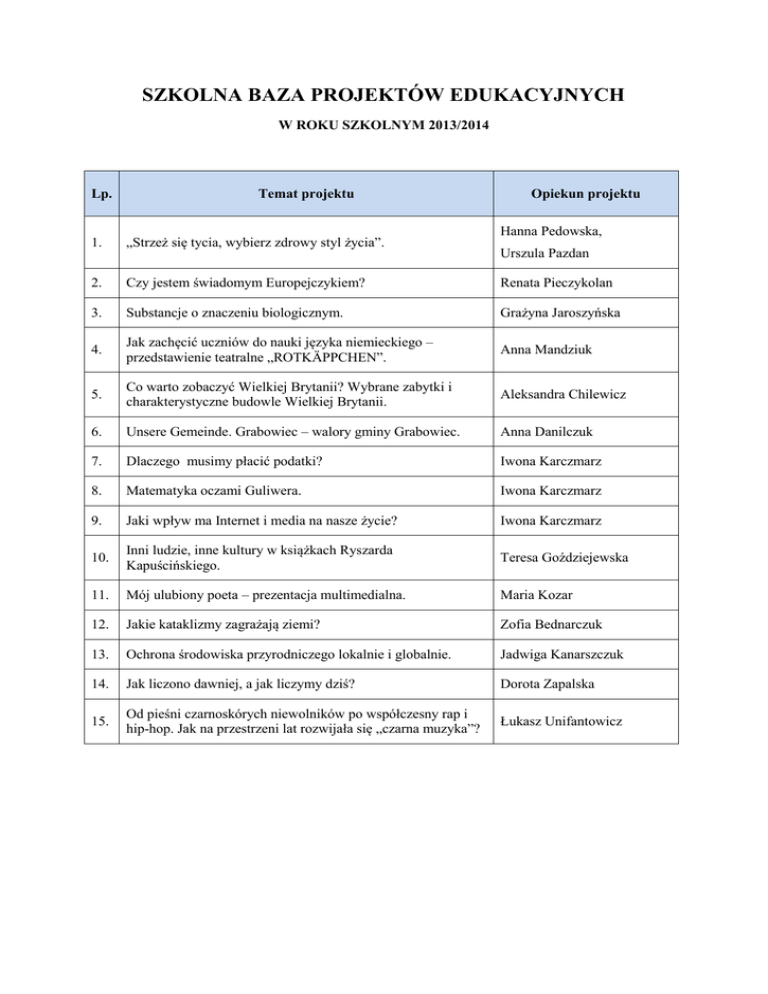 SZKOLNA BAZA PROJEKTÓW EDUKACYJNYCH W ROKU SZKOLNYM 2013/2014 Lp. Temat projektu Opiekun projektu Hanna Pedowska, 1. „Strzeż się tycia, wybierz zdrowy styl życia”. 2. Czy jestem świadomym Europejczykiem? Renata Pieczykolan 3. Substancje o znaczeniu biologicznym. Grażyna Jaroszyńska 4. Jak zachęcić uczniów do nauki języka niemieckiego – przedstawienie teatralne „ROTKÄPPCHEN”. Anna Mandziuk 5. Co warto zobaczyć Wielkiej Brytanii? Wybrane zabytki i charakterystyczne budowle Wielkiej Brytanii. Aleksandra Chilewicz 6. Unsere Gemeinde. Grabowiec – walory gminy Grabowiec. Anna Danilczuk 7. Dlaczego musimy płacić podatki? Iwona Karczmarz 8. Matematyka oczami Guliwera. Iwona Karczmarz 9. Jaki wpływ ma Internet i media na nasze życie? Iwona Karczmarz 10. Inni ludzie, inne kultury w książkach Ryszarda Kapuścińskiego. Teresa Goździejewska 11. Mój ulubiony poeta – prezentacja multimedialna. Maria Kozar 12. Jakie kataklizmy zagrażają ziemi? Zofia Bednarczuk 13. Ochrona środowiska przyrodniczego lokalnie i globalnie. Jadwiga Kanarszczuk 14. Jak liczono dawniej, a jak liczymy dziś? Dorota Zapalska 15. Od pieśni czarnoskórych niewolników po współczesny rap i hip-hop. Jak na przestrzeni lat rozwijała się „czarna muzyka”? Łukasz Unifantowicz Urszula Pazdan